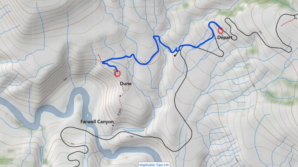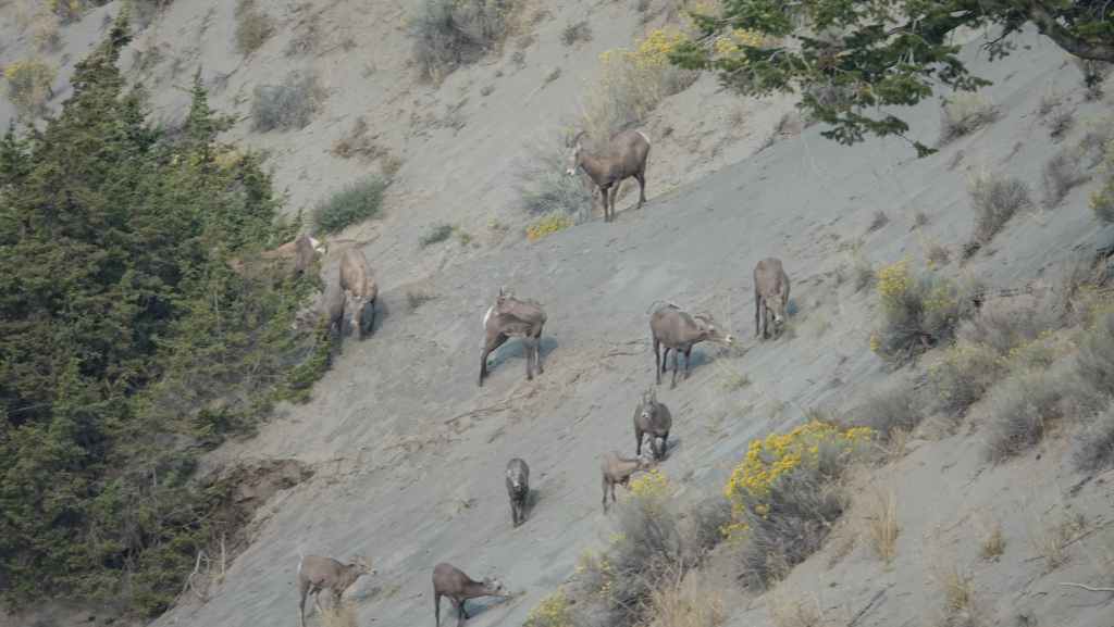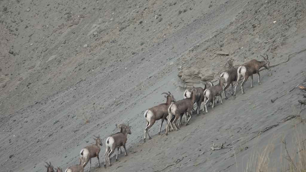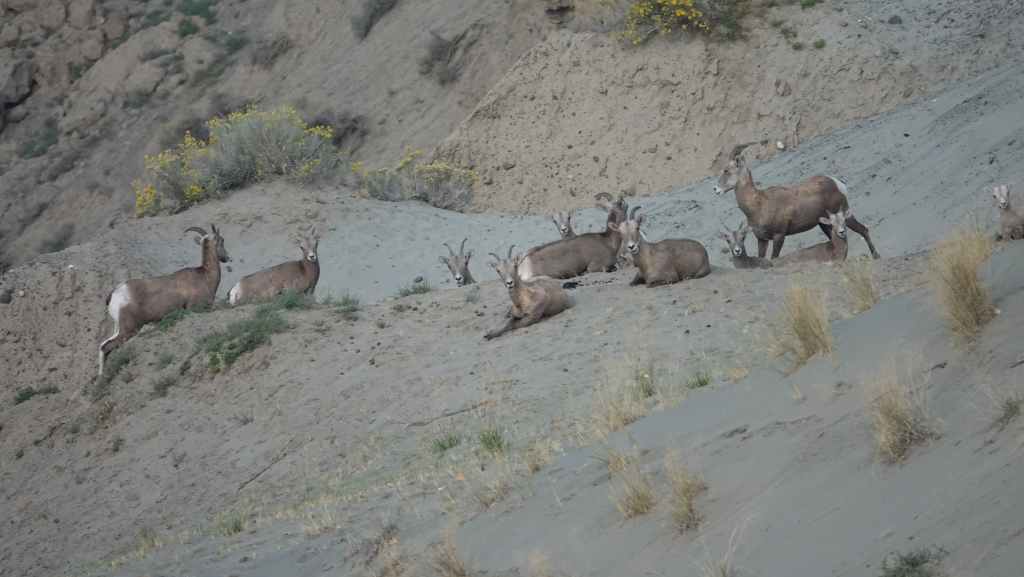 On a prévu une petite rando avec pour but la dune qui domine le canyon (6,8 km et + 320 m de dénivelé A/R). D’abord par la piste 4×4, on continue sur un petit sentier au milieu de la « pampa » aride. La côte finale sur la dune est plutôt raide mais l’effort en vaut la chandelle. On domine le Farwell Canyon et on a la chance d’observer une harde de mouflons à quelques centaines de mètres en contre-bas. La paysage est vraiment somptueux, peut-être le plus impressionnant de ces 12 premiers jours.