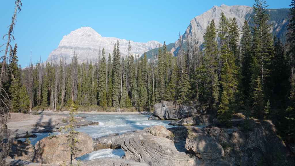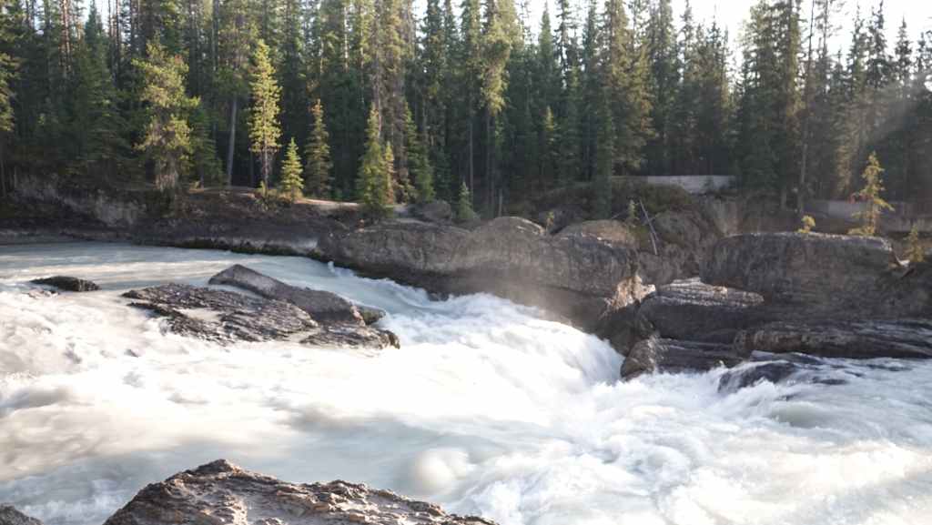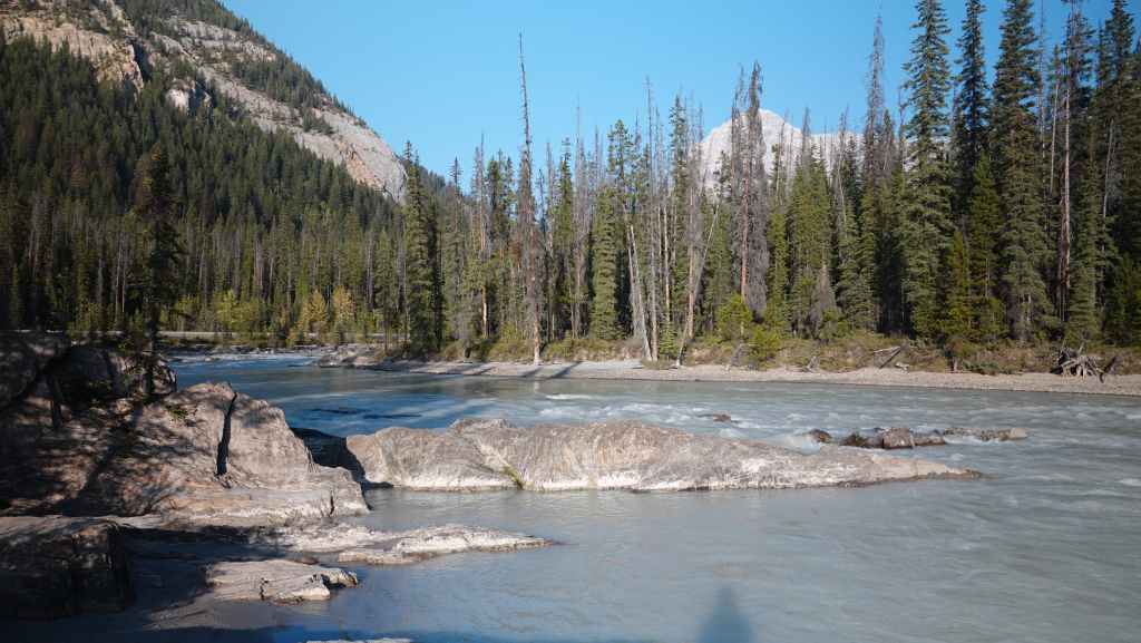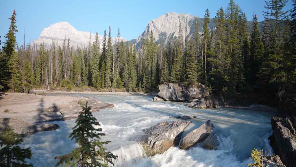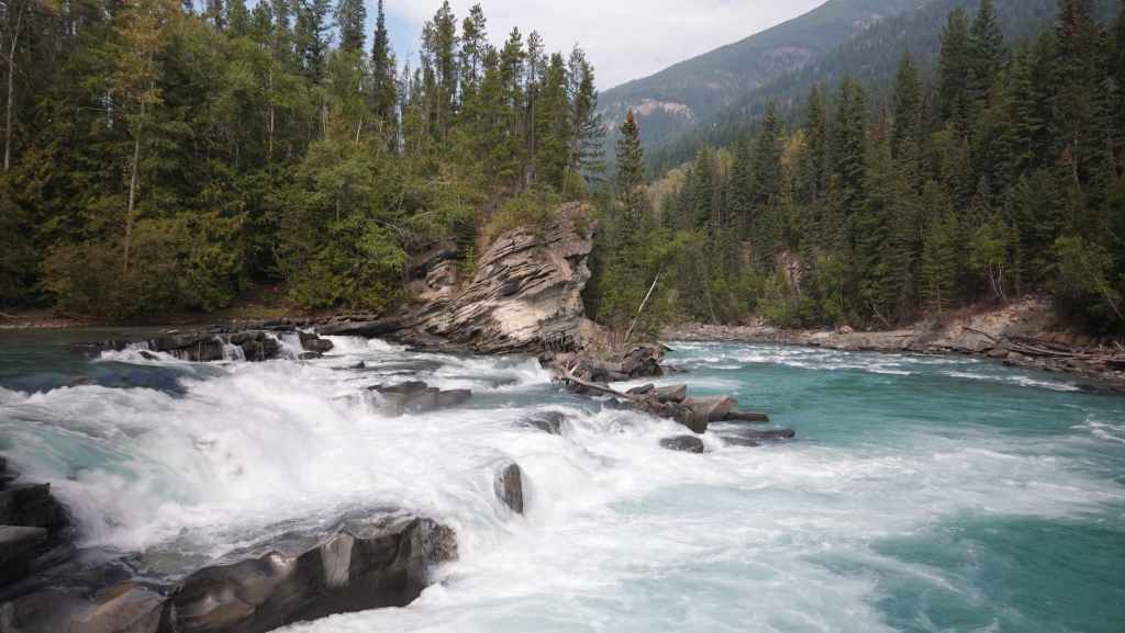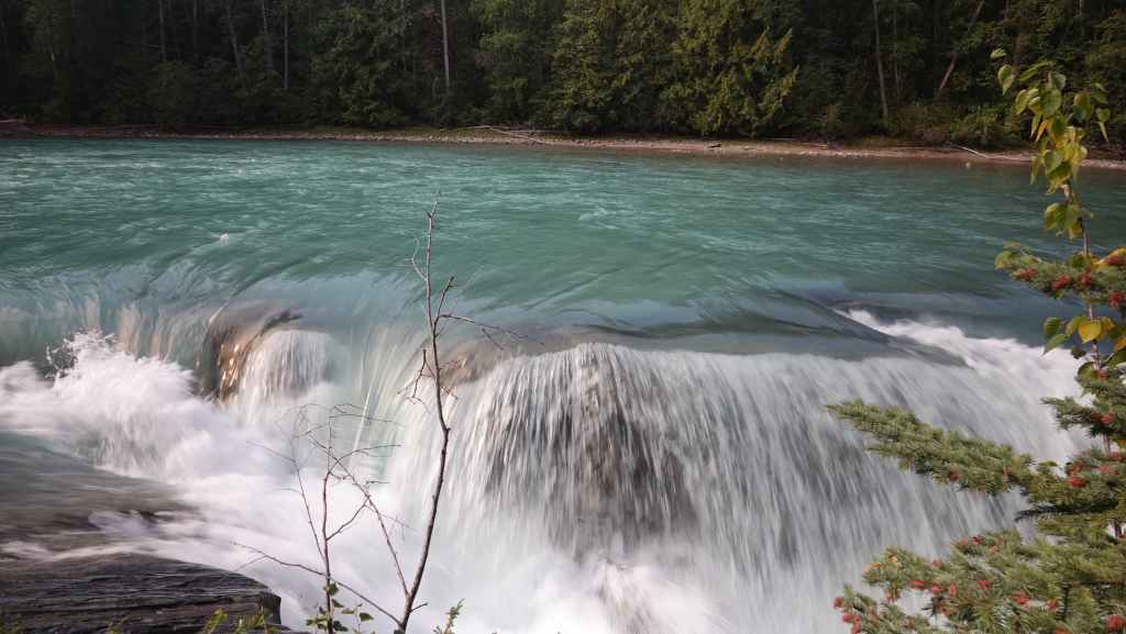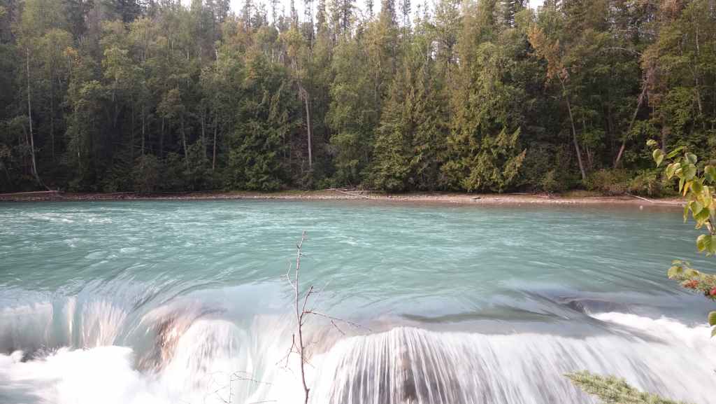 Toujours par la route 5, nous repartons complètement vers le nord jusqu’au village de Tête Jaune Cache où nous reprenons la route 16 dite Yellow Head Highway vers l’est. On profite de s’arrêter aux Rearguard Falls situées en bord de route pour faire une pause. Il s’agit d’un gros rapide sur la rivière Fraser toute bleue.