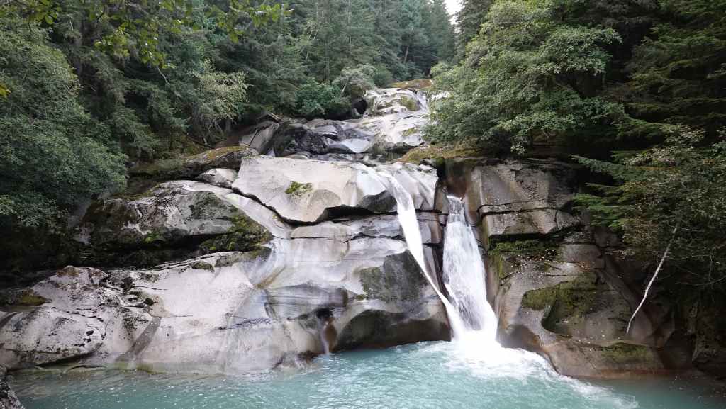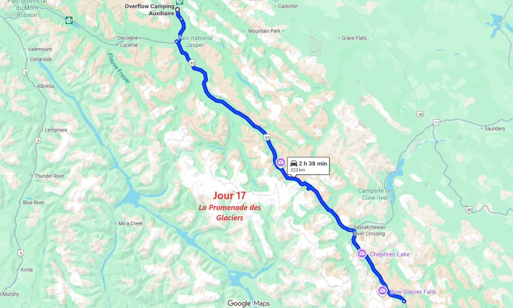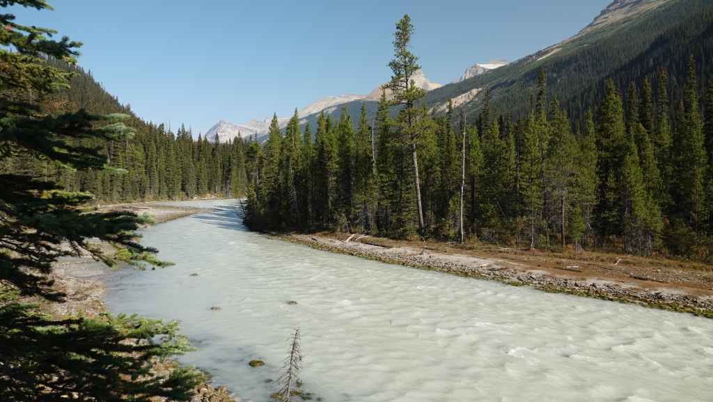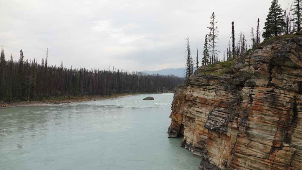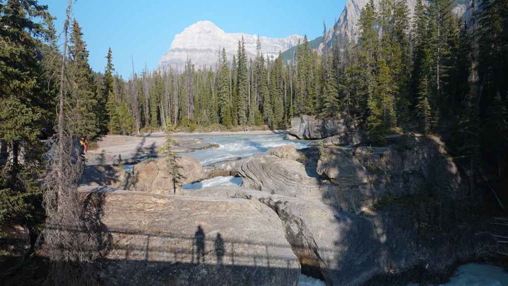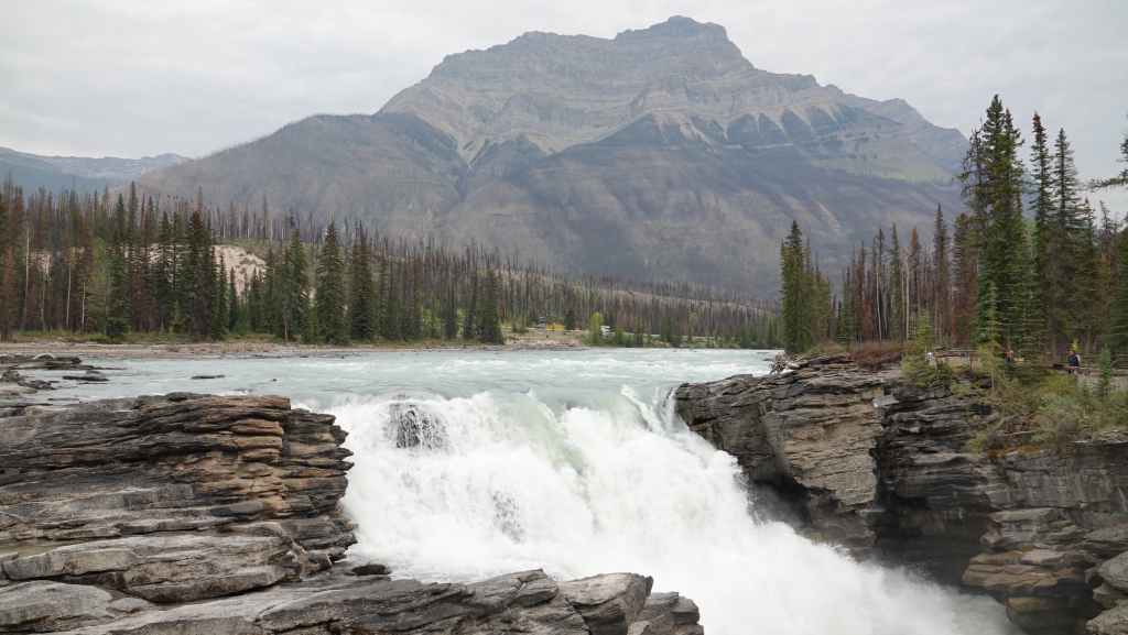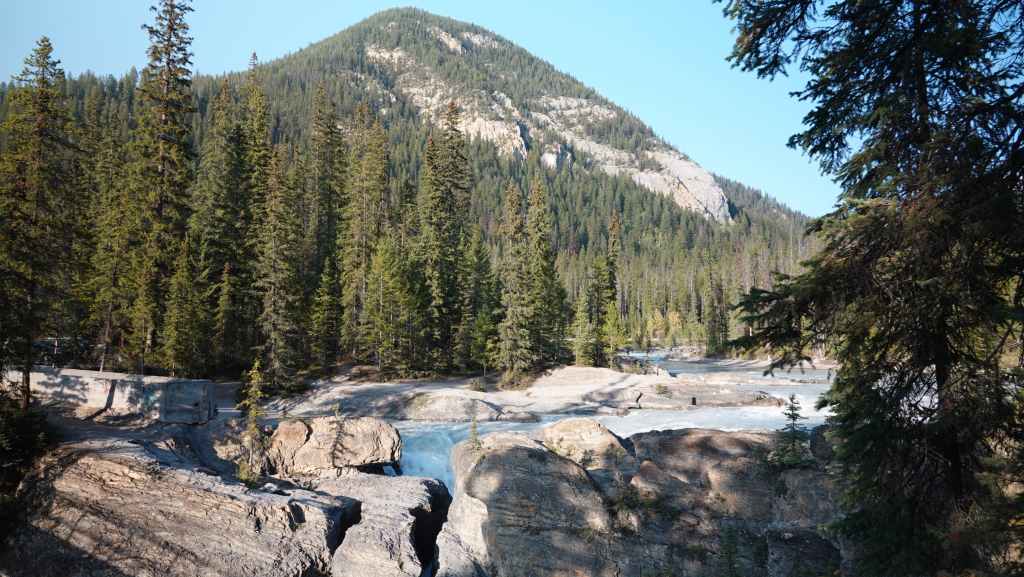 Toujours par la route 5, nous repartons complètement vers le nord jusqu’au village de Tête Jaune Cache où nous reprenons la route 16 dite Yellow Head Highway vers l’est. On profite de s’arrêter aux Rearguard Falls situées en bord de route pour faire une pause. Il s’agit d’un gros rapide sur la rivière Fraser toute bleue.