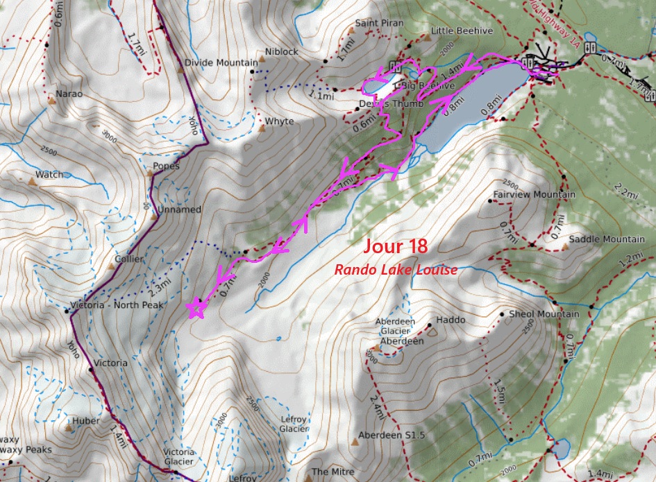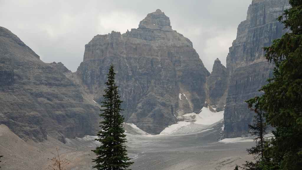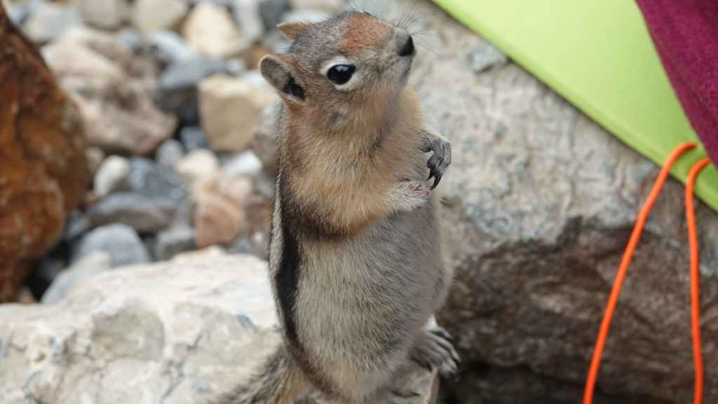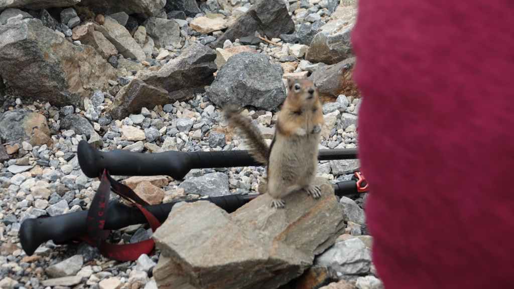 Nous voilà donc partis vers le lac où l’on retrouve déjà pas de touristes venus faire LA photo. On longe le réputé hôtel Fairmont puis on emprunte un sentier assez large qui monte vers le lac Miroir puis vers le lac Agnès. On grimpe ensuite au Big Beehive, belvédère sur le lac Louise. Pas mal de randonneurs et quelques C’est ici que nous rencontrons un jeune couple de français, avec qui, nous allons randonner jusqu’au déjeuner, vers la Plaine des 6 glaciers. De petits culottés tentent de fouiller nos sacs à la recherche de nourriture : ce sont les tamias rayés. Nos chemins se séparent ensuite. Nous continuons en direction de la Tea House, où Sylvie m’attend pendant que je file tout au bout du sentier, au pied des hautes montagnes et des glaciers. Je rencontre en cours de route 2 marmottes, un peu différentes des nôtres.