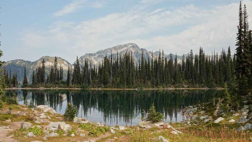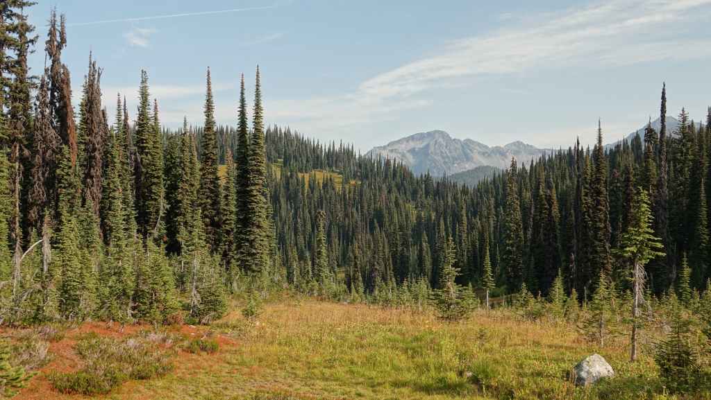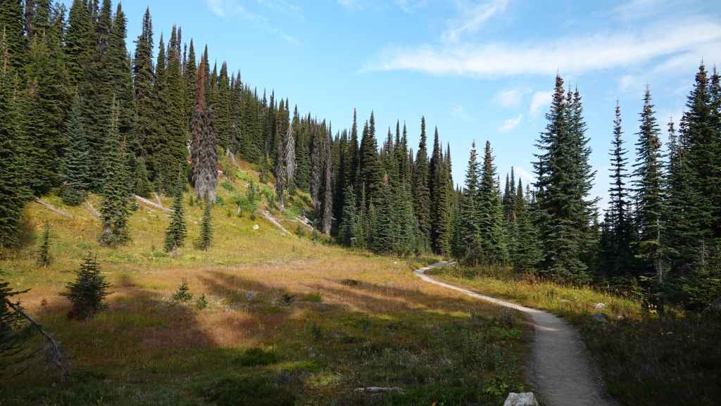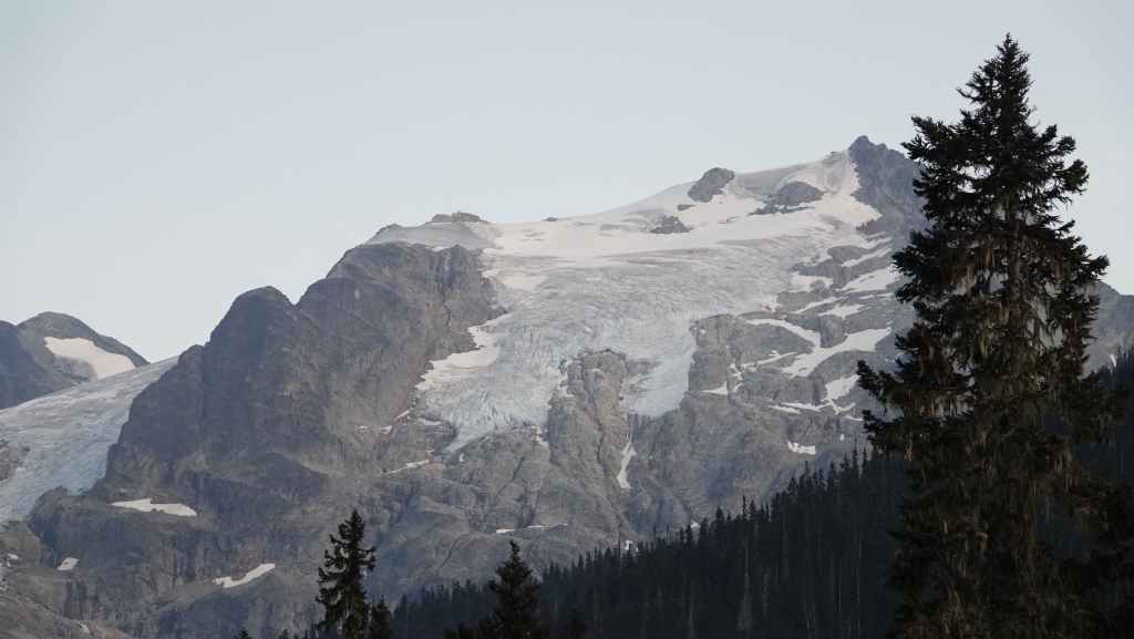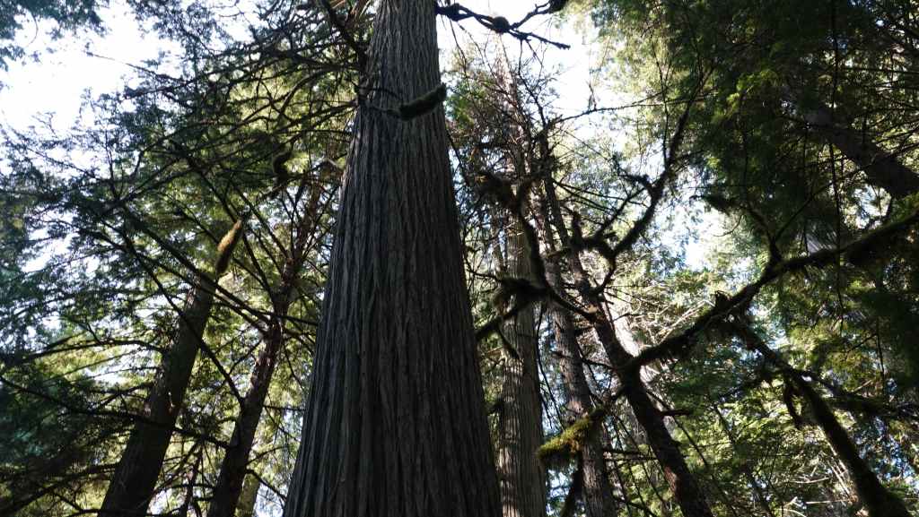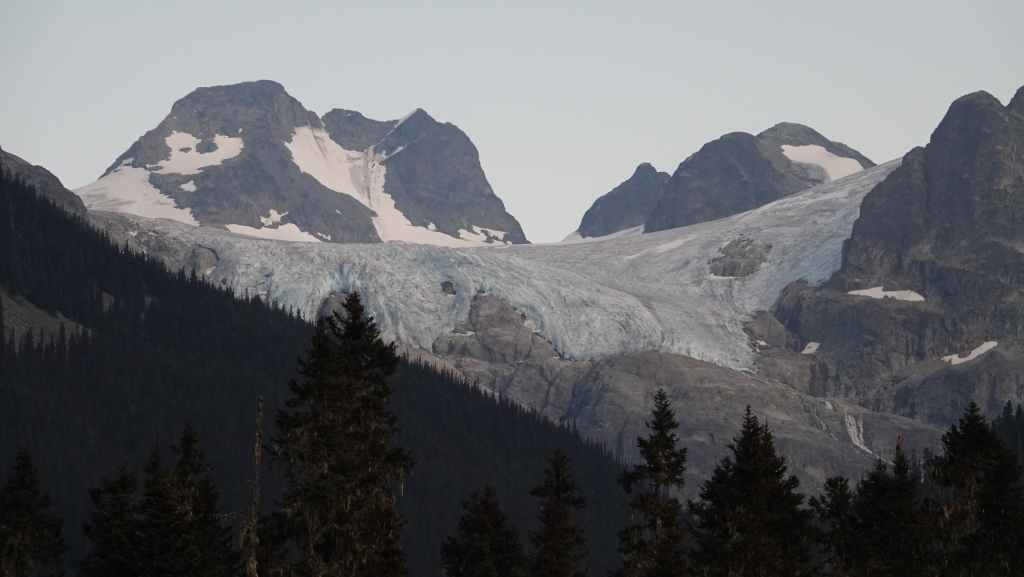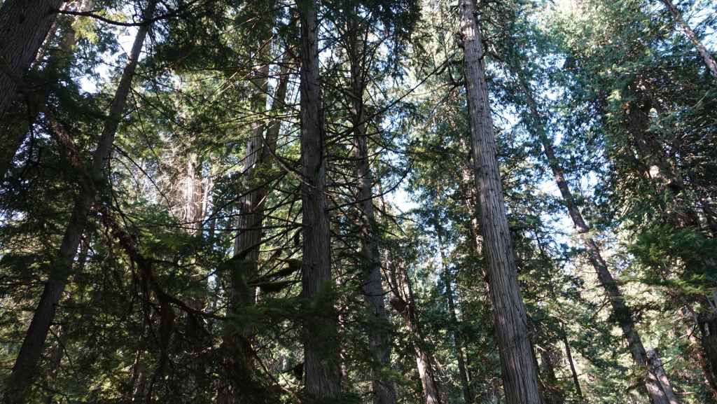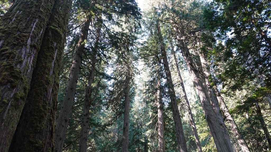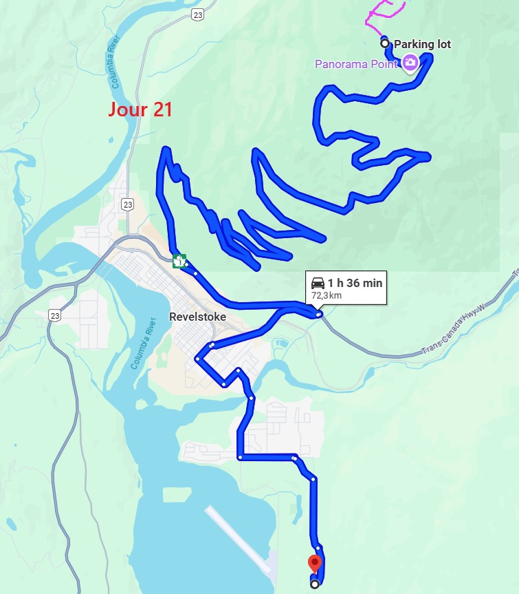 C’est aujourd’hui une sorte de journée de transition avec une patinée consacrée à de la route pour rejoindre la ville de Revelstoke. Seulement 180 km à faire mais de gros travaux d’élargissement en 2×2 voies. Du coup, on n’avance pas bien vite. On passe le col Rogers à 1331 m avec de chaque côté des glaciers. Puis on redescend vers notre point de chute. Nous parcourons un court sentier au milieu d’impressionnants cèdres rouges