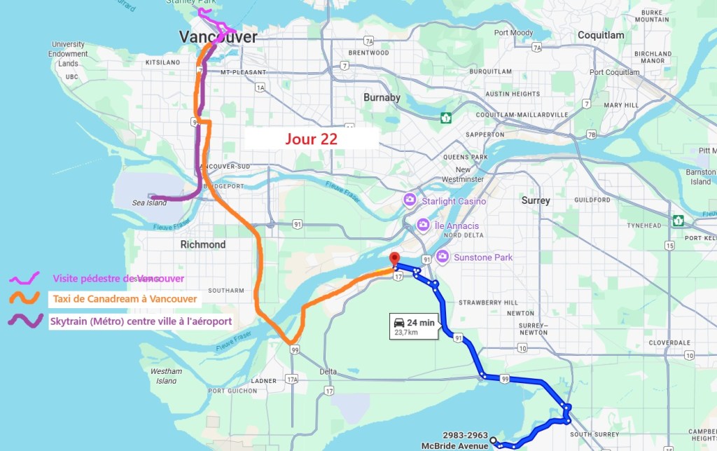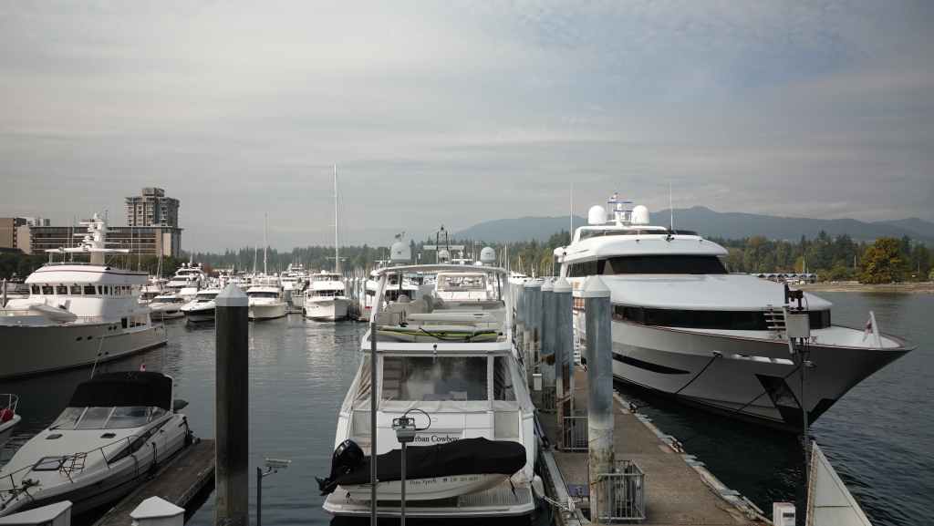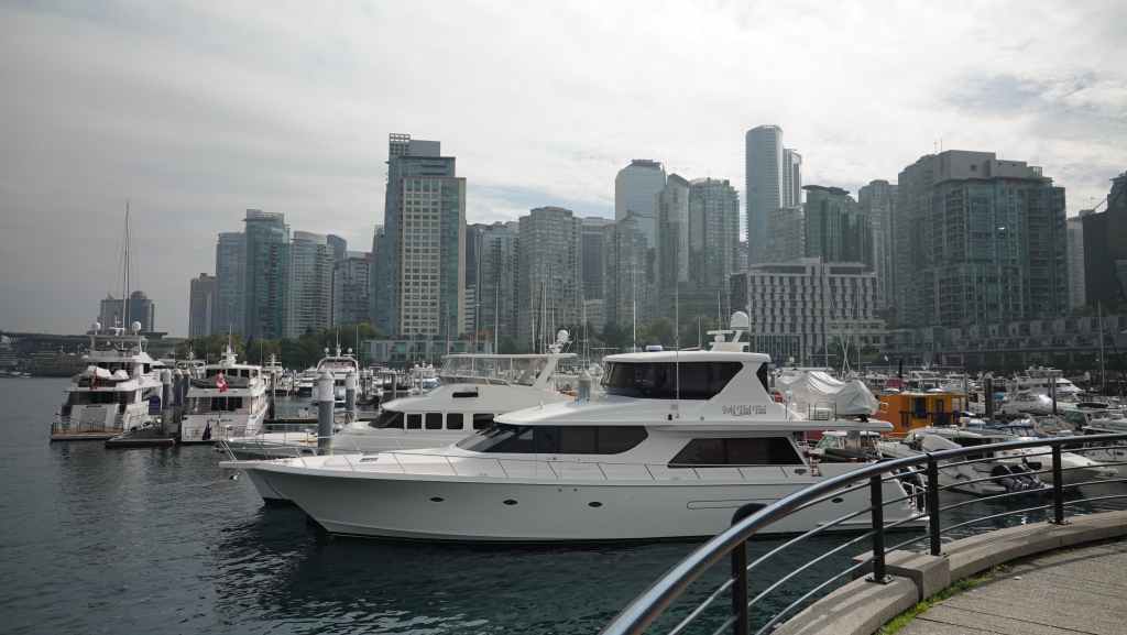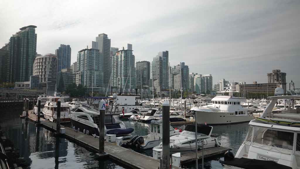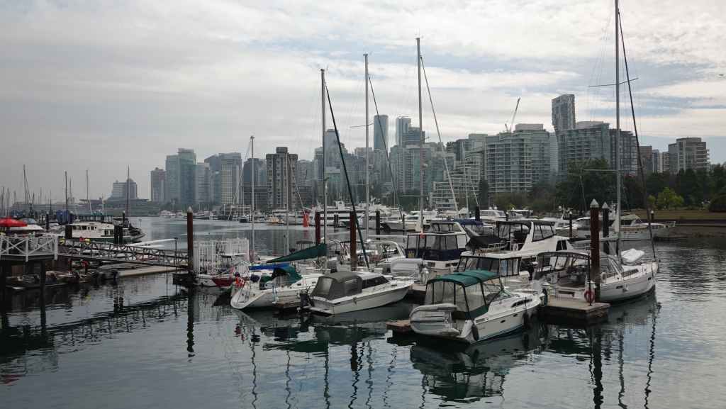 Et non repartons en direction du gigantesque port de plaisance, où des habitations flottantes se mélangent aux yachts plus ou moins gros. Malgré le monde, cette promenade reste assez calme. Nous faisons le tout du port jusqu’à Hallelujah Point. Puis c’est le retour jusqu’au magasin qui sert de consigne à bagages. Nous sommes sur les rotules en y arrivant. Mais il nous faut repartir pour atteindre, cette fois-ci avec nos valises, la station de métro Vancouver City Centre, heureusement située à quelques centaines de mètres.