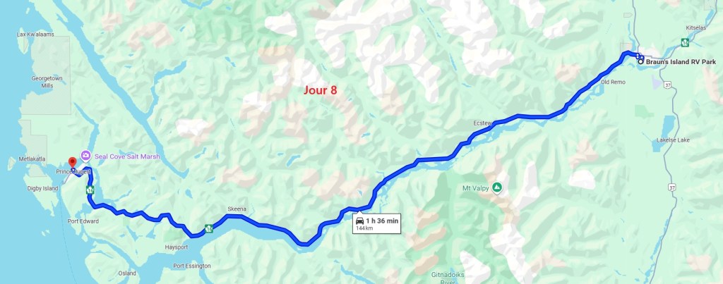 On récupère la 16 pour passer les villages de Vanderhoof, Fort Fraser, Burns Lake, Houston et Hazelton où l’on s’arrête « Visitor Centre », histoire de glaner quelques infos sur ces villages amérindiens. On traverse également Kitwanga et on espère trouver un peu plus loin un camping des parcs régionaux. Mais le seul disponible est fermé et malgré nos recherches, nous ne trouvons pas d’endroit sauvage où dormir. En effet, tous les chemins mènent à des propriétés. Nous nous résignons donc à aller jusqu’à Terrace, au camping RV Braun’s Island, RV signifiant Recreative Vehicle, soit véhicule récréatif.