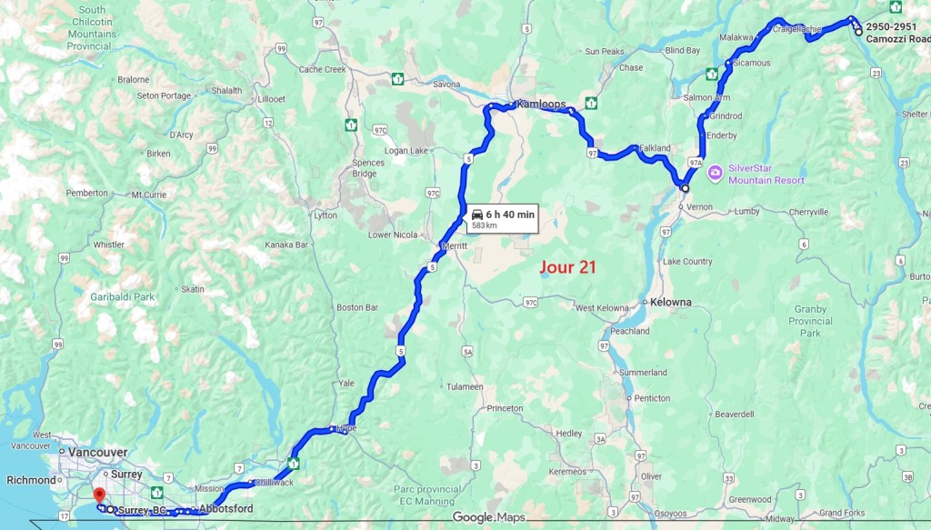 Eh oui, il fallait bien que ça se termine un jour, alors on reprend le chemin de Vancouver. Il s’agit de notre plus grosse étape routière avec 545 km sans grand intérêt. Nous profitons tout de même d’un joli lac, le temps du déjeuner. Nous traversons encore une zone d’incendies de forêt même s’il ne reste que des fumées.