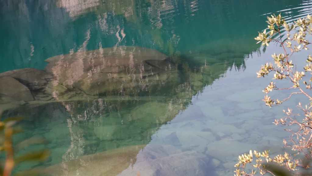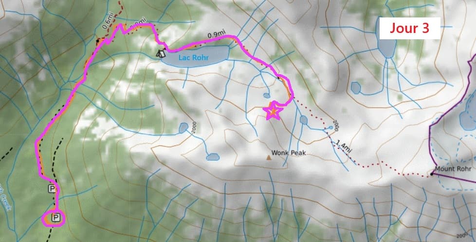 On grimpe alors au milieu de gros blocs de rochers sur un sentier étroit et boueux. On arrive enfin au bord du lac Rohr où des campeurs commencent à remballer leurs tentes. On est enfin sous le ciel bleu qui se reflète dans les eaux turquoises du lac. On n’a pas marché énormément mais la fatigue du décallage horaire se fait sentir. Malgré tout, on décide le monter plus haut au bout du lac. Au départ, on avait émis l’hypothèse de grimper le mont Rohr mais on en restera là ! Le paysage est déjà sublime et on en profite pour pique-niquer ici.