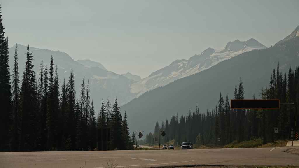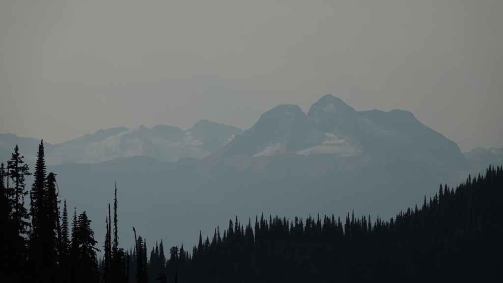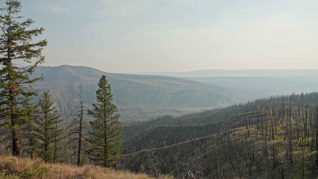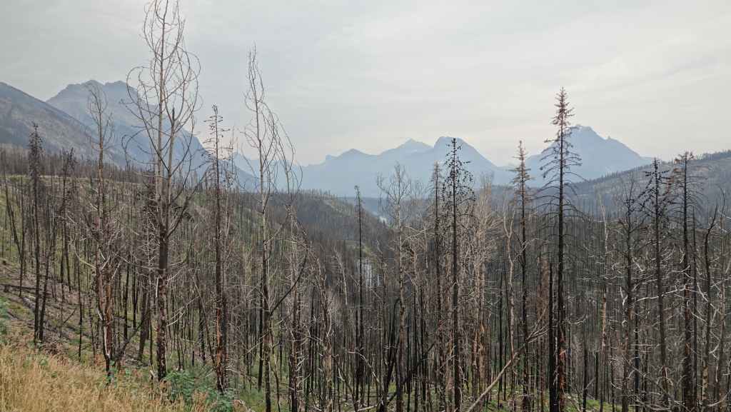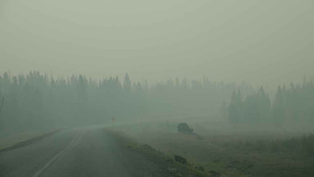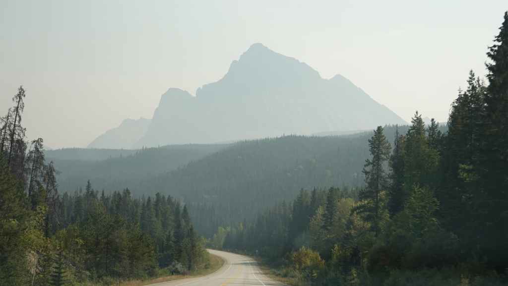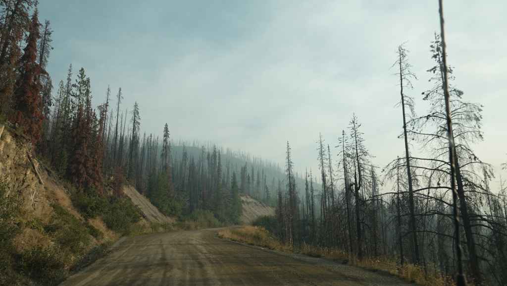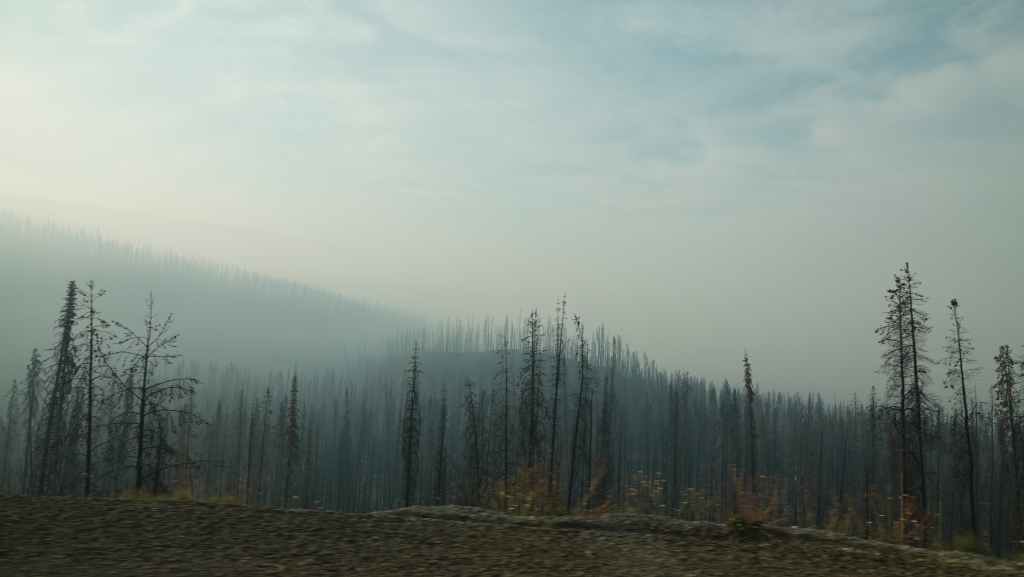On se lève à 6h00 pour espérer une dernière fois voir des ours mais toujours rien. Du coup vers 7h30, on reprend la route 20 vers l’est en direction du col Heckman pour randonner vers le lac McCauley. Rapidement, la route 20 se transforme en une bonne piste plus ou moins large (c’était prévu) qui serpente dans la montagne, avec quelques à pics vertigineux et plus on on grimpe, plus l’ambiance bleuit : nous sommes rattrapés par les fumées des incendies que nous annonçait le capitaine du ferry. L’air devient irrespirable et il n’est plus question de randonner dans ces conditions. Alors il nous faut continuer rapidement, au travers de forêts déjà calcinées, car nous avons l’information que des convois sont formés pour traverser la zone de feux entre 6h00 et 9h00 et il est déjà 8h30 et on a encore pas mal de kilomètres à faire…