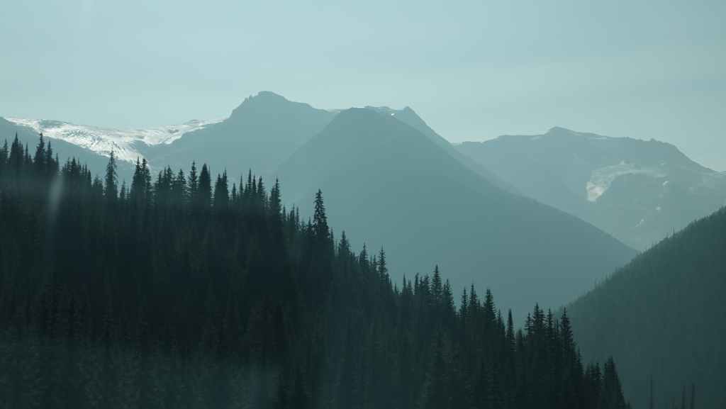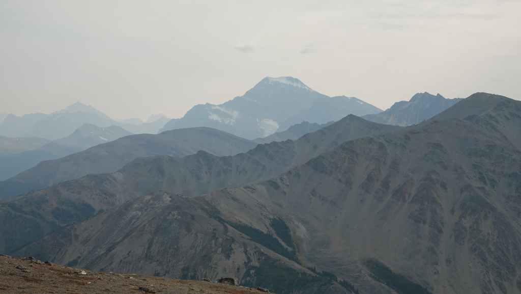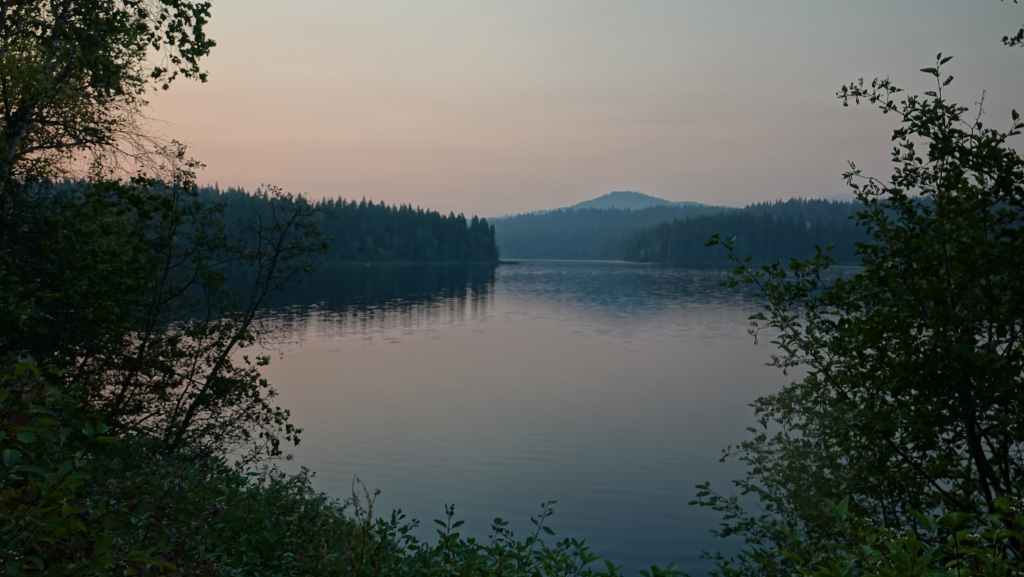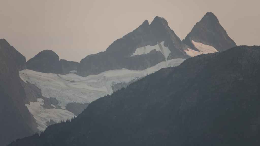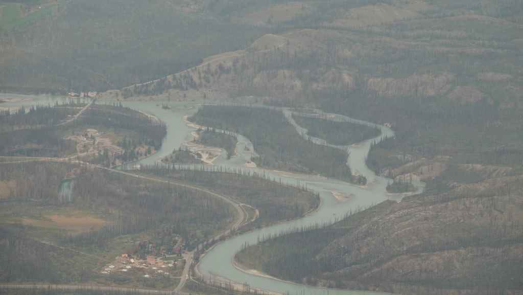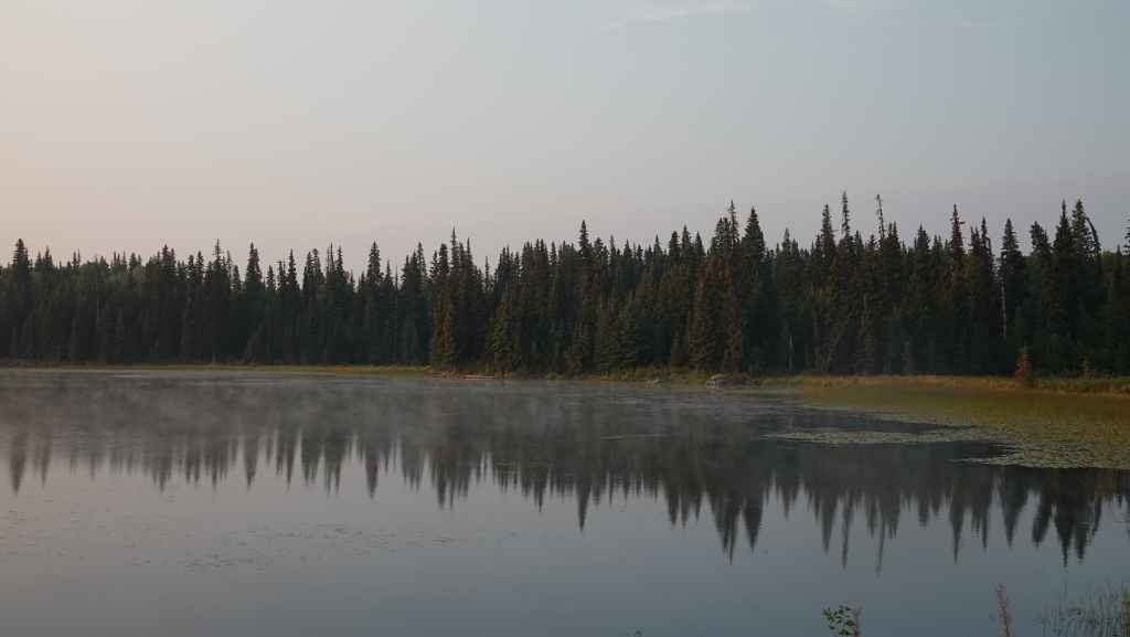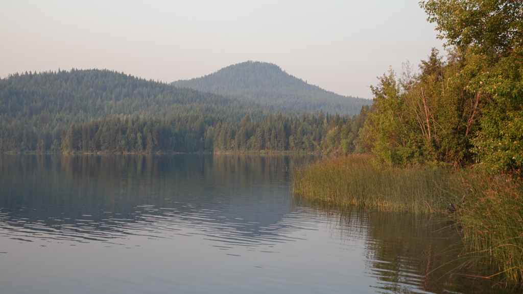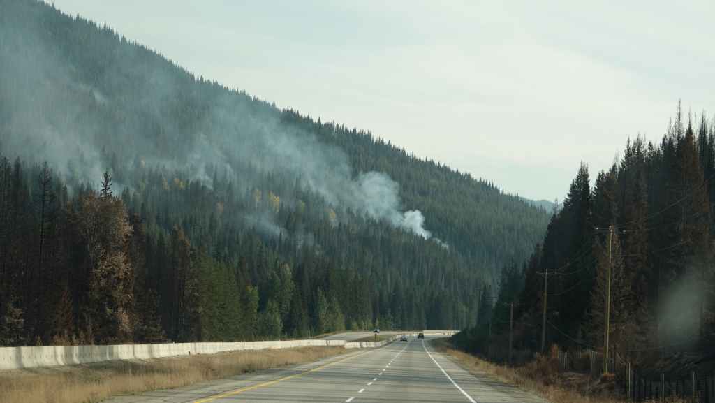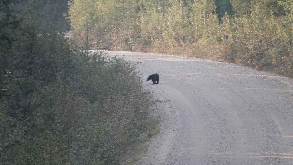 On se lève à 6h00 pour espérer une dernière fois voir des ours mais toujours rien. Du coup vers 7h30, on reprend la route 20 vers l’est en direction du col Heckman pour randonner vers le lac McCauley. Rapidement, la route 20 se transforme en une bonne piste plus ou moins large (c’était prévu) qui serpente dans la montagne, avec quelques à pics vertigineux et plus on on grimpe, plus l’ambiance bleuit : nous sommes rattrapés par les fumées des incendies que nous annonçait le capitaine du ferry. L’air devient irrespirable et il n’est plus question de randonner dans ces conditions. Alors il nous faut continuer rapidement, au travers de forêts déjà calcinées, car nous avons l’information que des convois sont formés pour traverser la zone de feux entre 6h00 et 9h00 et il est déjà 8h30 et on a encore pas mal de kilomètres à faire…