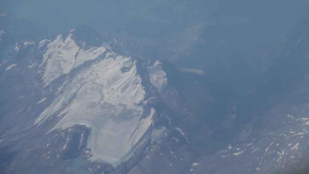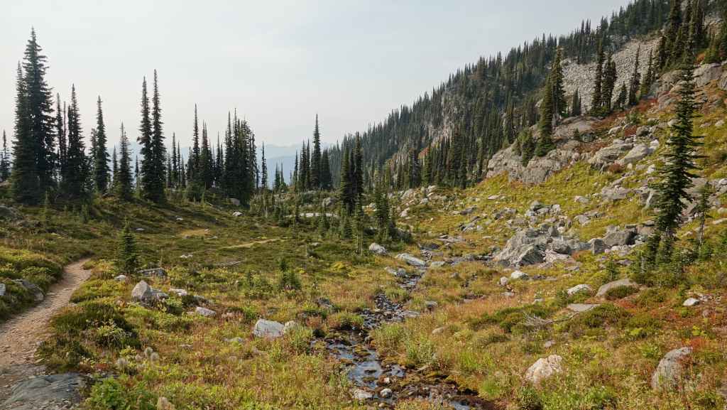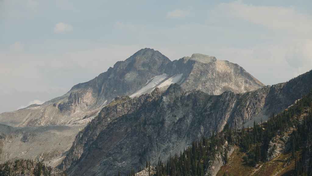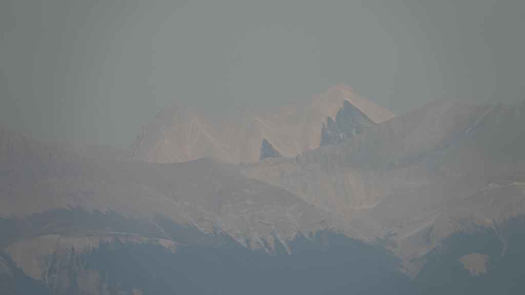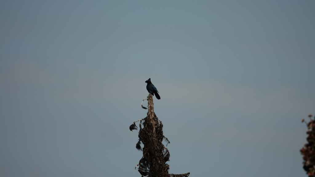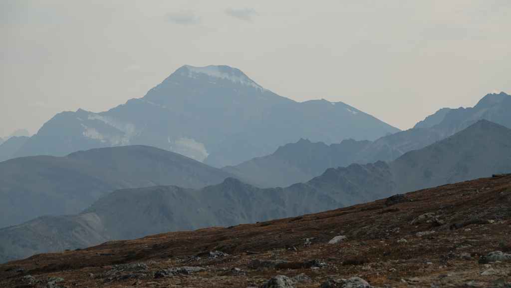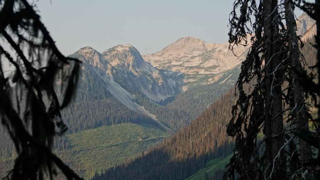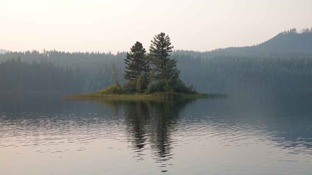 On se lève à 6h00 pour espérer une dernière fois voir des ours mais toujours rien. Du coup vers 7h30, on reprend la route 20 vers l’est en direction du col Heckman pour randonner vers le lac McCauley. Rapidement, la route 20 se transforme en une bonne piste plus ou moins large (c’était prévu) qui serpente dans la montagne, avec quelques à pics vertigineux et plus on on grimpe, plus l’ambiance bleuit : nous sommes rattrapés par les fumées des incendies que nous annonçait le capitaine du ferry. L’air devient irrespirable et il n’est plus question de randonner dans ces conditions. Alors il nous faut continuer rapidement, au travers de forêts déjà calcinées, car nous avons l’information que des convois sont formés pour traverser la zone de feux entre 6h00 et 9h00 et il est déjà 8h30 et on a encore pas mal de kilomètres à faire…