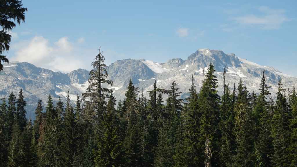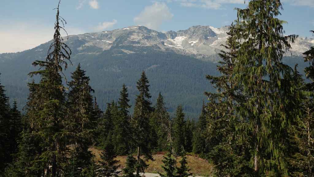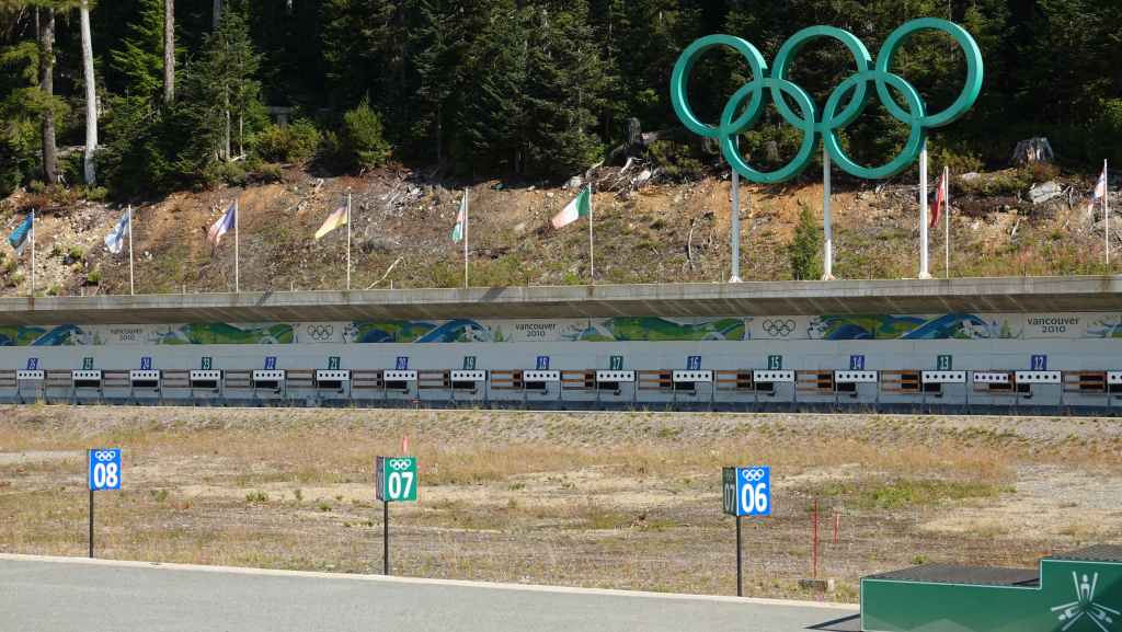 Dès que nous quittons le parking, nous prenons la route qui part vers le parc olypique de Whistler consacré au biathlon pour les JO de Vancouver 2010. Nous dégourdissons nos jambes dans les alentours et découvrons au loin des paysages de haute montagne.