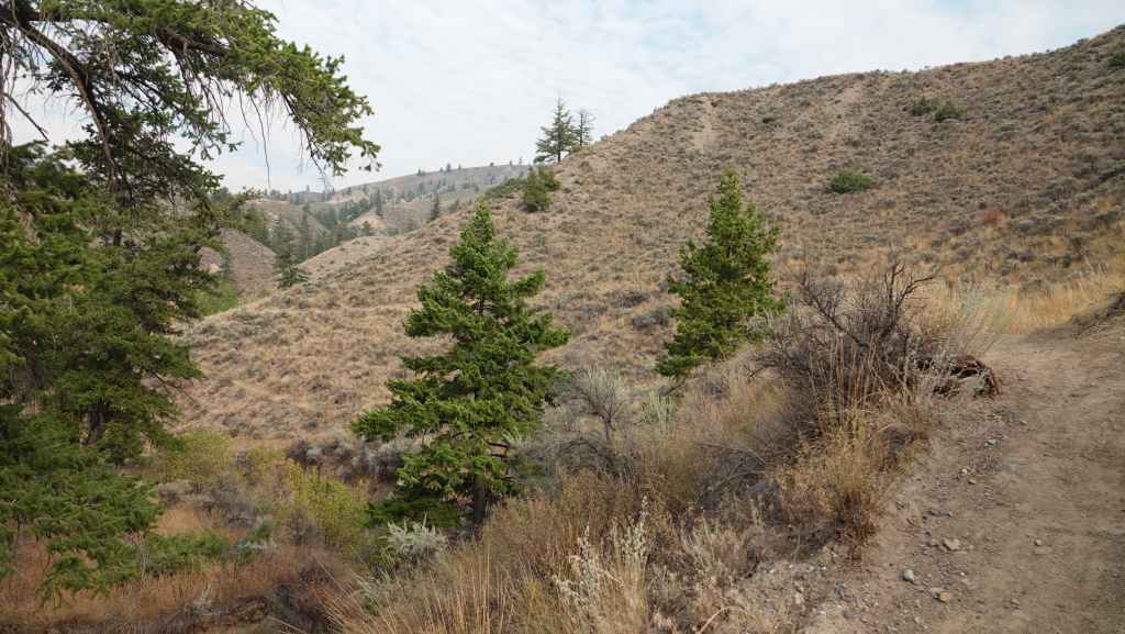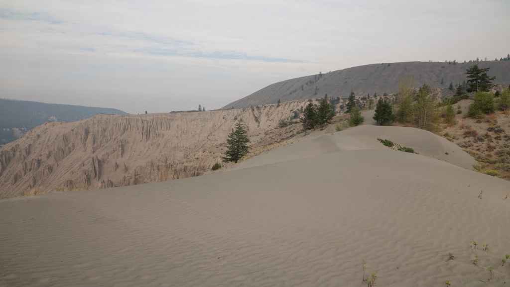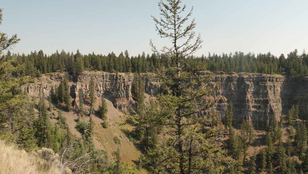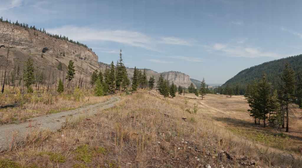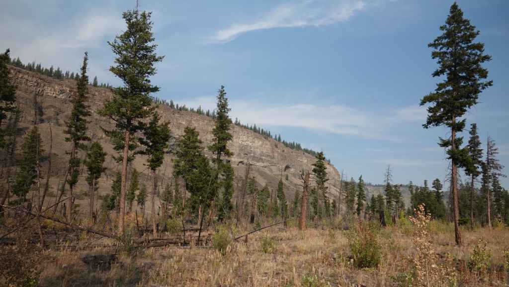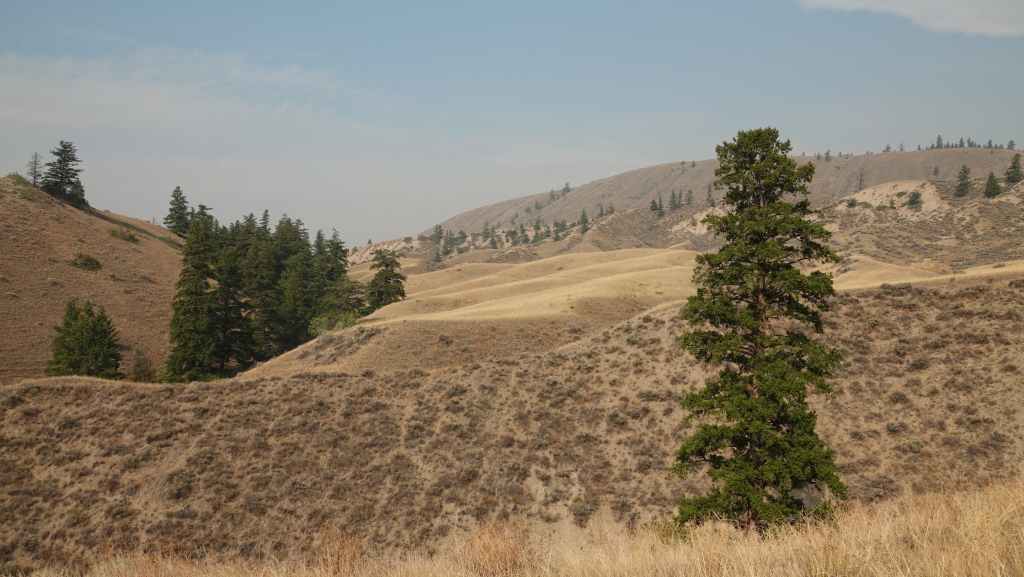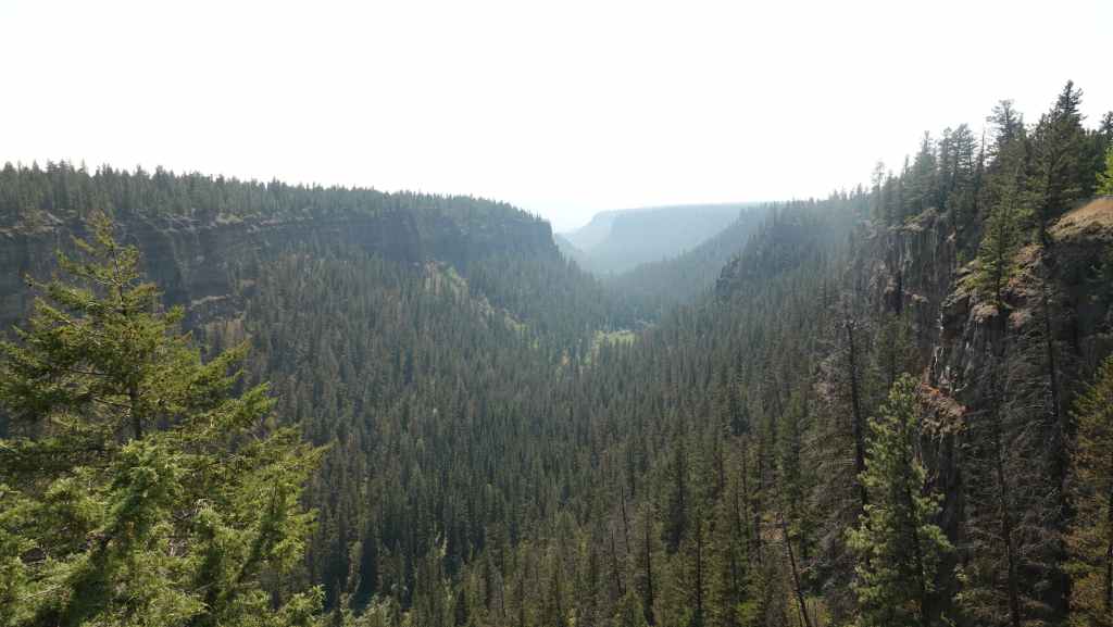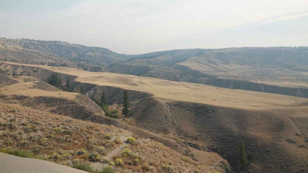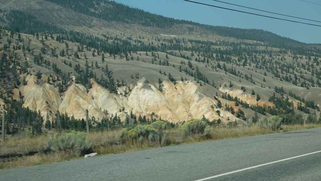 Nous prenons la direction du village des 1ères nations nommé Pavilion.où j’avais prévu de prendre une piste à flan de canyon, mais dès l’entrée du village, un panneau « visiteurs interdits » nous stoppe dans notre élan. Finalement, nous continuons donc sur la 99 jusqu’à rejoindre la route 97 qui vient du sud et que nous ne quitterons guère jusqu’à Prince George. Nous passons le village de Clinton, puis quittons pour quelques kilomètres, le temps du déjeuner la route principlale. Nous stoppons à la réserve écologique de Chasm où une curiosité géologique ici nous rappelle les reculées de notre bon Jura : une vallée fermée d’un bout, creusée dans le plateau. La chaleur toujours présente est ici à 34°C.