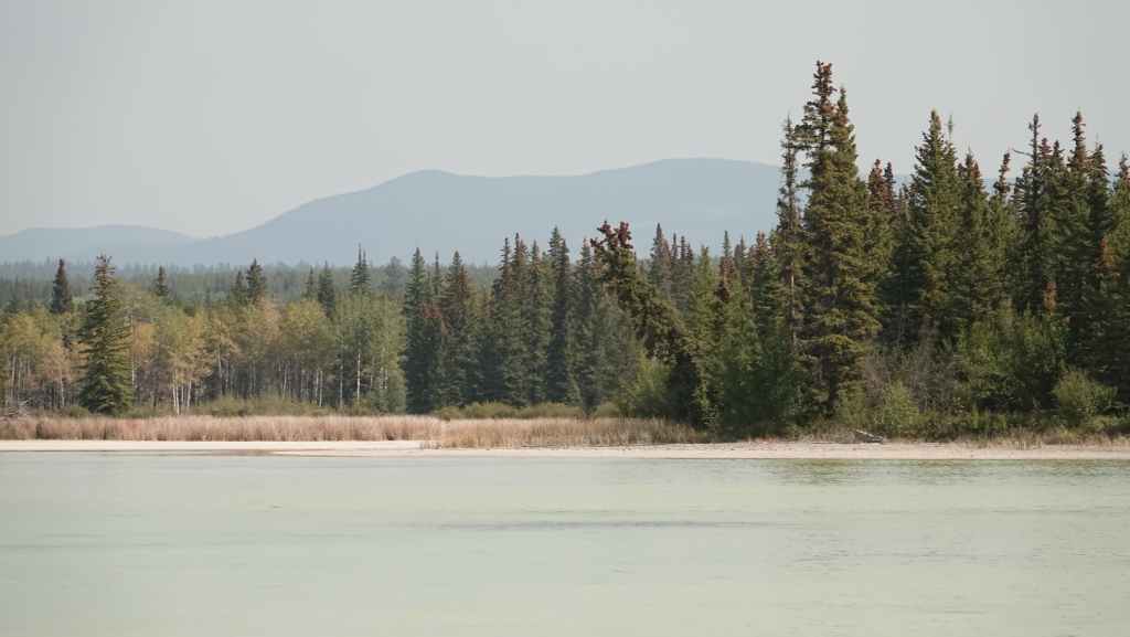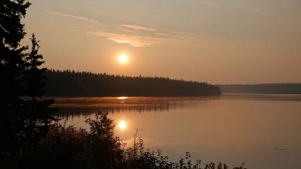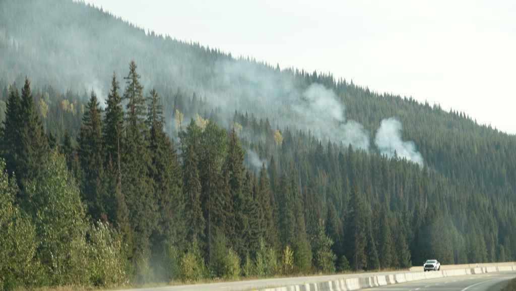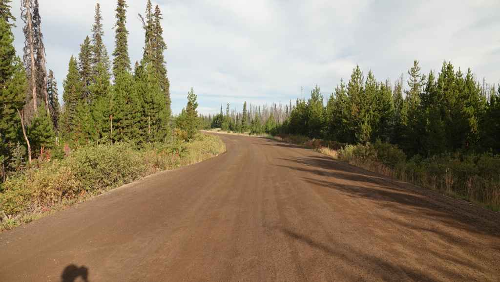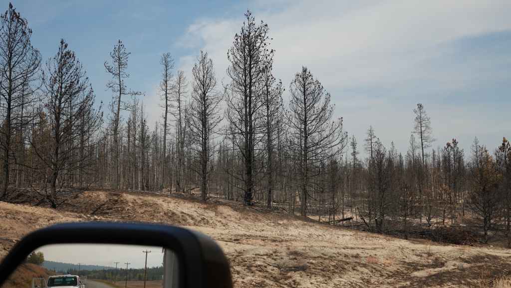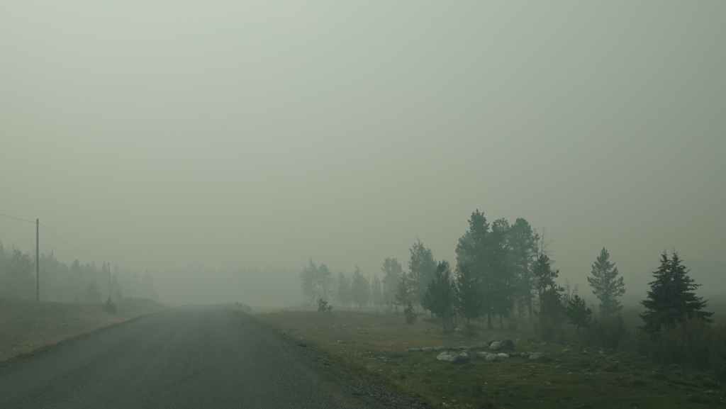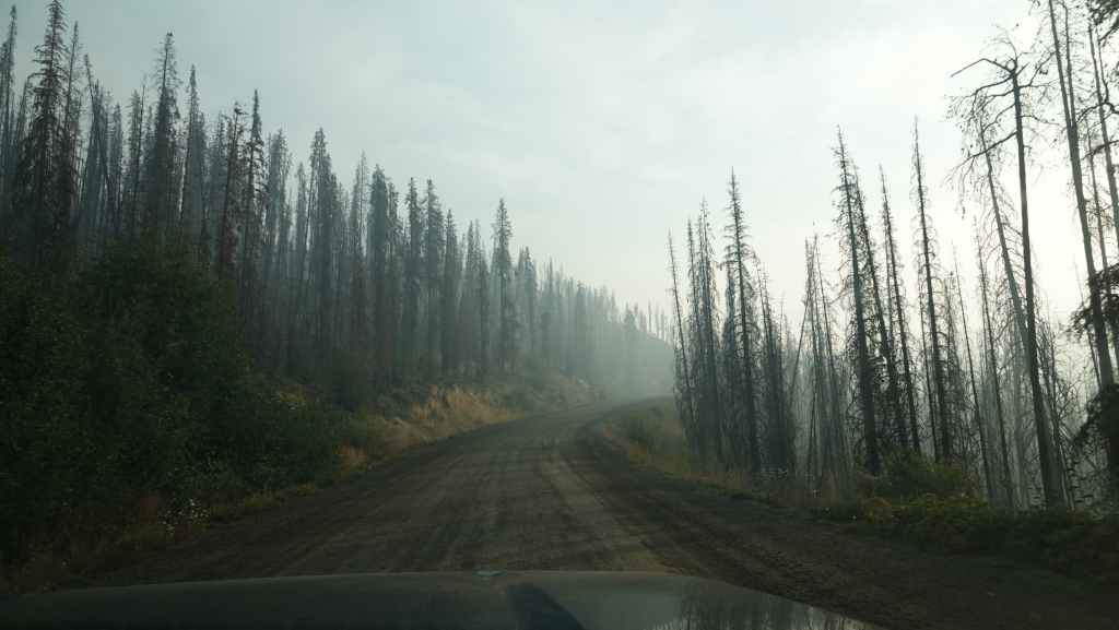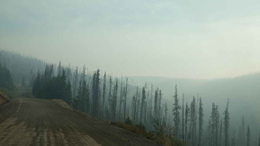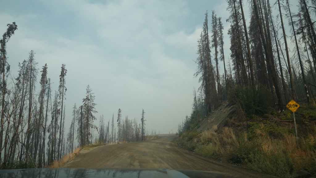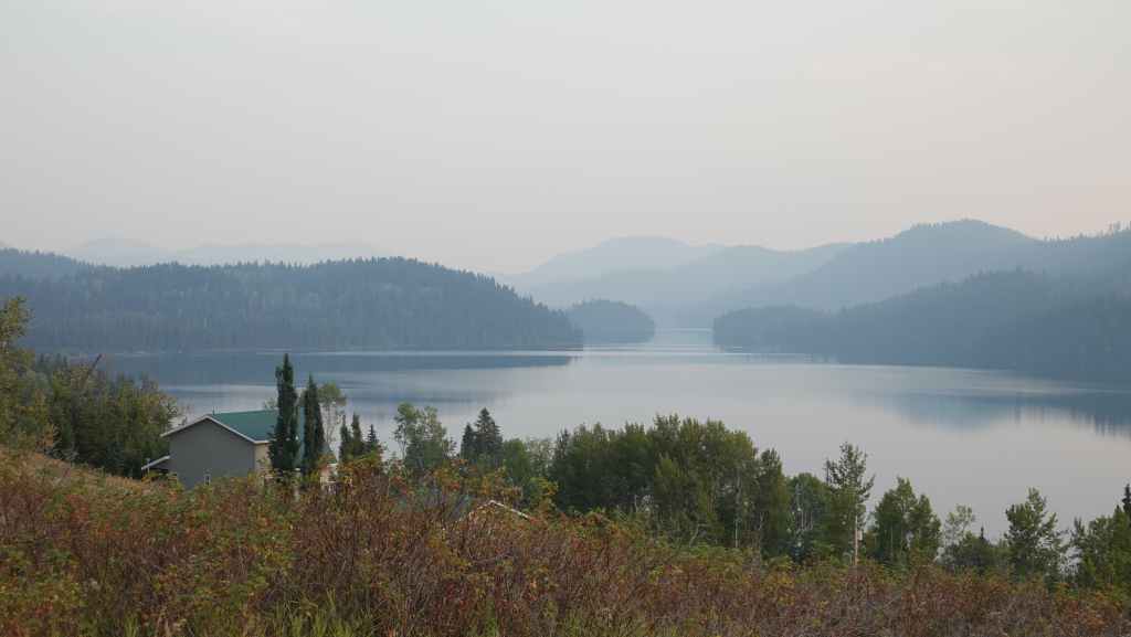 Aucune flammes en vue mais des fumerolles existent encore sur le côté gauche de la piste. Un peu plus loin, de nombreux ouvriers construisent une barrière coupe-feu : tronçonneuses, bulldozers et quelques véhicules de pompiers en sécurité. Après une dizaine de kilomètres en convoi, on continue seuls au milieu d’un brouillard épais bleu. On sort de cette zone « dangereuse » au village d’Anahim Lake où nous faisons le plein de gazole. Hormis la station / épicerie /bar, tout le village a été évacué. La route est redevenue goudron.