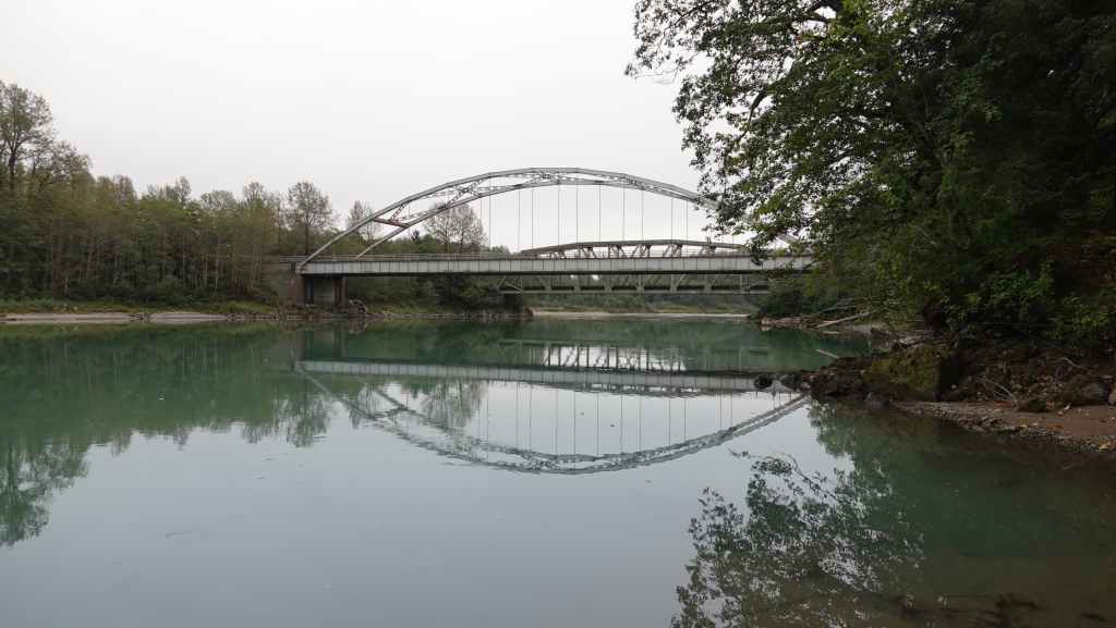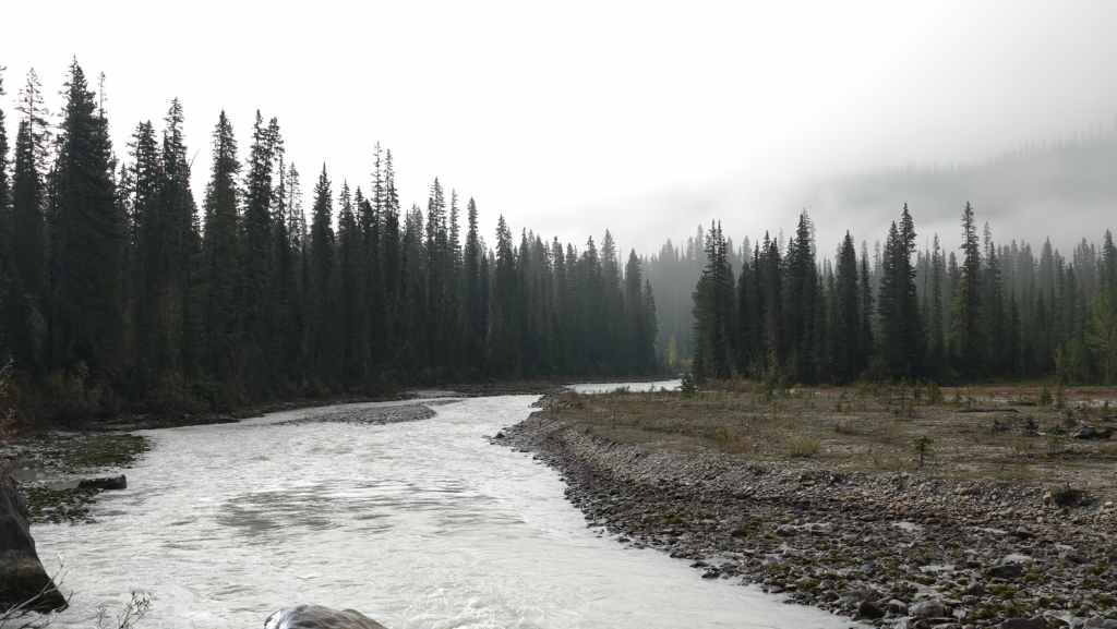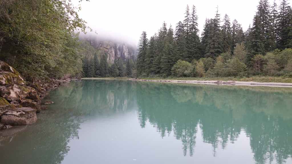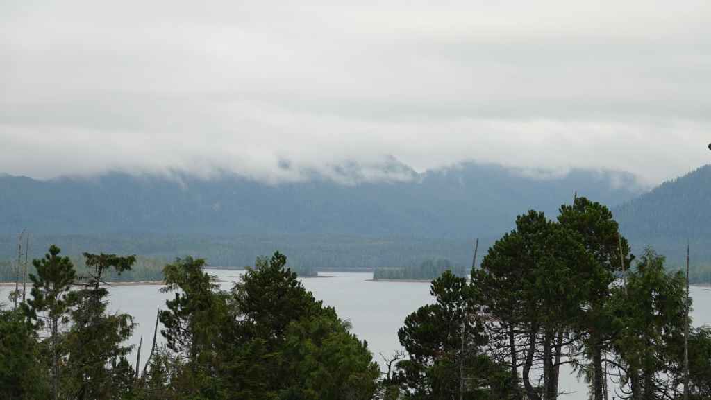 Dès le début du parcours, le brouillard enveloppe les montagnes situées de chaque côté de la route et de la ligne de chemin de fer. On longe le beau et large fleuve Skeena sans pouvoir s’arrêter pour faire quelques photos : pas de parking… On stoppe pour une petite pause dans le parc provincial de la rivière Kaniks, qui se jette dans la Skeena.