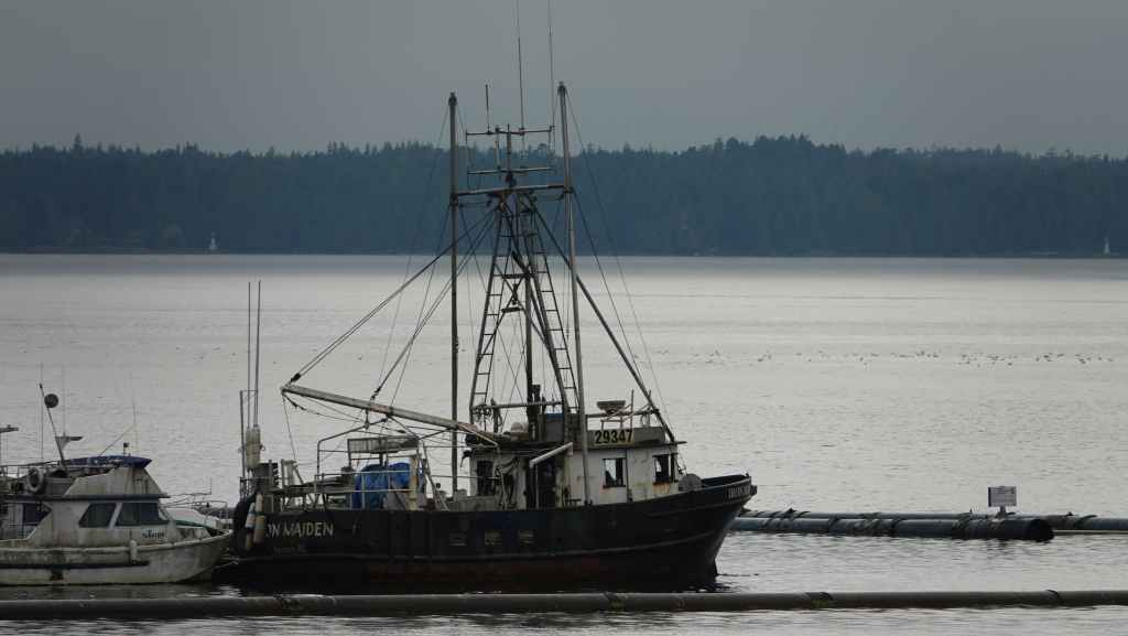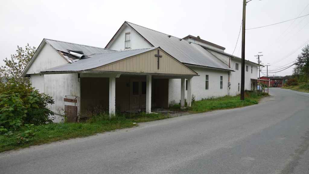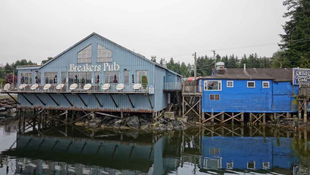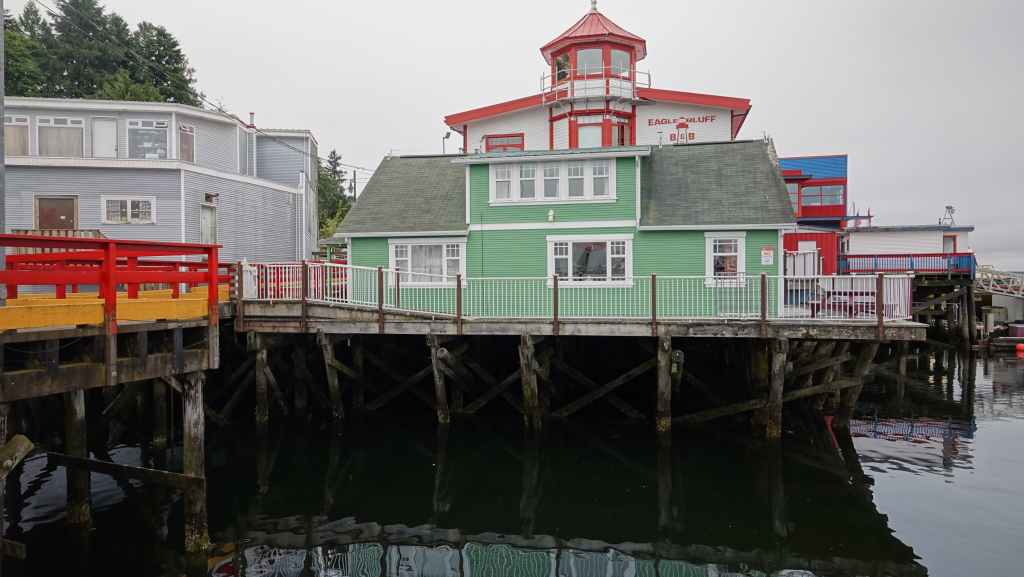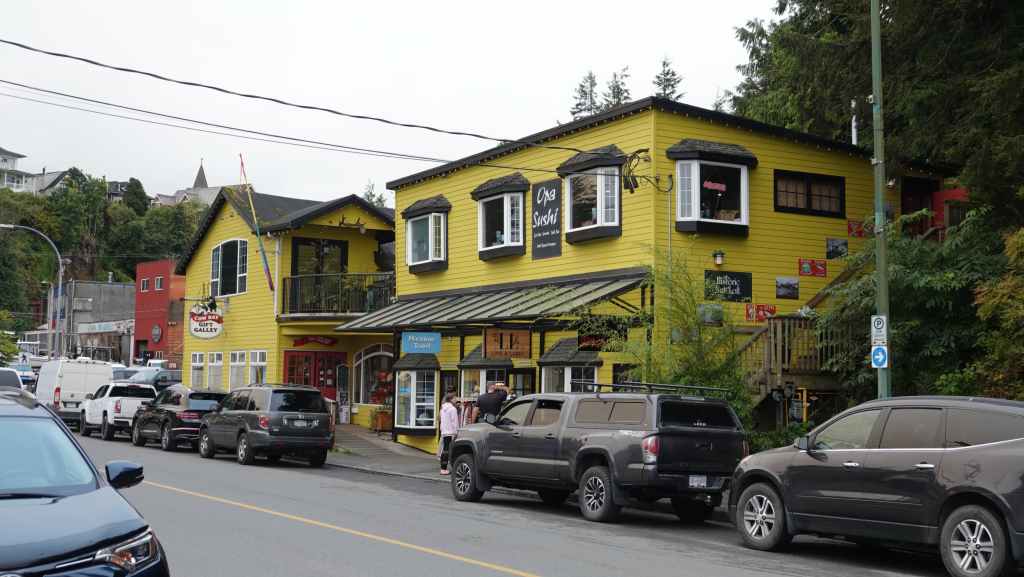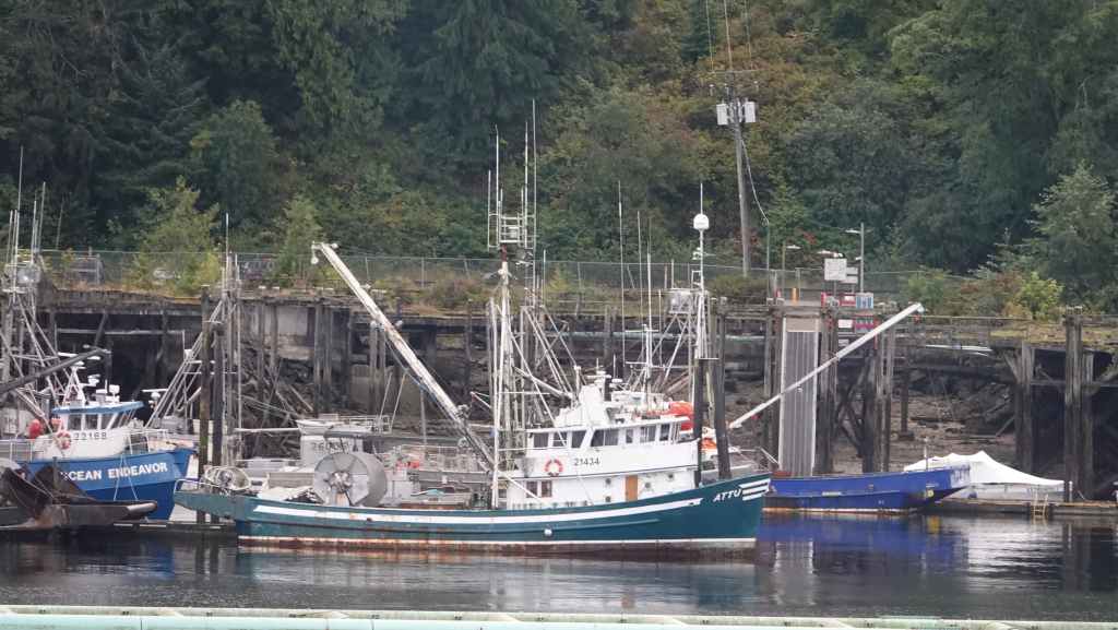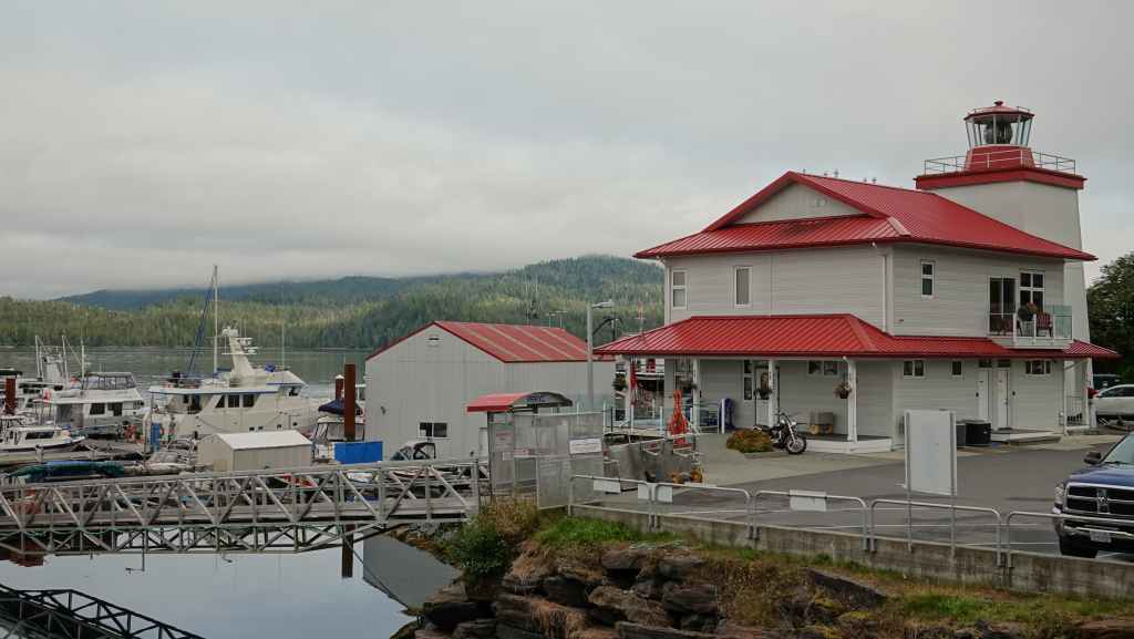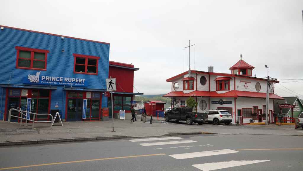 Puis on file plein ouest vert le port de Prince Rupert où nous arrivons en milieu de matinée. On en profite pour vidanger les citernes d’eaux grises et noires dans une station essence. On trouve à se garer sur un parking en bordure du port de pêche où les bateaux ramènent crabes et araignées de mer. Puisque c’est autorisé, nous resterons là pour la nuit, et pour ne pas perdre notre place, on fera tous nos déplacements à pied : d’abord pour visiter la ville après nous être rendu au Visitors Centre pour des infos et trouver un restaurant de poissons pour le dîner et pour trouver une laverie. Celle-ci se trouve à l’autre bout de la ville. Nous nous y rendons. C’est le fils de la patronne qui est là, un jeune homme maigre et livide qui nous renseigne. Nous retournons donc à notre véhicule pour récupérer notre gros sac de linge et repartons à la laverie dans la 6ème Avenue, à la Rinse Rupert Laundry où l’on peut laver le linge soi-même ou le faire laver : nous choisissons la deuxième solution et reviendrons dans l’après-midi. Nous déjeunons sur notre parking où de nombreuses voitures circulent à la recherche de places ou viennent acheter des crustacés aux pêcheurs. À noter que Prince Rupert est une ville plutôt industrielle et tournée vers la pêche et possède un gros port de commerce. Elle n’est pas particulièrement jolie même si quelques maisons sortent du lot…