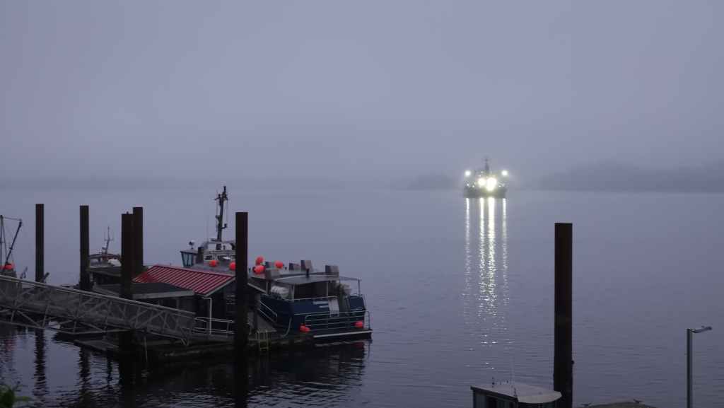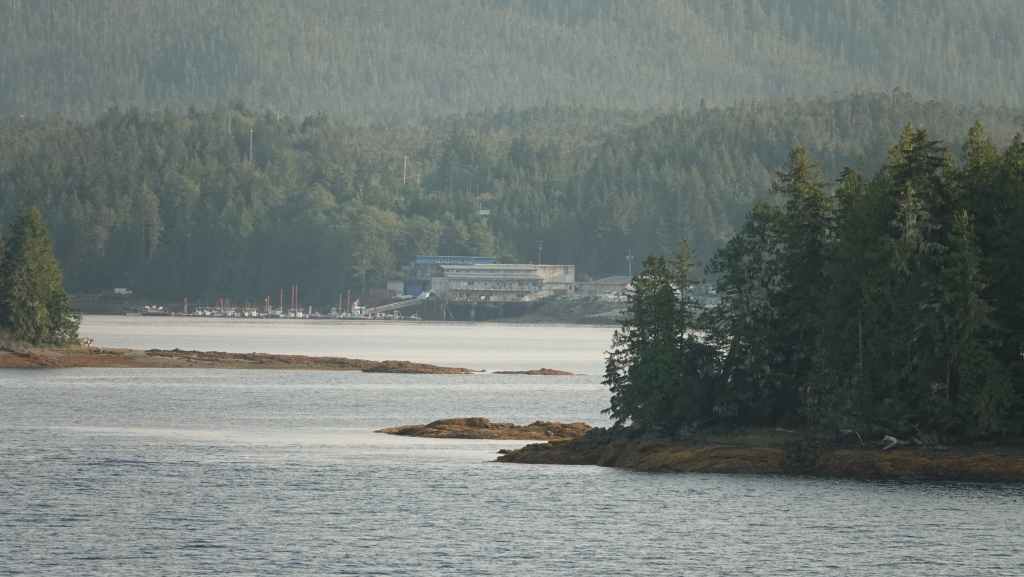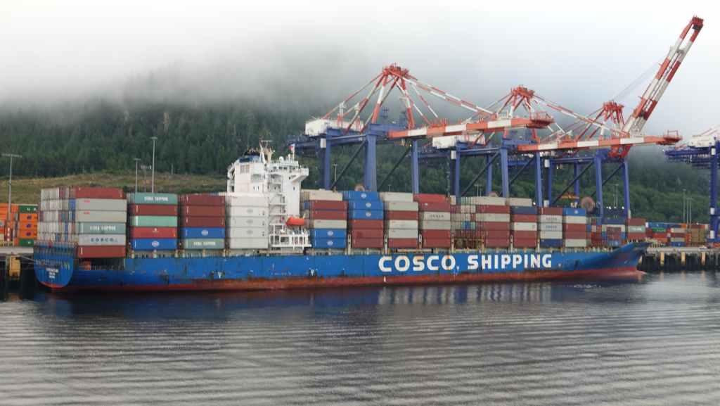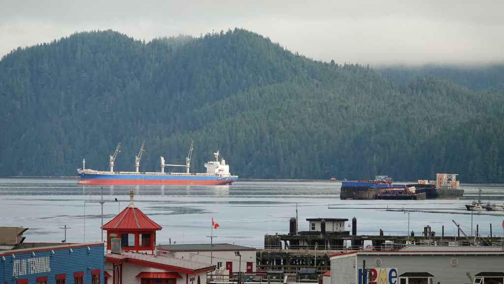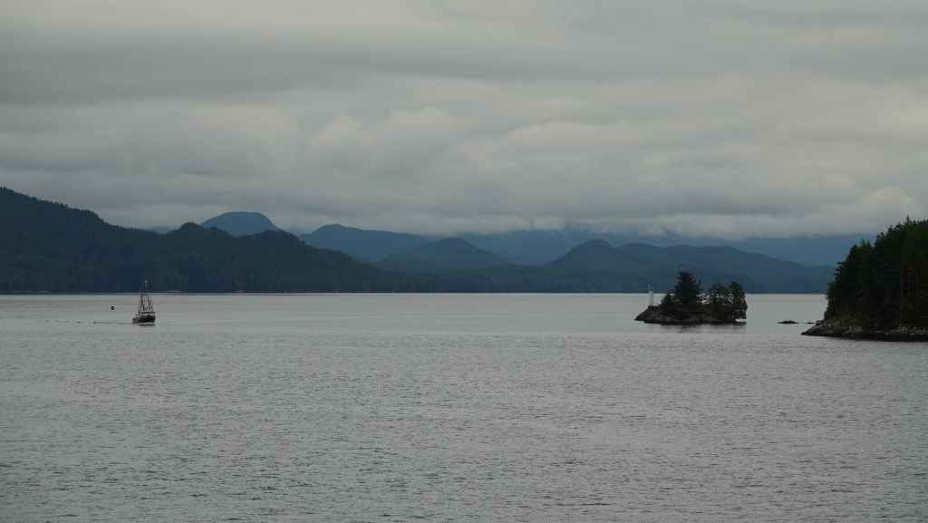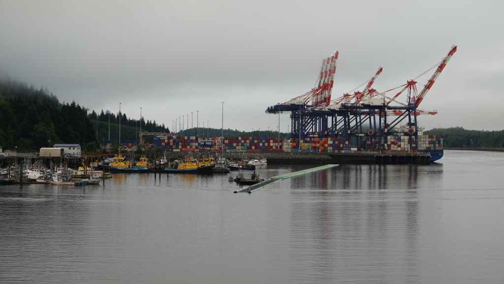 Ce matin, le ciel est très couvert avec un peu de bruine. On quitte Prince Rupert en longeant le port de commerce situé à Port Edward où un porte containers chinois est accosté.