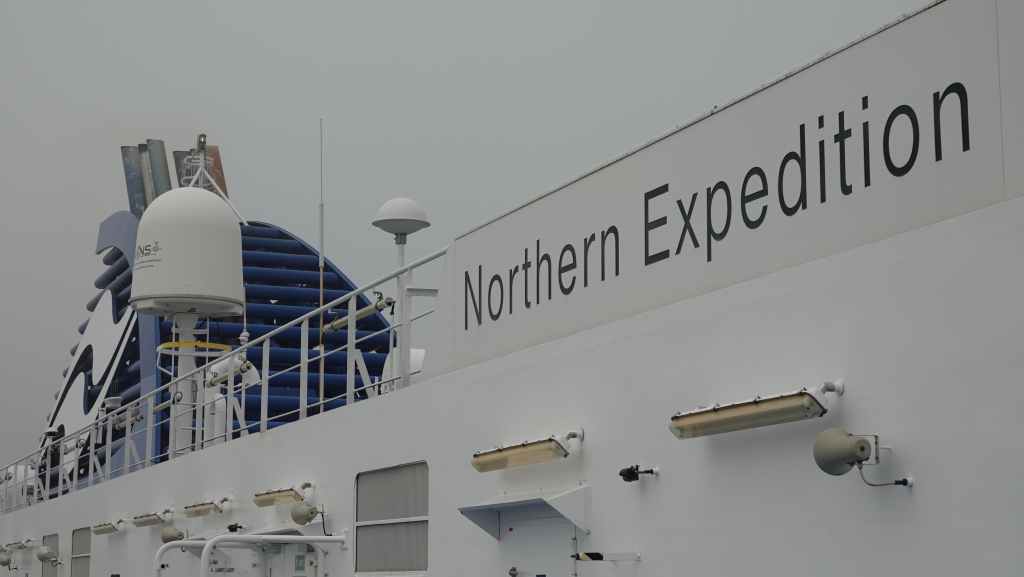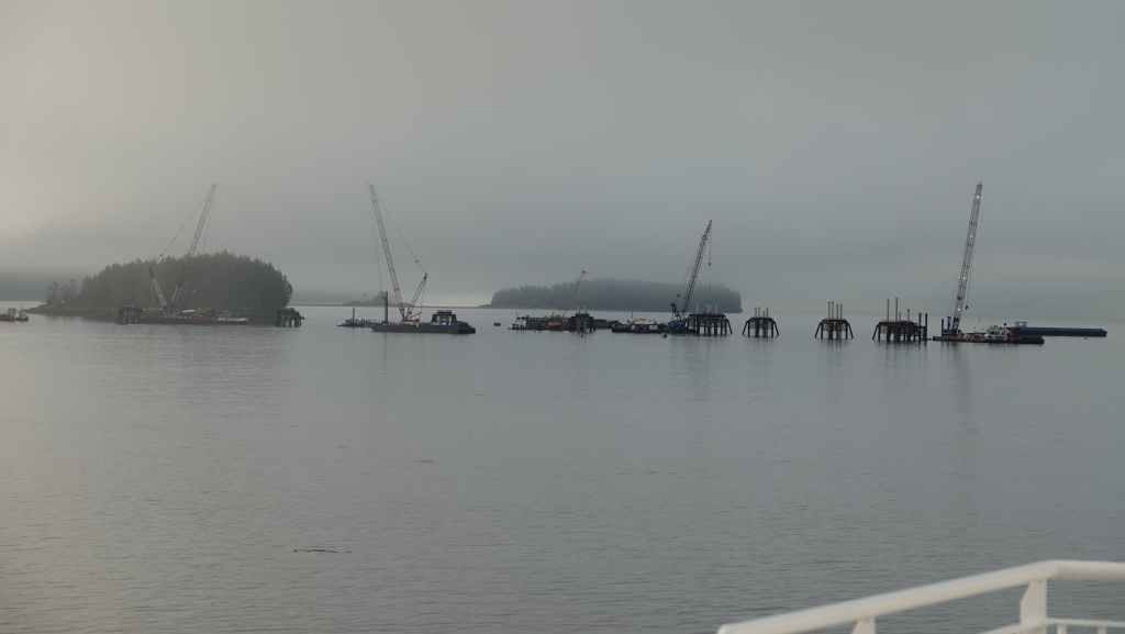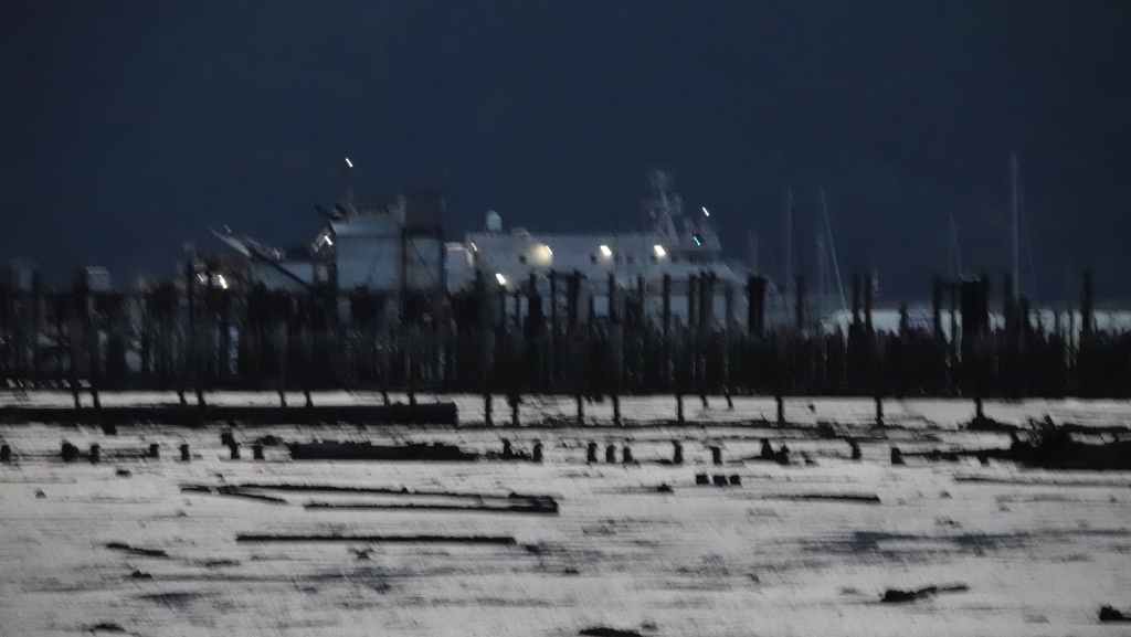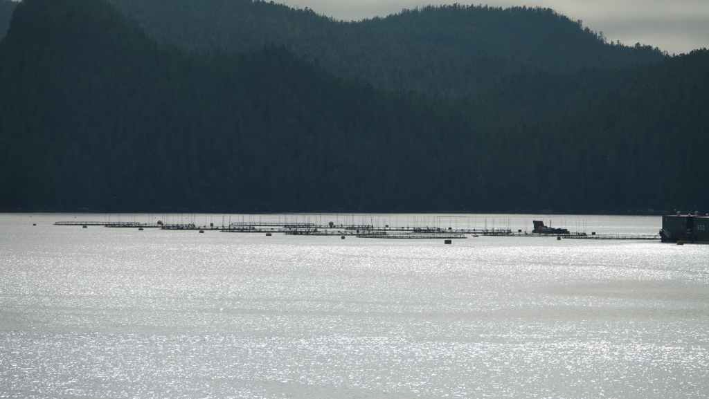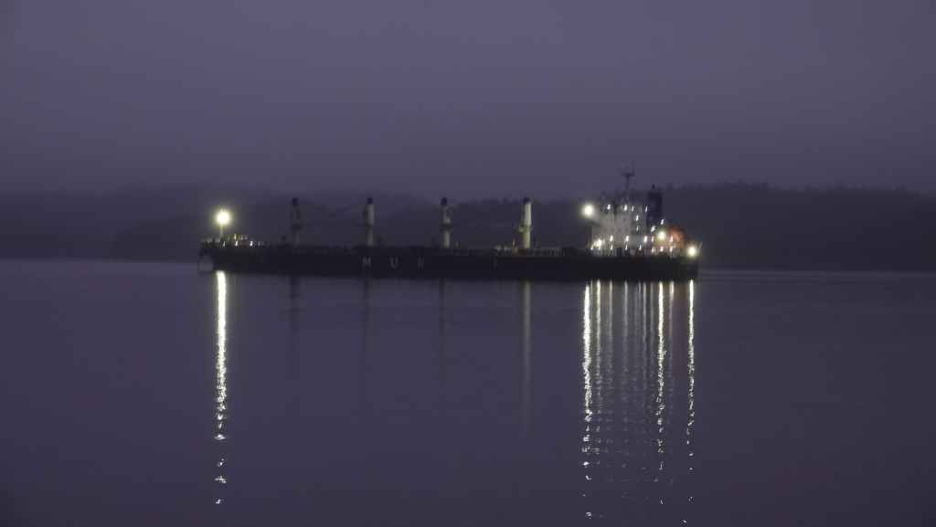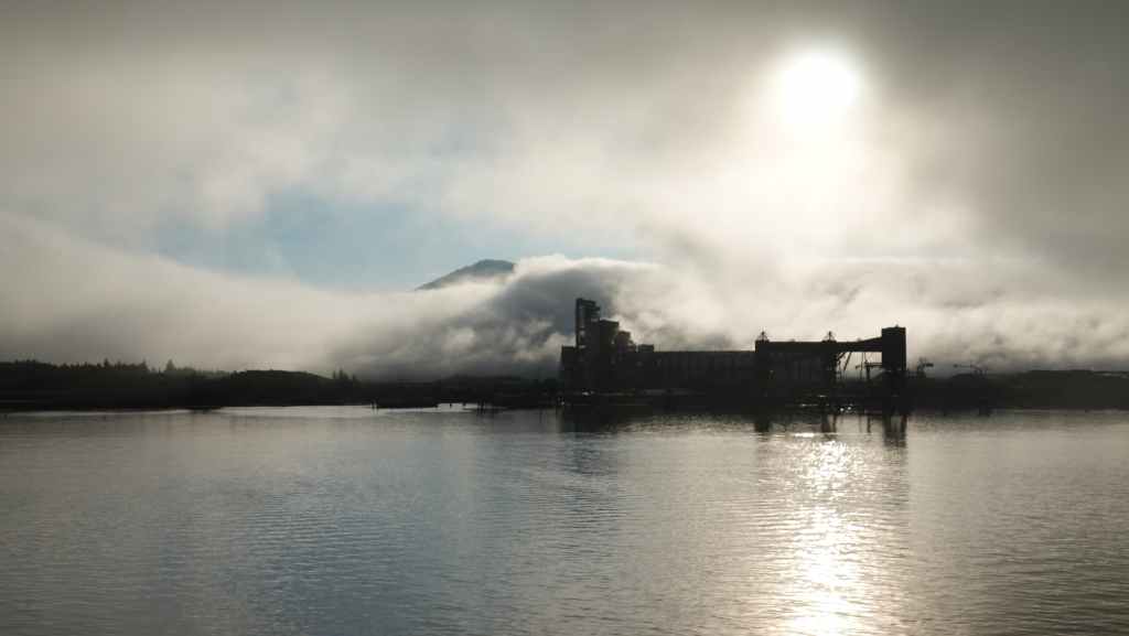 Ce matin, le ciel est très couvert avec un peu de bruine. On quitte Prince Rupert en longeant le port de commerce situé à Port Edward où un porte containers chinois est accosté.
