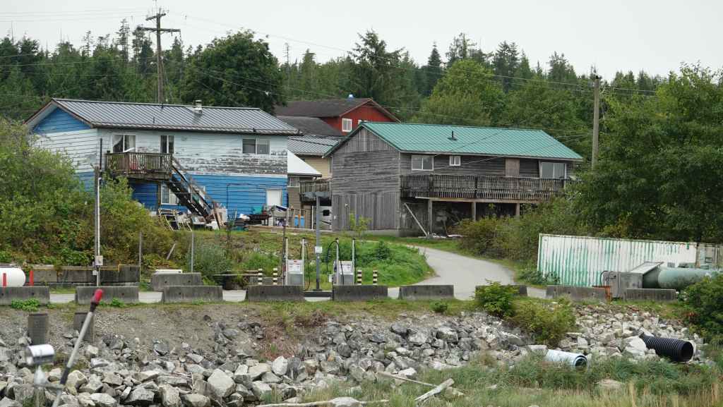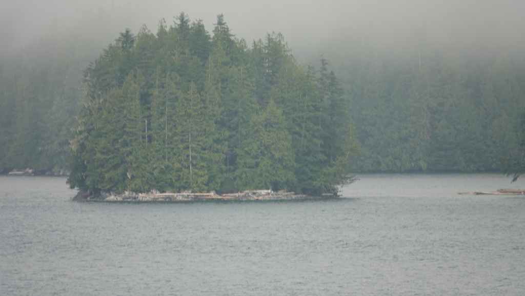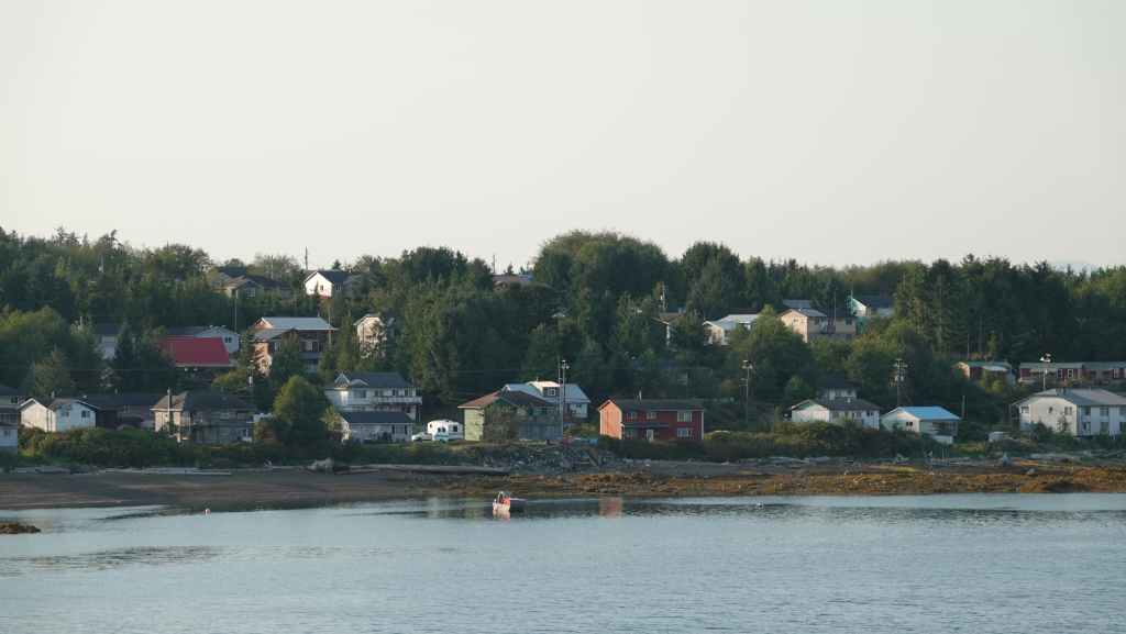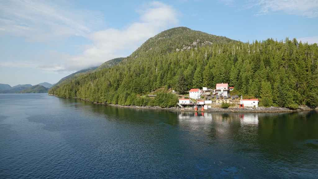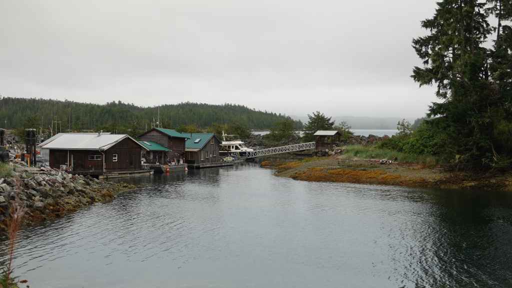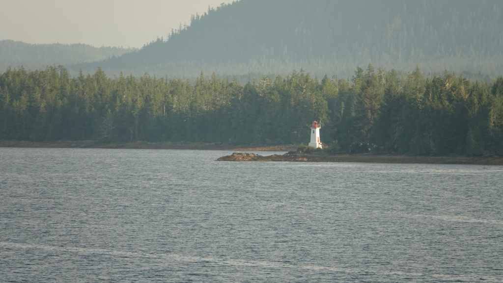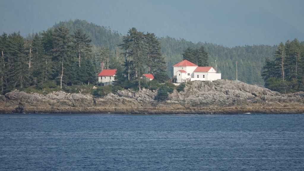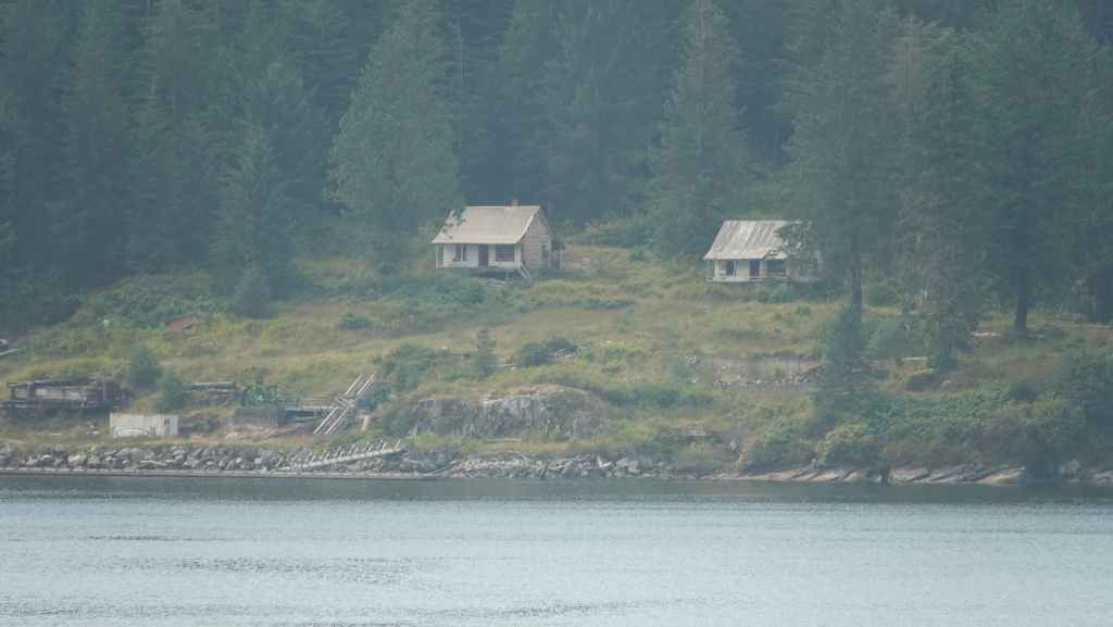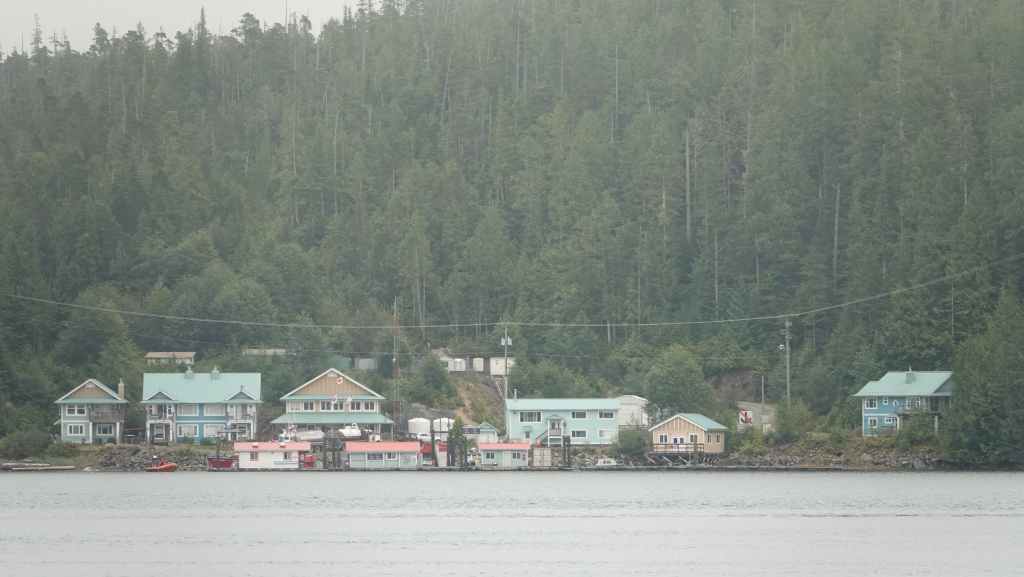 On reste quasiment toute la journée sur le pont sauf au moment du repas, pour espérer voir des baleines ou des loups de rivage, et à plusieurs reprises durant le trajet, nous apercevons des baleines grâce à leurs évents… En milieu d’après-midi, nous découvrons des hameaux situés en bout d’îles et enfin le phare de Dryad Point situé à l’extrémité nord-est de l’île Campbell. Cela annonce le village de Bella Bella que nous longeons avant de débarquer au port situé à 2 km au sud du village à 18h30.