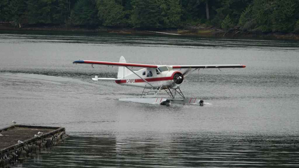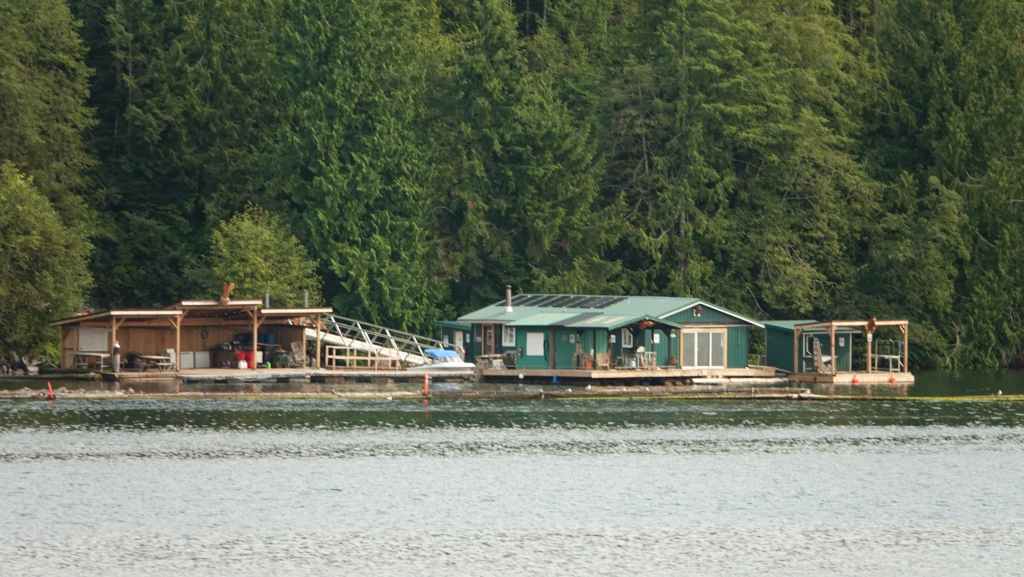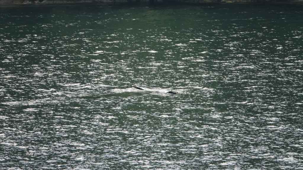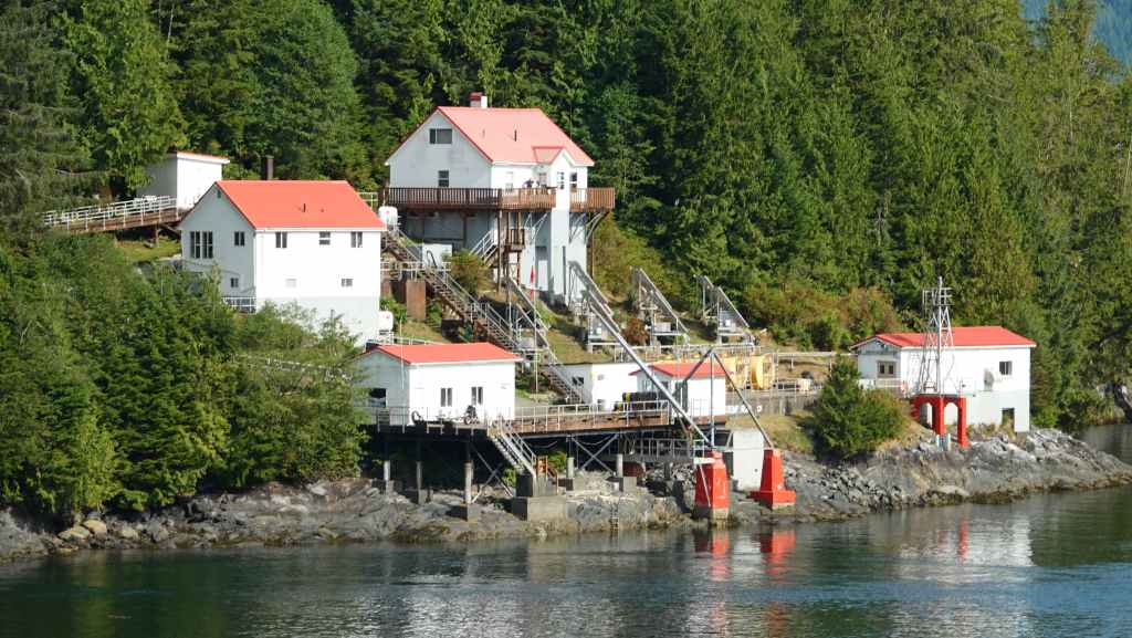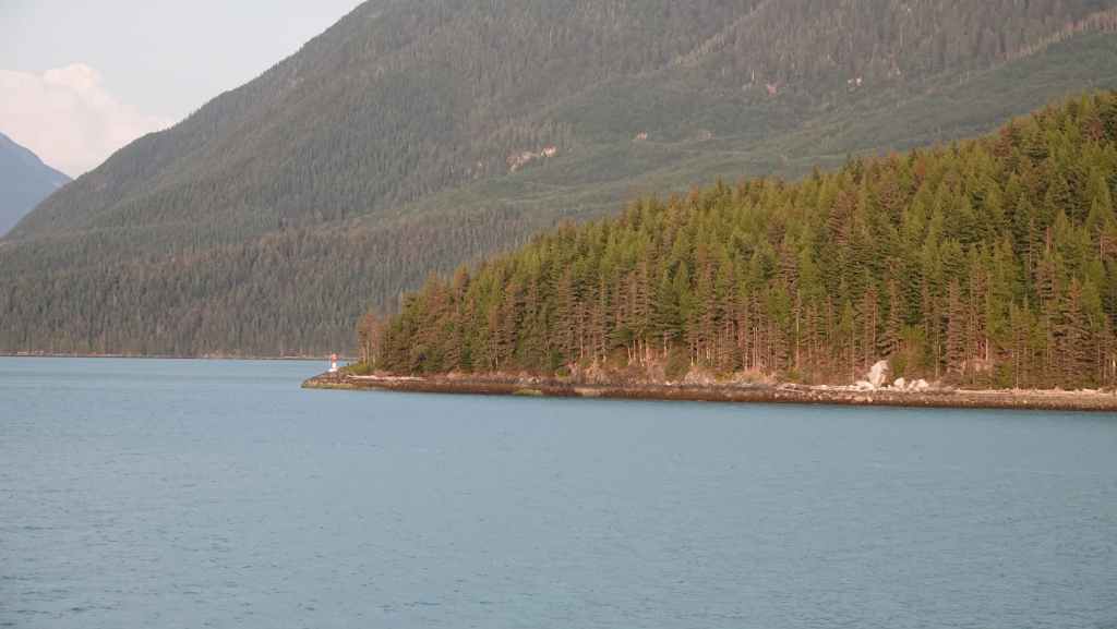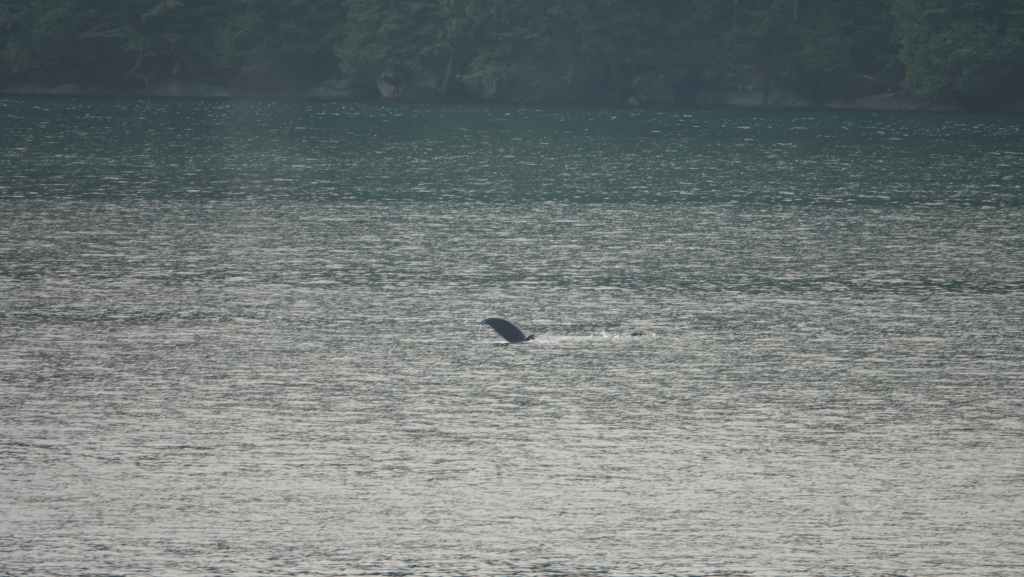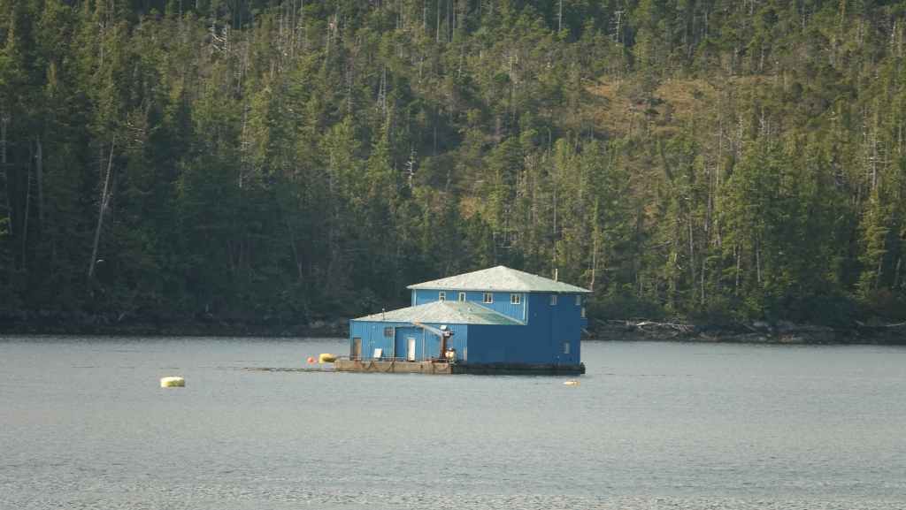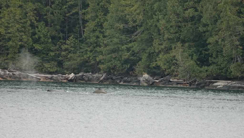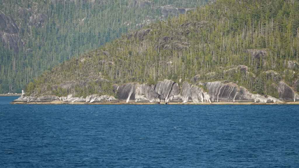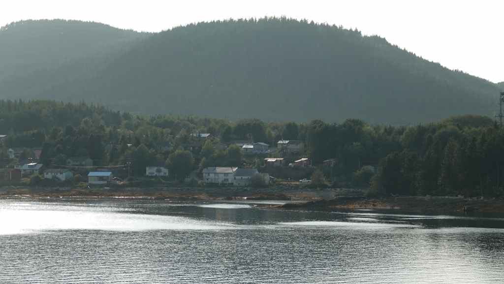 On reste quasiment toute la journée sur le pont sauf au moment du repas, pour espérer voir des baleines ou des loups de rivage, et à plusieurs reprises durant le trajet, nous apercevons des baleines grâce à leurs évents… En milieu d’après-midi, nous découvrons des hameaux situés en bout d’îles et enfin le phare de Dryad Point situé à l’extrémité nord-est de l’île Campbell. Cela annonce le village de Bella Bella que nous longeons avant de débarquer au port situé à 2 km au sud du village à 18h30.
