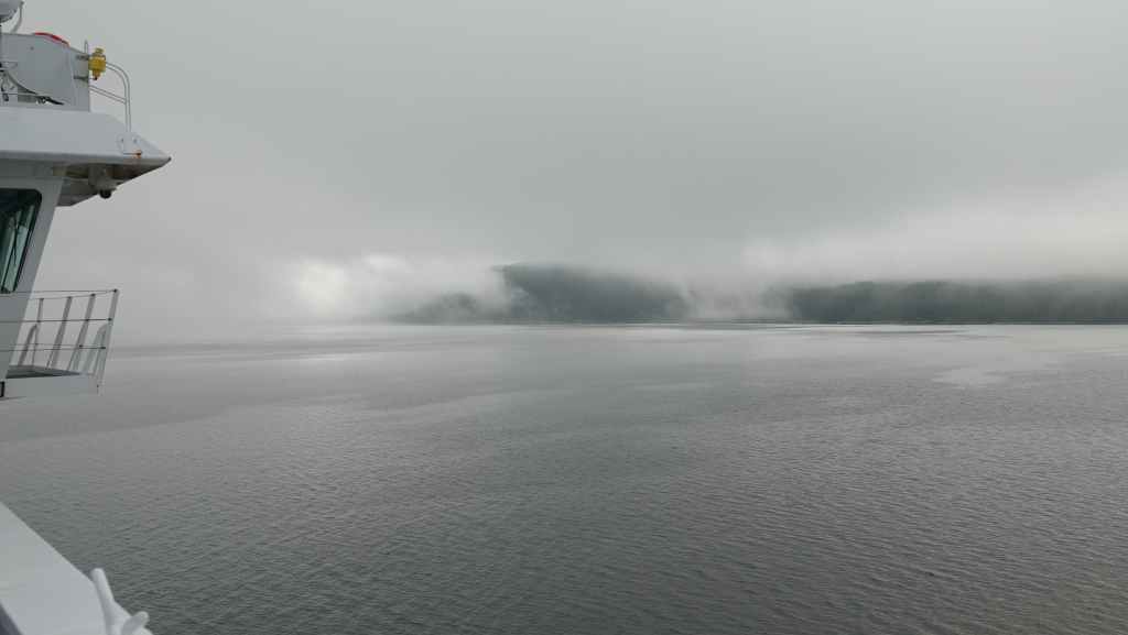 Puis à nouveau, le brouillard réapparait au moment de croiser d’autres bras de mer avant que les nuages ne disparaissent définitivement.
