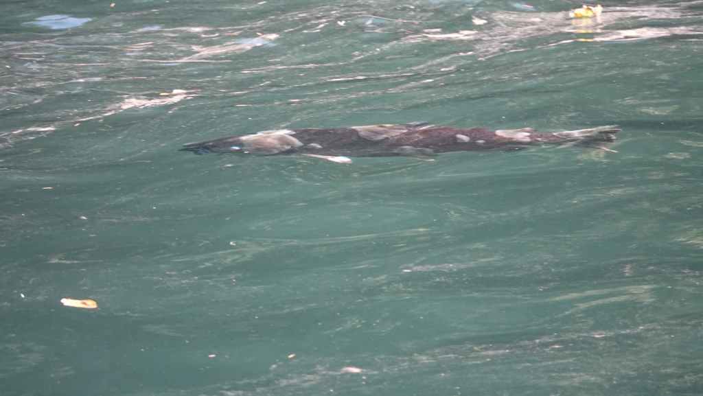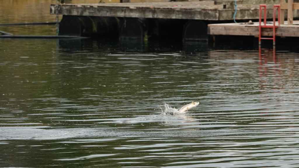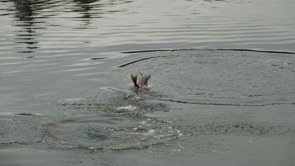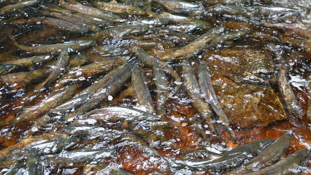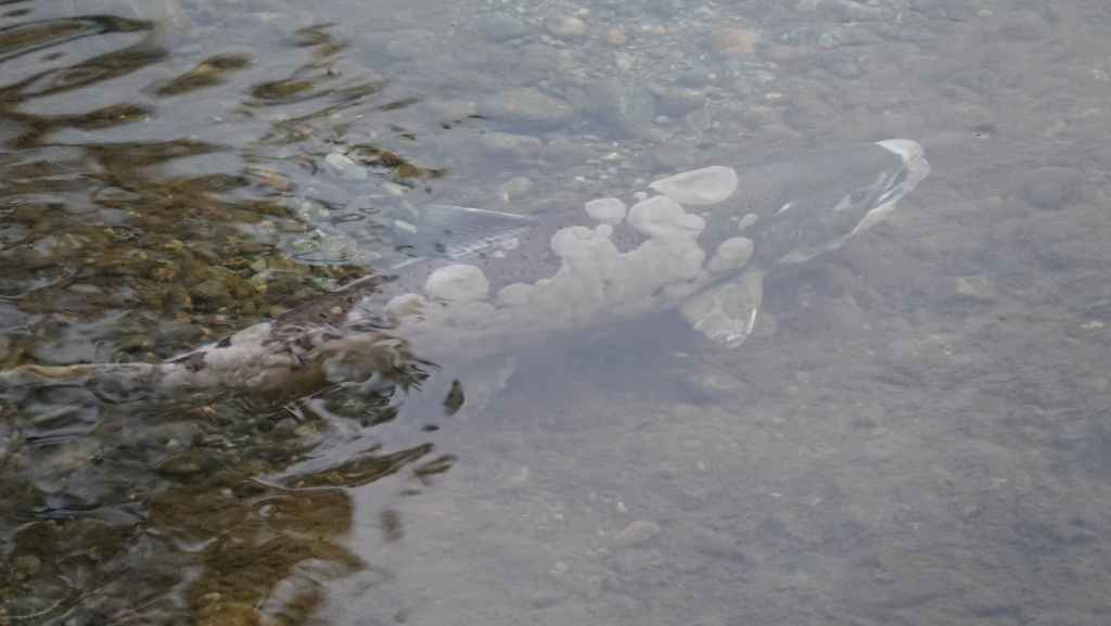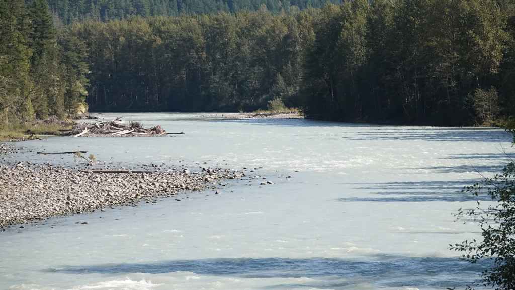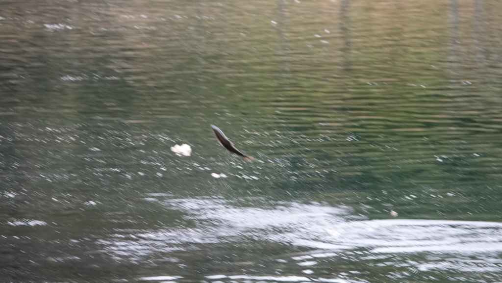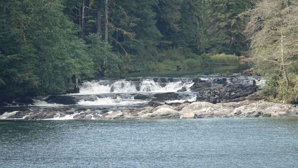 Balade au bord de la rivière qui pullule de saumons vivants, en fin de vie ou morts. Les mâles encore vigoureux sautent en dehors de l’eau de mer afin de se faire remarquer par les femelles, d’autres tentent souvent en vain de remonter la rivière qui remonte au lac MacLaughlin afin de se reproduire. Un observatoire a été construit pour observer les saumons.
