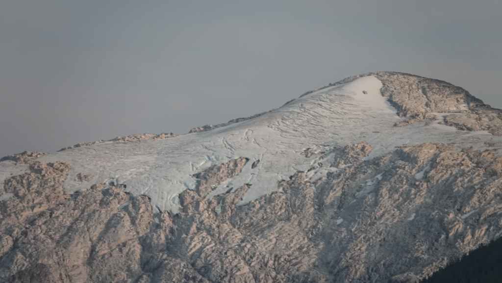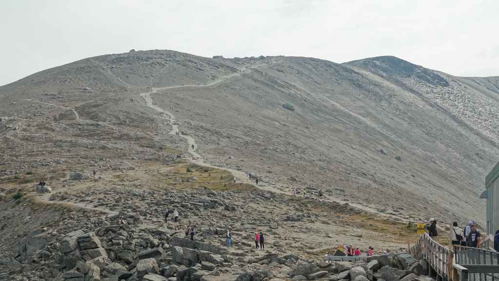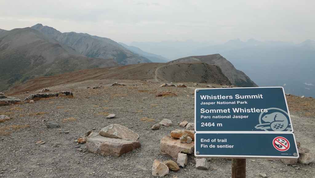 Arrivés au niveau supérieur de la télécabine, on entame une mini rando vers le Mont Whistlers qui culmine à 2464 m et malgré un ciel gris, la vue est splendide.