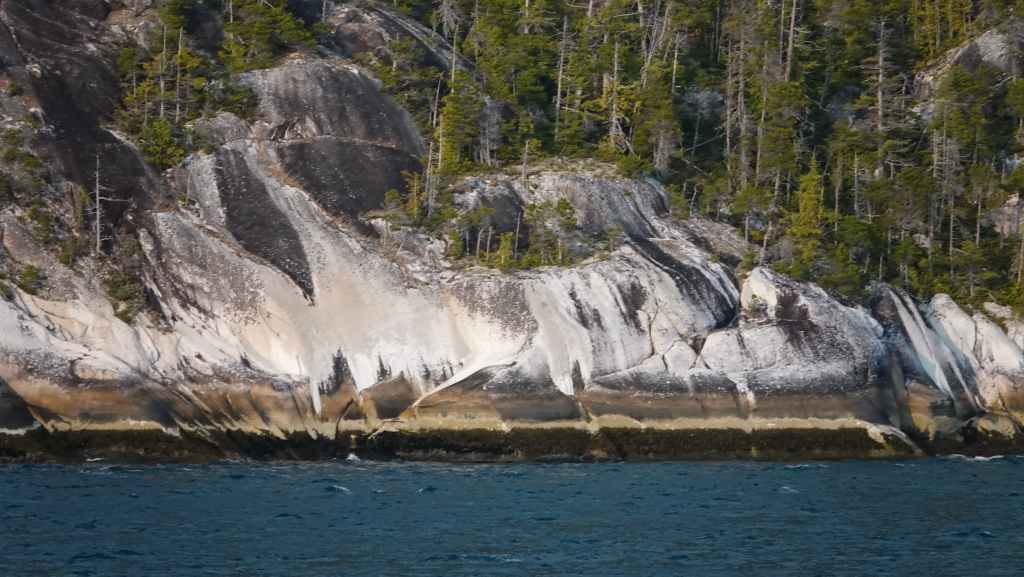 Notre itinéraire passe entre le continent et l’île Pitt puis descend vers le sud est par canal naturel de plus en plus étroit jusqu’à ne faire qu’ 1 km de largeur… Et au fur à mesure que l’on descend, le ciel s’éclaircit et laisse apparaitre des paysages somptueux.