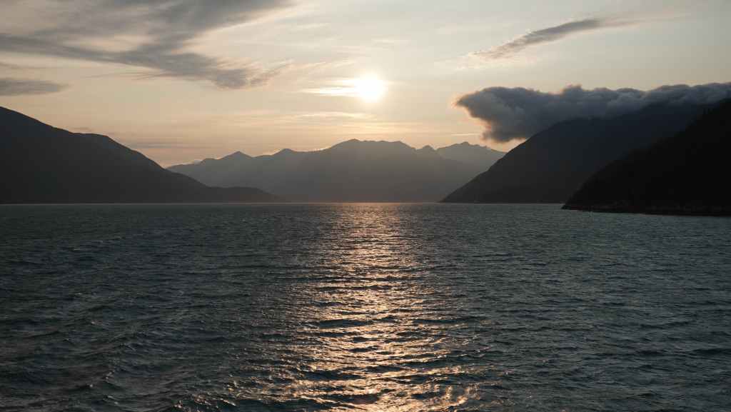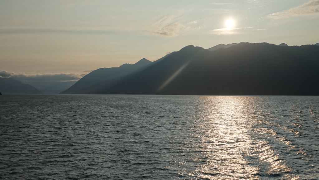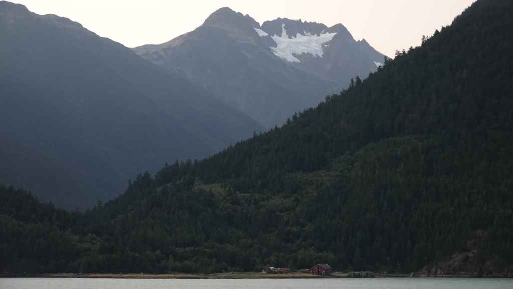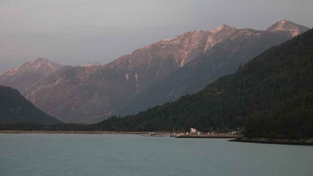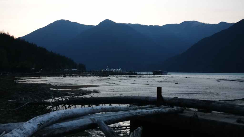 Les paysages sont vraiment grandioses et l’on aperçoit les premiers glaciers de la chaine côtière, au fur et à mesure que le soleil baisse… Quelques baleines sont de la partie ! Juste avant de débarquer, la capitaine du ferry nous prévient qu’il nous sera peut-être compliqué de sortir de la vallée à cause des feux de forêts qui règnent sur le plateau ! Nous aviserons le moment venu…
