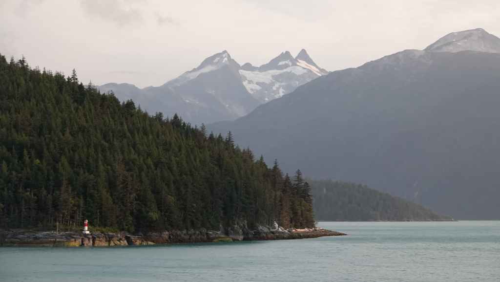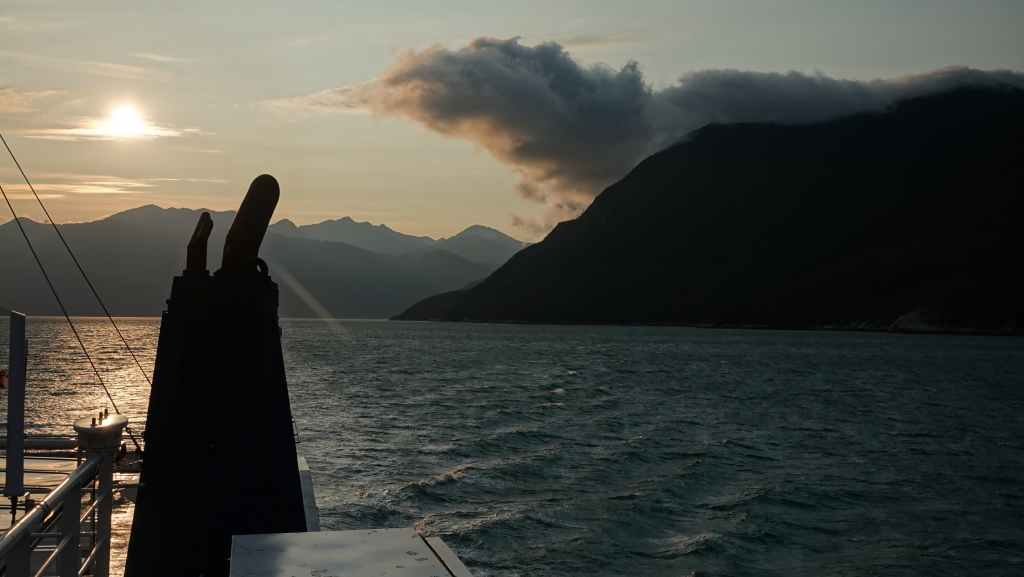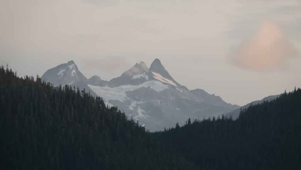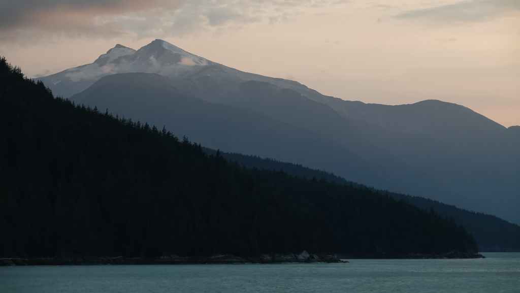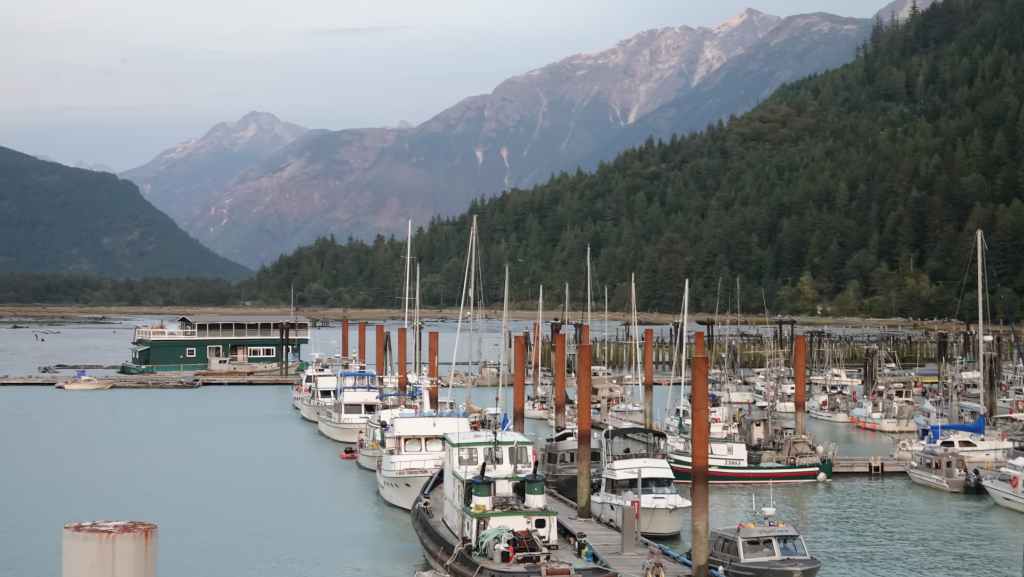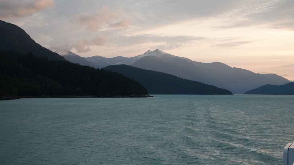 Les paysages sont vraiment grandioses et l’on aperçoit les premiers glaciers de la chaine côtière, au fur et à mesure que le soleil baisse… Quelques baleines sont de la partie ! Juste avant de débarquer, la capitaine du ferry nous prévient qu’il nous sera peut-être compliqué de sortir de la vallée à cause des feux de forêts qui règnent sur le plateau ! Nous aviserons le moment venu…