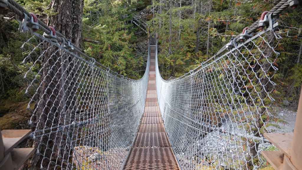 On va ensuite faire une petite randonnée au Burnt Bridge Loop Trail ( 5,5 km et + 265 m de dénivelé) : on monte au travers de cèdres rouges géants, vers un point de vue sur la vallée, puis vers un pont de singe qui enjambe le Burnt Bridge Creek. On redescend ensuite au parking avec le survol d’un aigle.