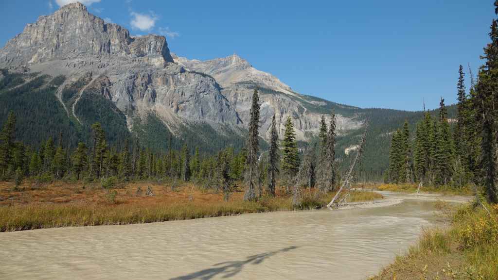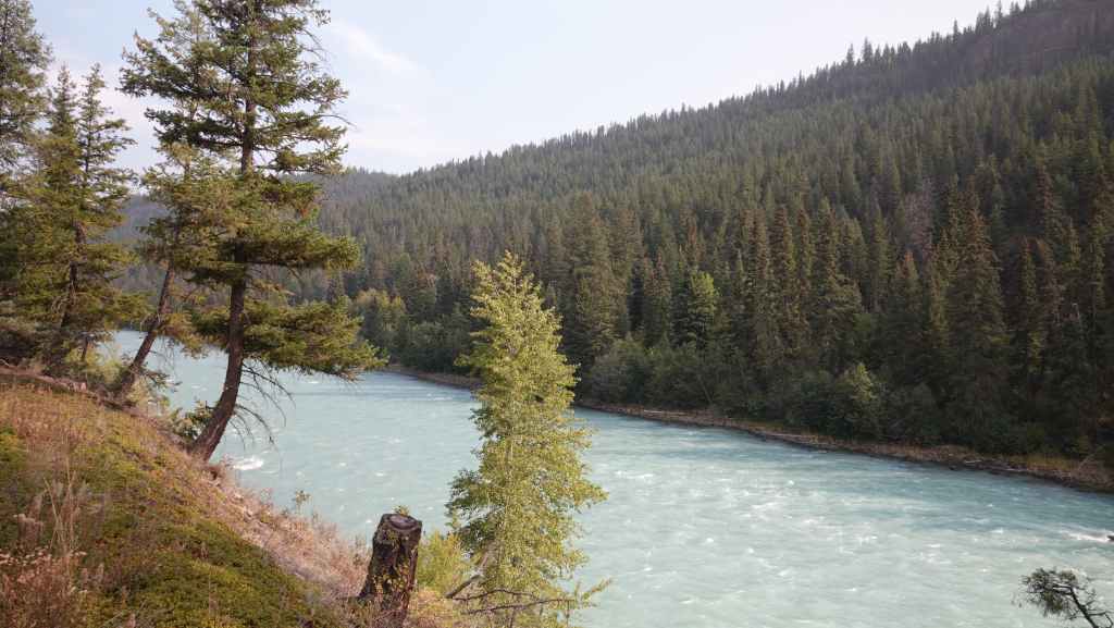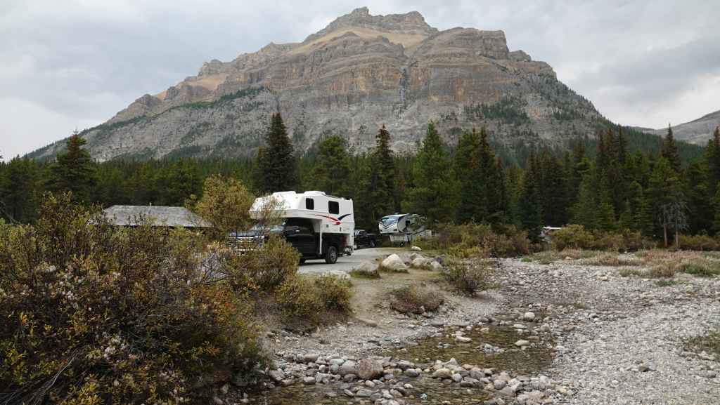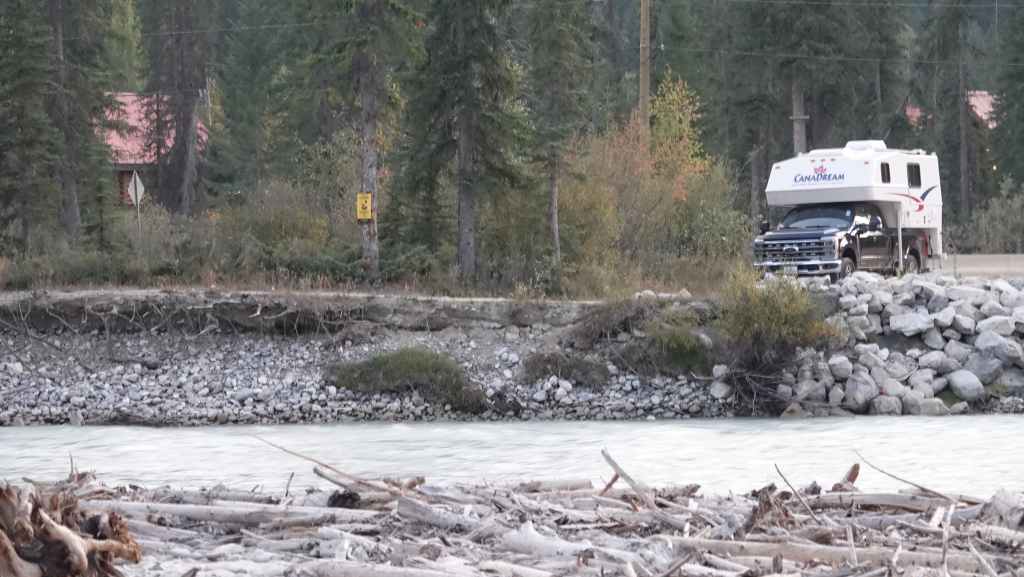 Nous voilà reparti sur la route principale. On trouve un lieu de bivouac non loin de Leanchoil, au bord de la rivière Yoho et… de la ligne de chemin de fer !!! Plusieurs véhicules sont déjà stationnés.