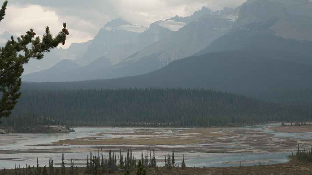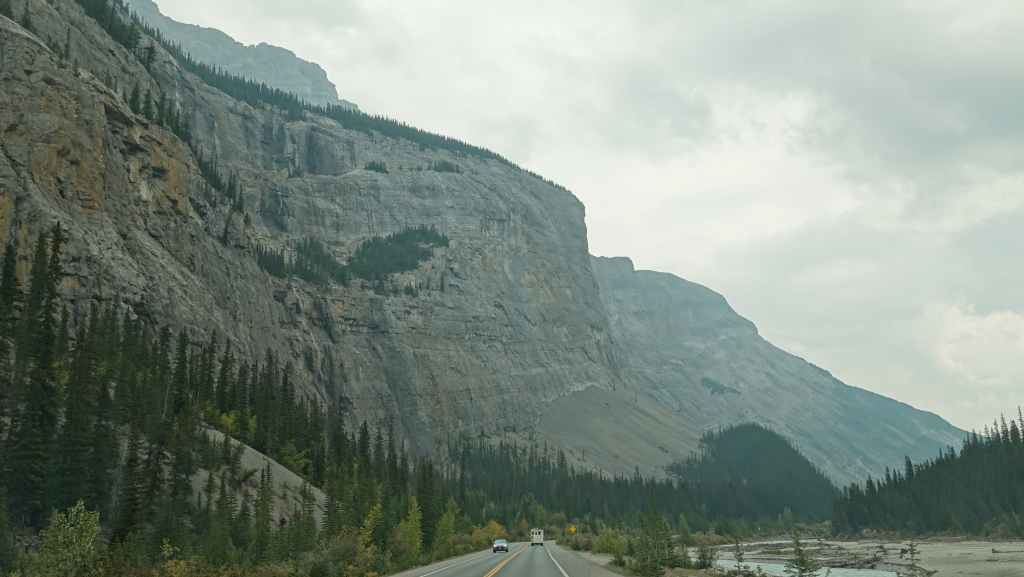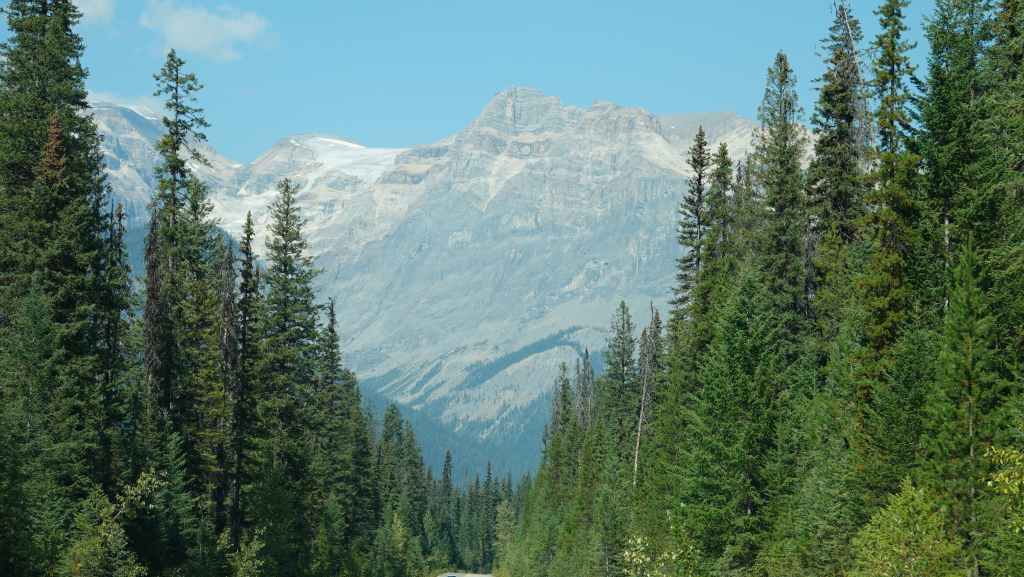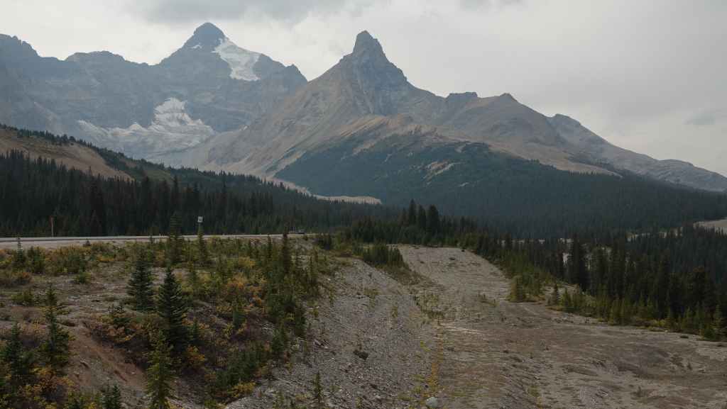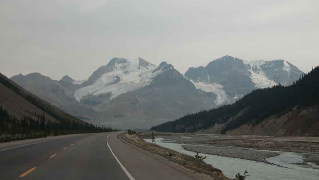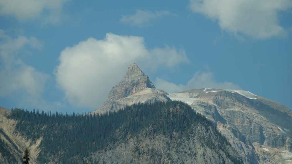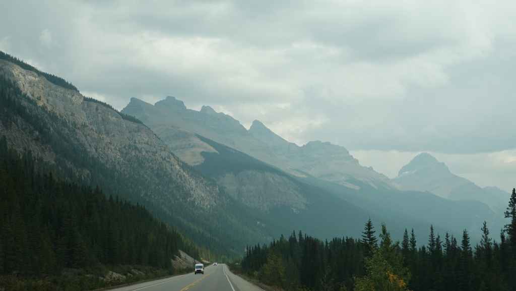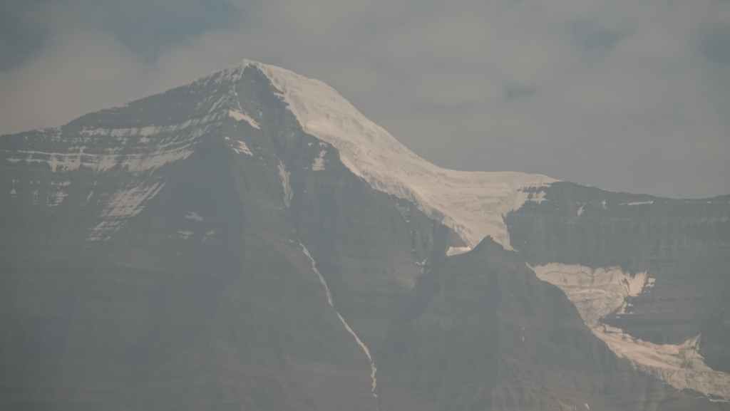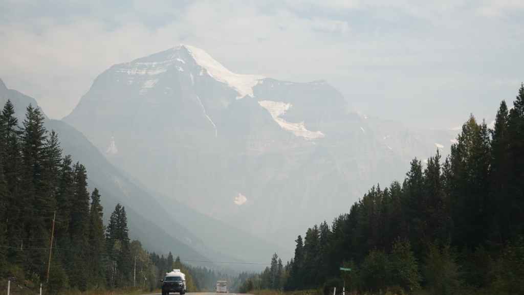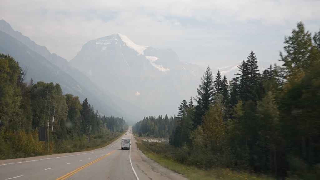 Plus loin, les contreforts des célèbres Rocheuses apparaissent avec le Mont Robson. On pénètre dans la province de l’Alberta. La circulation automobile augmente et les poids lourds nous bourrent et nous doublent à une vitesse proche de 110 km/h (la route 16 n’est pas une autoroute !).