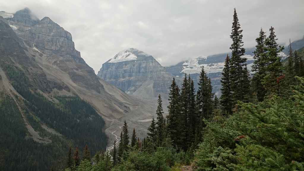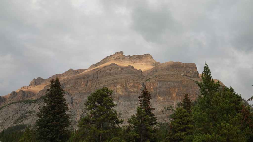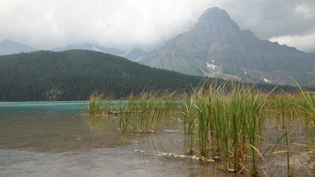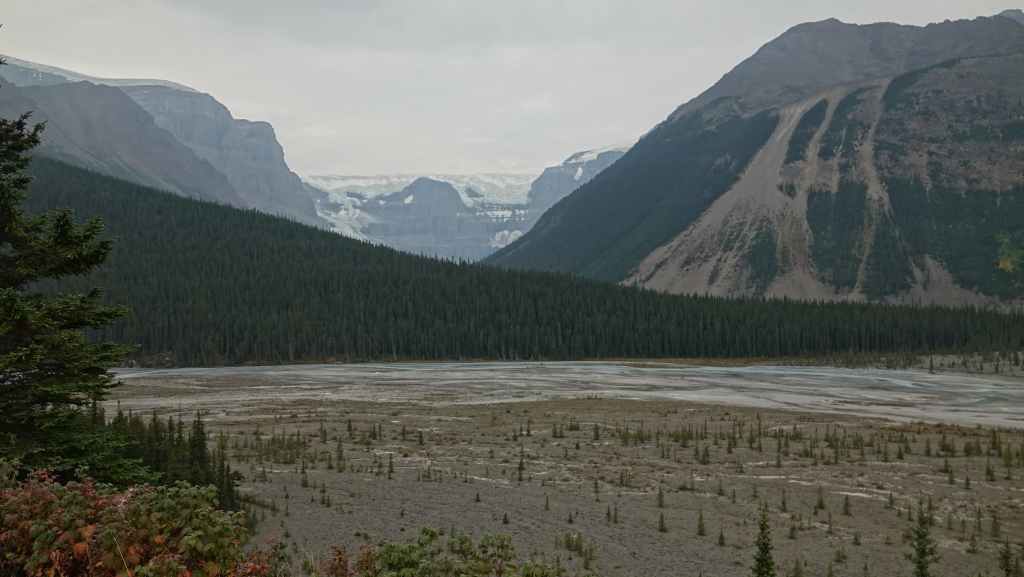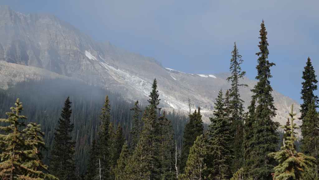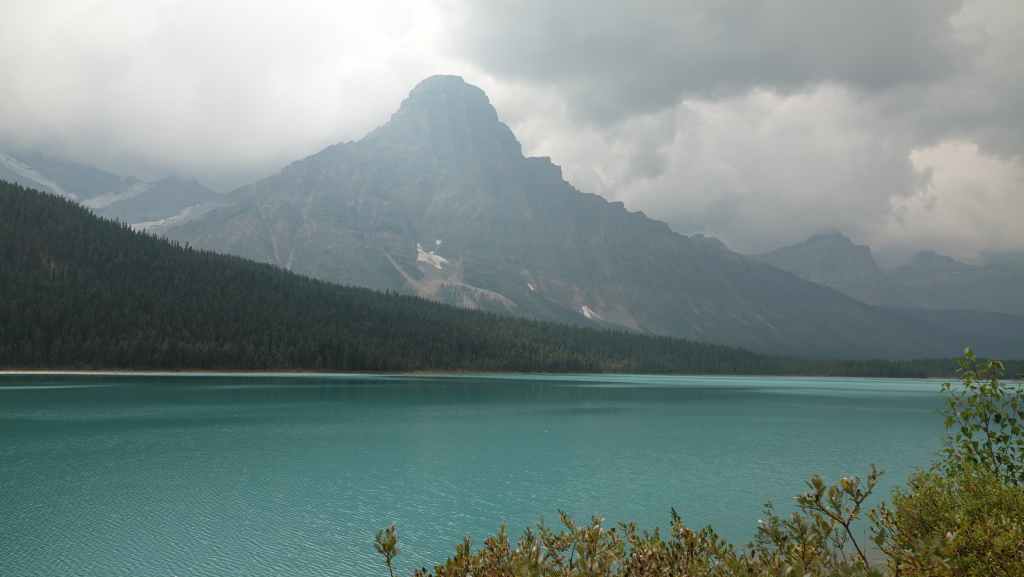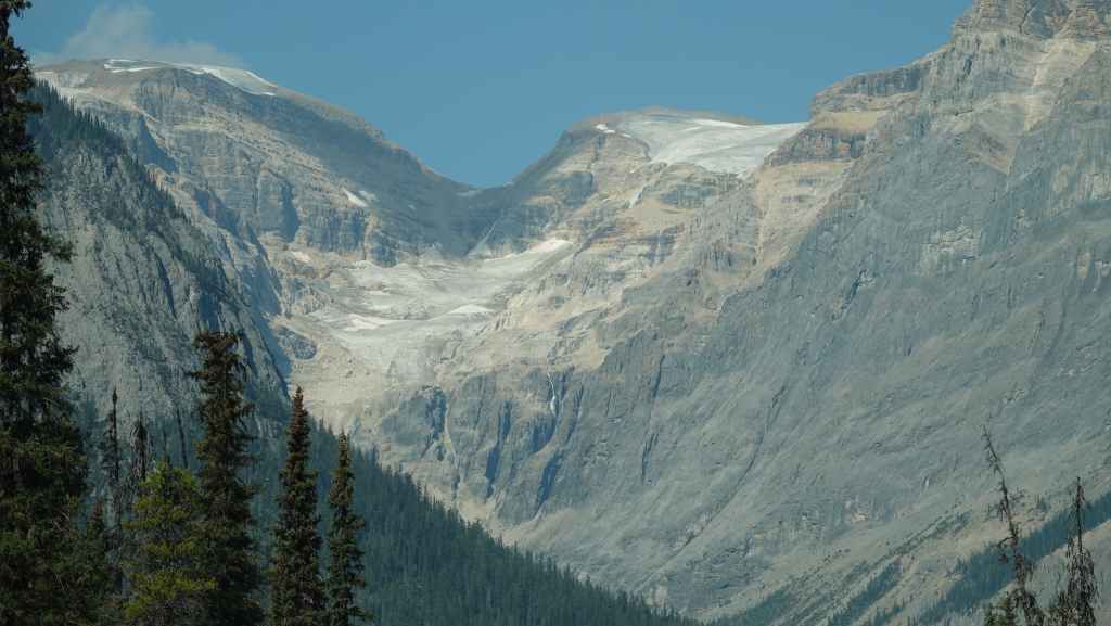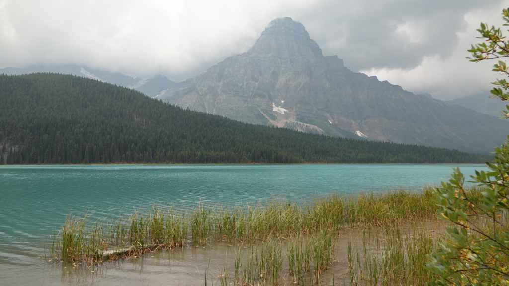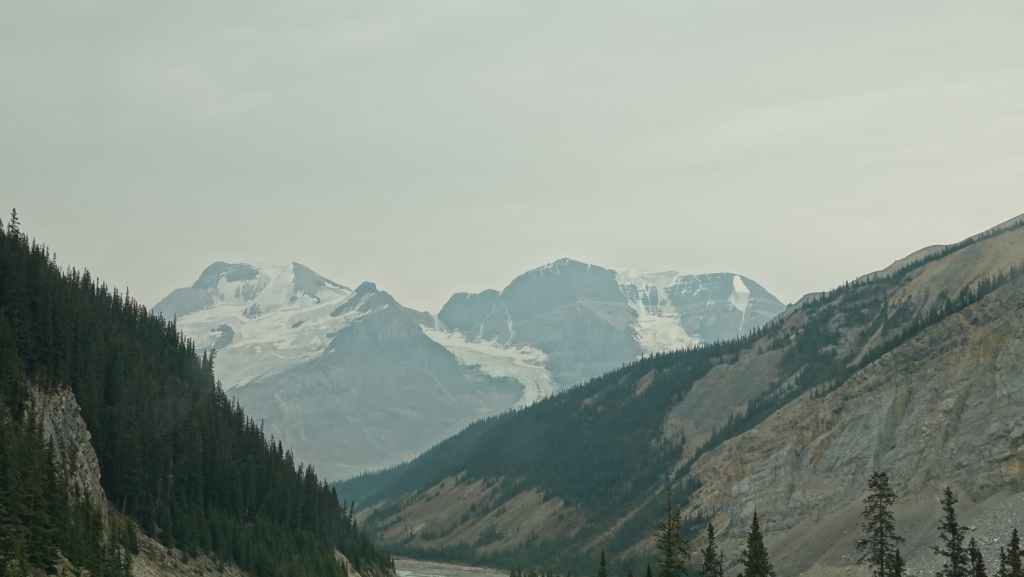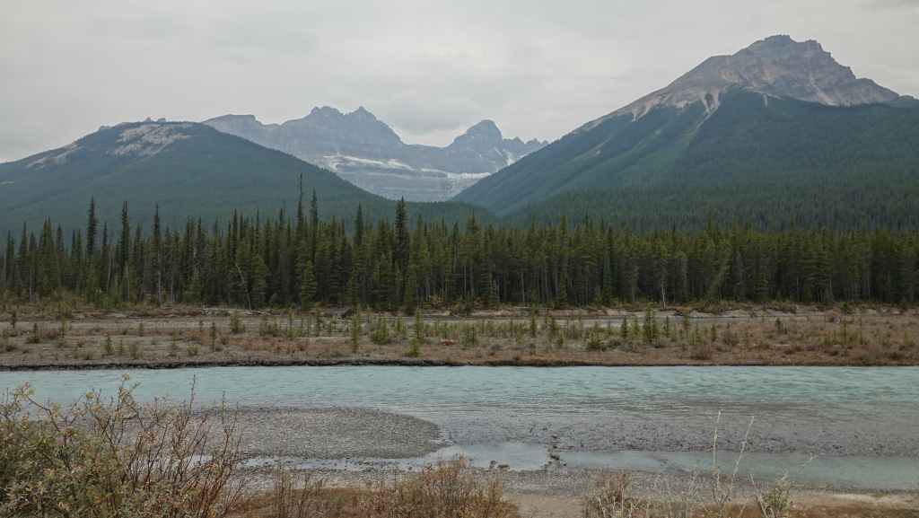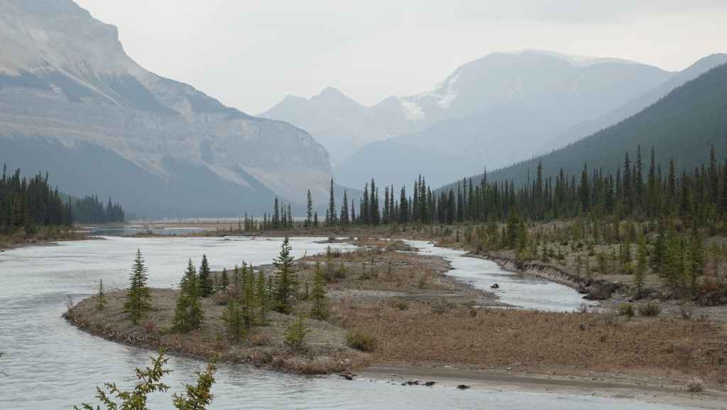 Plus loin, les contreforts des célèbres Rocheuses apparaissent avec le Mont Robson. On pénètre dans la province de l’Alberta. La circulation automobile augmente et les poids lourds nous bourrent et nous doublent à une vitesse proche de 110 km/h (la route 16 n’est pas une autoroute !).