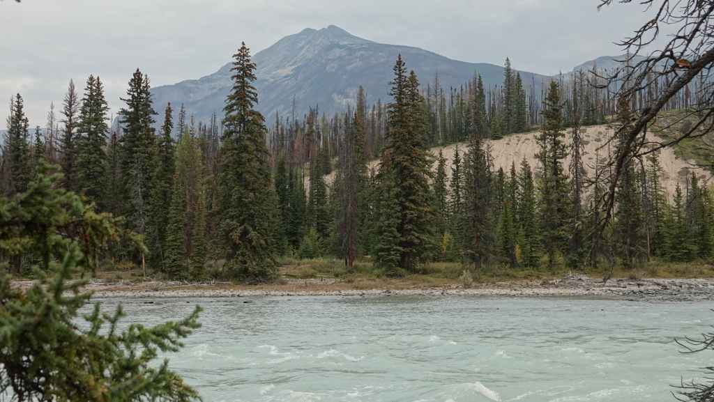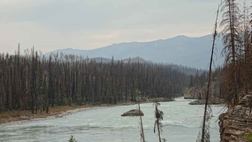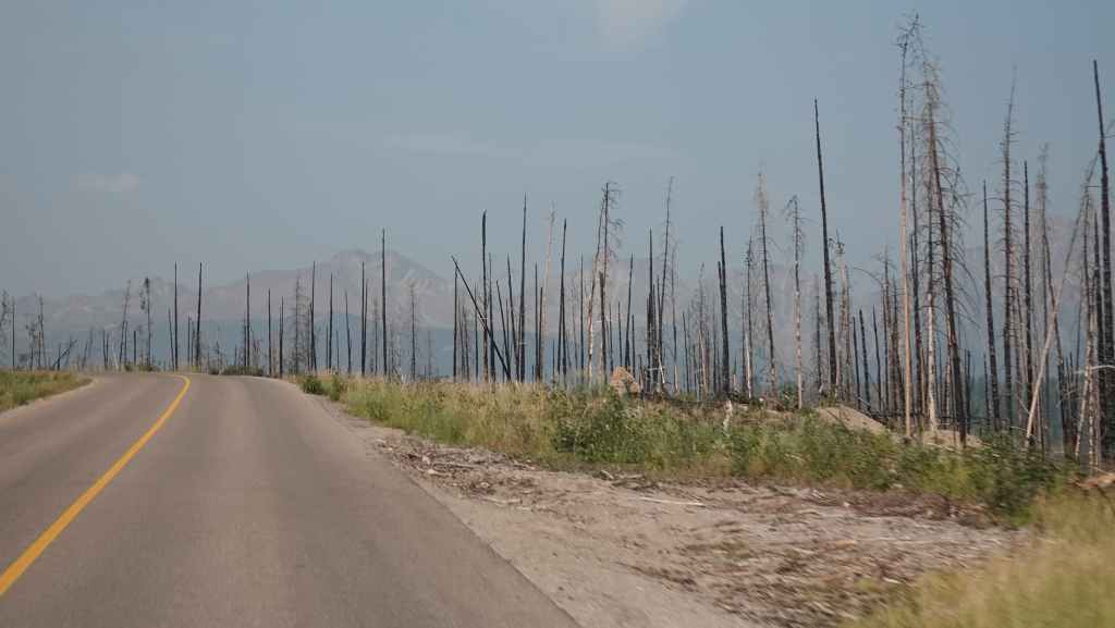 Nous sommes à quelques kilomètres de Jasper et son célèbre parc national et un péage oblige à payer l’entrée du parc. On colle la preuve d’achat sur la pare-brise et c’est reparti en direction du Skytram, un vieux téléphérique qui monte à 2263 m d’altitude. Au fur et à mesure que l’on avance, on découvre les dégâts des gigantesques feux de forêts de 2024 qui ont détruit une bonne partie du parc national.