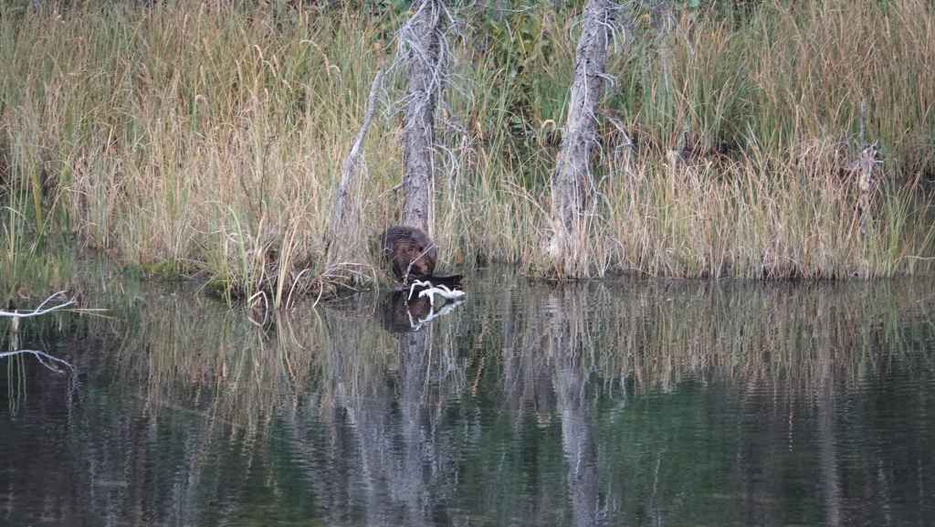 Nous nous rendons ensuite au seul camping ouvert, le Whistlers Campground mais il est déjà complet, malgré ses 800 emplacements. Alors, l’agent d’accueil nous envoie au camp de « dépannage » (overflow en anglais) à 15 km au nord de Jasper. Nous nous y rendons tout en faisant un arrêt vers un petit lac où un groupe de touristes observe un castor en pleine toilette…
