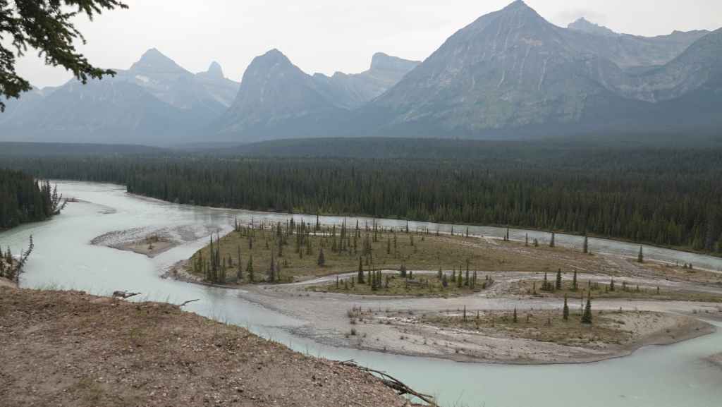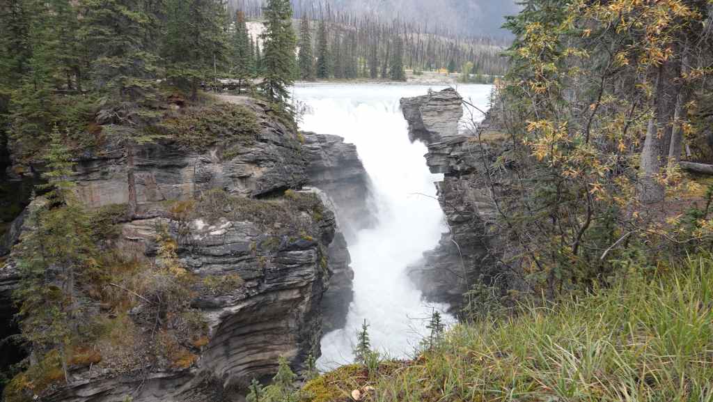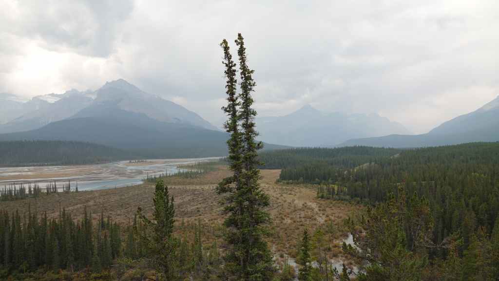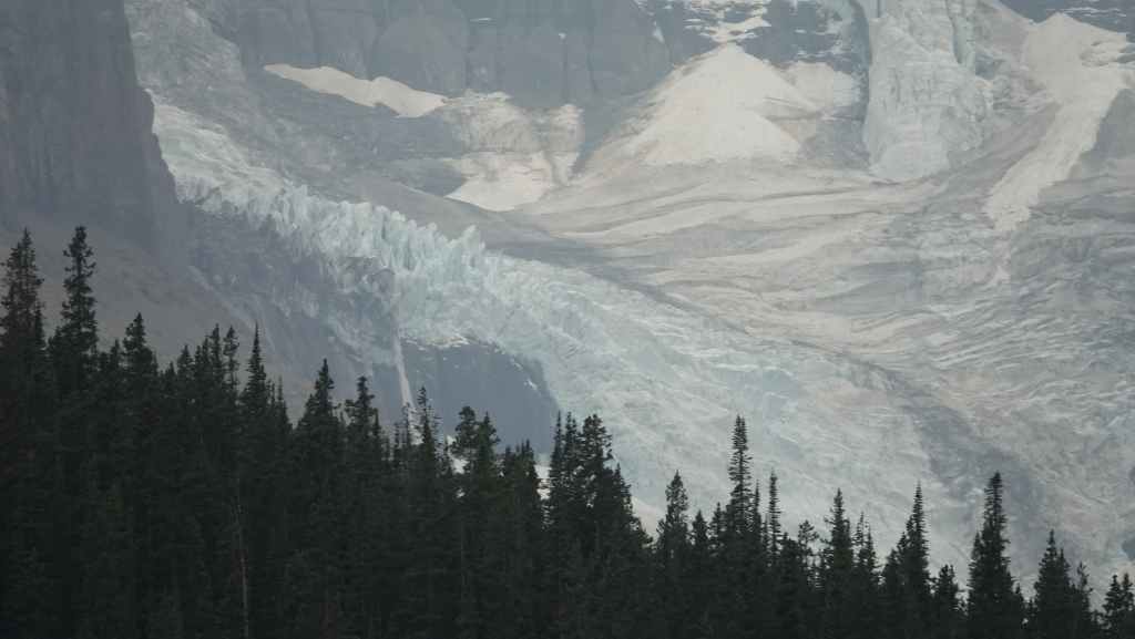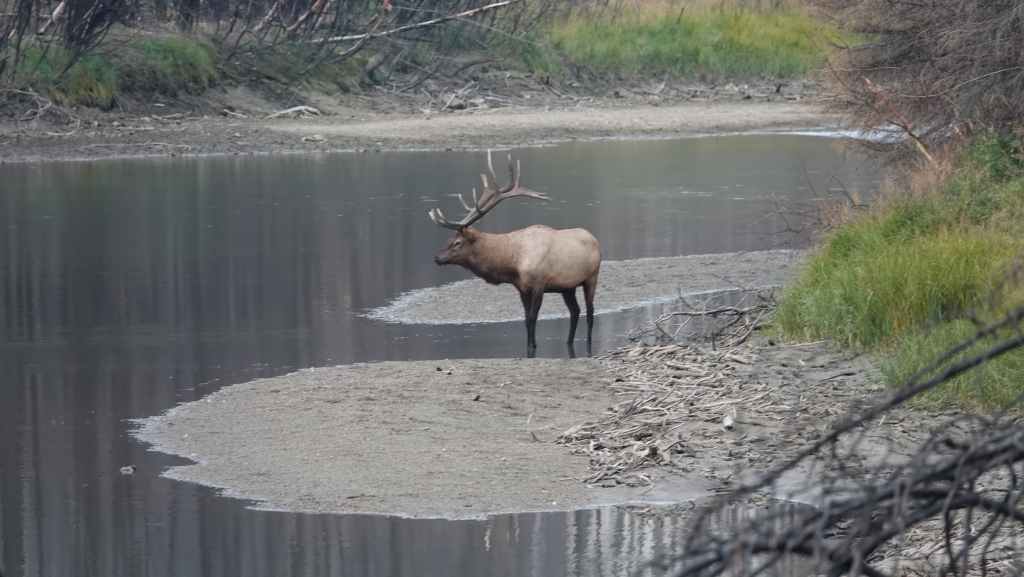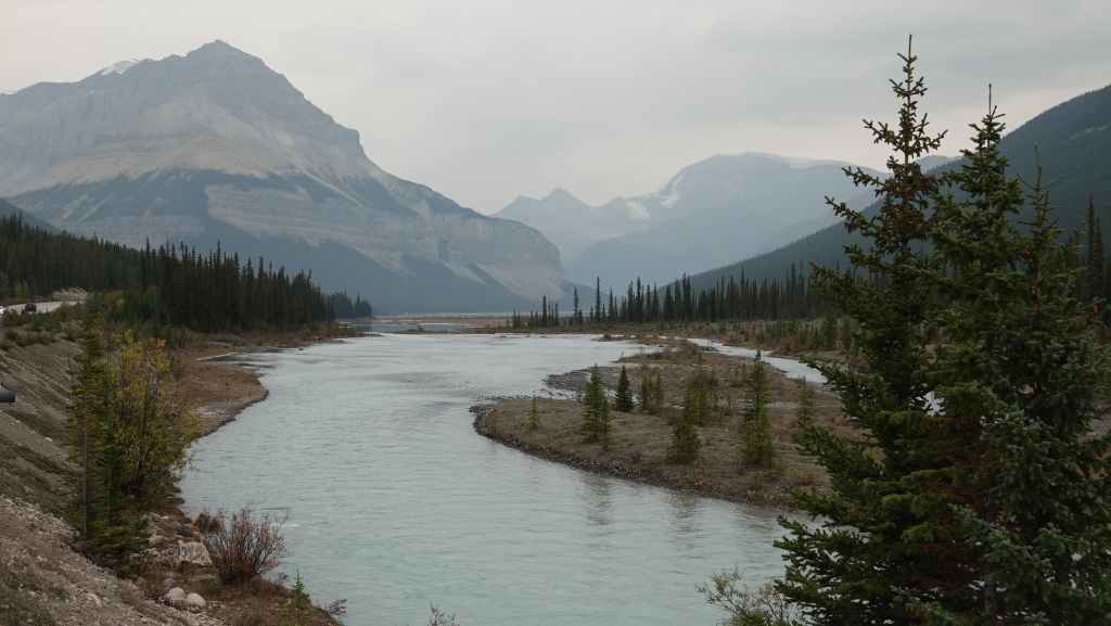 Aujourd’hui le ciel est plutôt menaçant c’est bien dommage car les paysages promettent d’être somptueux. On part plein sud par la « route des glaciers » ou « promenade des glaciers » qui descend en direction de Banff et son non moins célèbre parc national. Et dès la sortie de Jasper, on a la chance d’observer une harde de wapitis : le mâle et ses femelles. On s’arrête ensuite aux chûtes d’Athabasca.