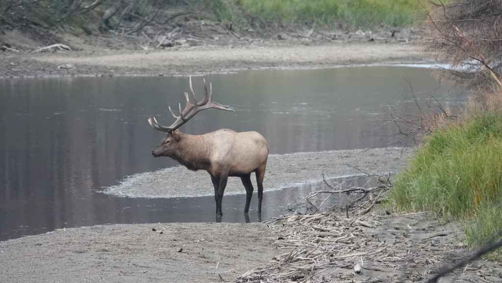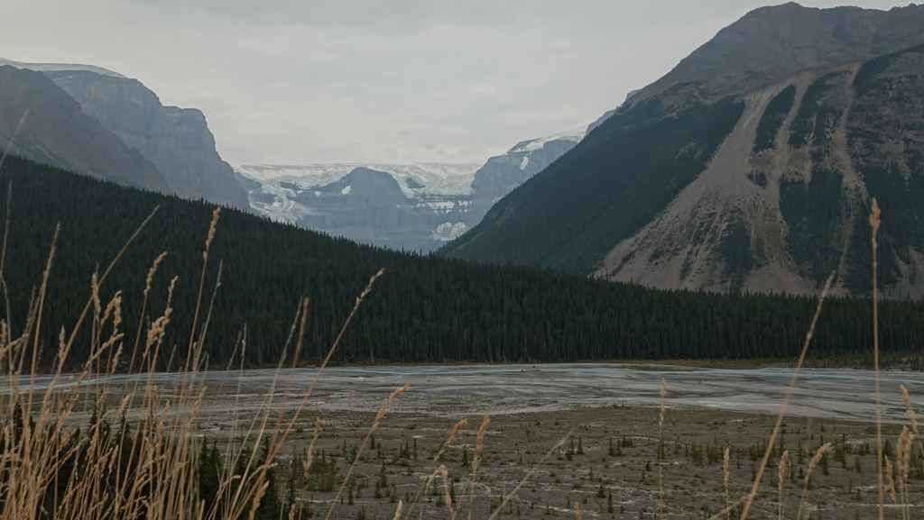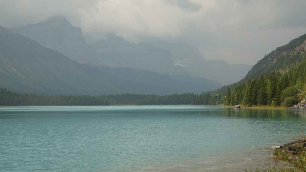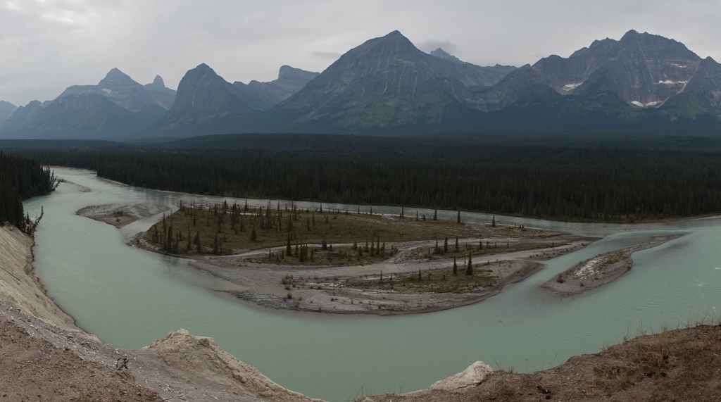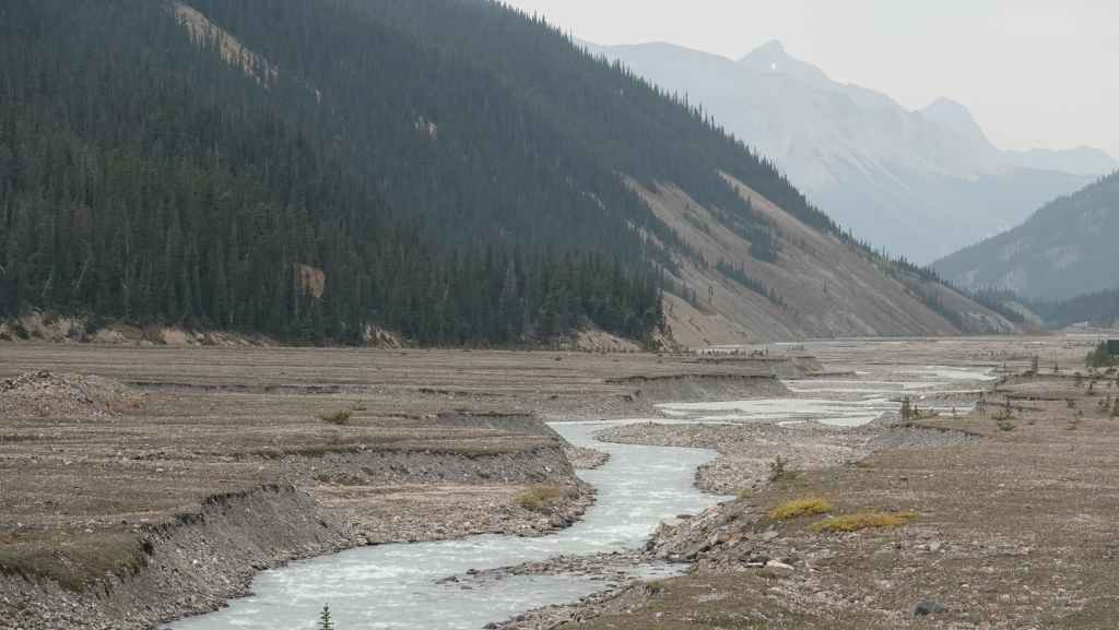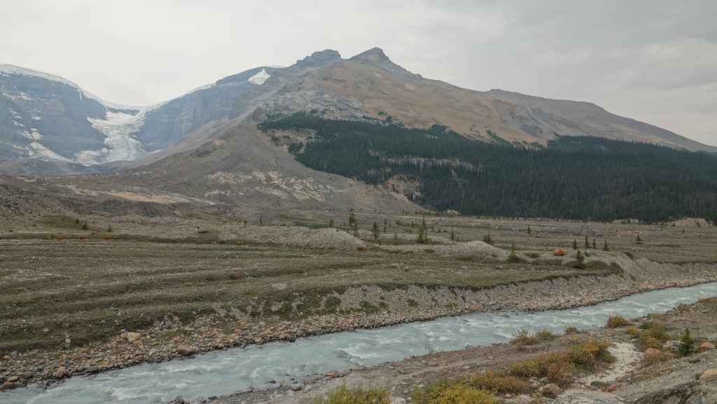 Aujourd’hui le ciel est plutôt menaçant c’est bien dommage car les paysages promettent d’être somptueux. On part plein sud par la « route des glaciers » ou « promenade des glaciers » qui descend en direction de Banff et son non moins célèbre parc national. Et dès la sortie de Jasper, on a la chance d’observer une harde de wapitis : le mâle et ses femelles. On s’arrête ensuite aux chûtes d’Athabasca.