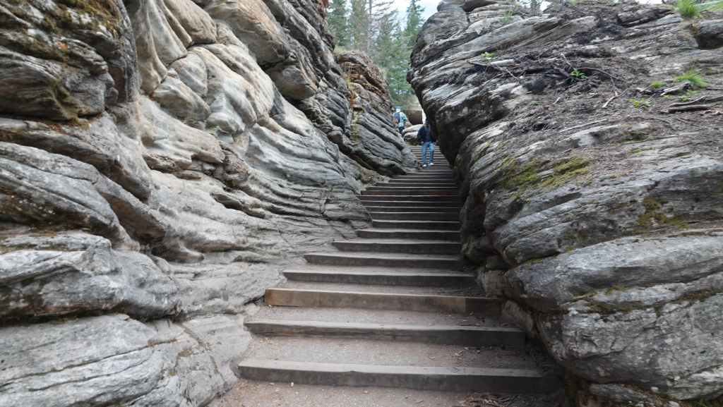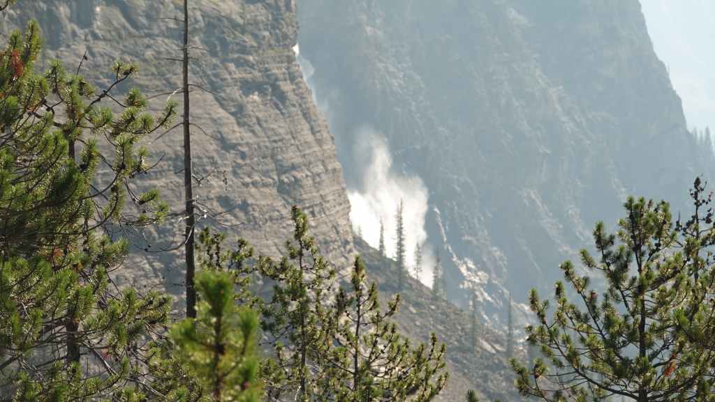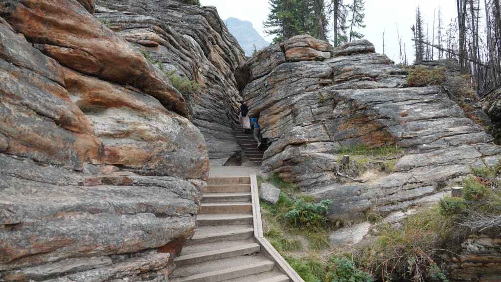 Nous avions pour but d’aller randonner jusqu’au lac du même nom 600 mètres plus haut, mais un gigantesque éboulement complique l’accès au sentier. Du coup, on revient sur nos pas pour nous rendre par un sentier très large, les Laughing Falls (les chutes pleureuses).