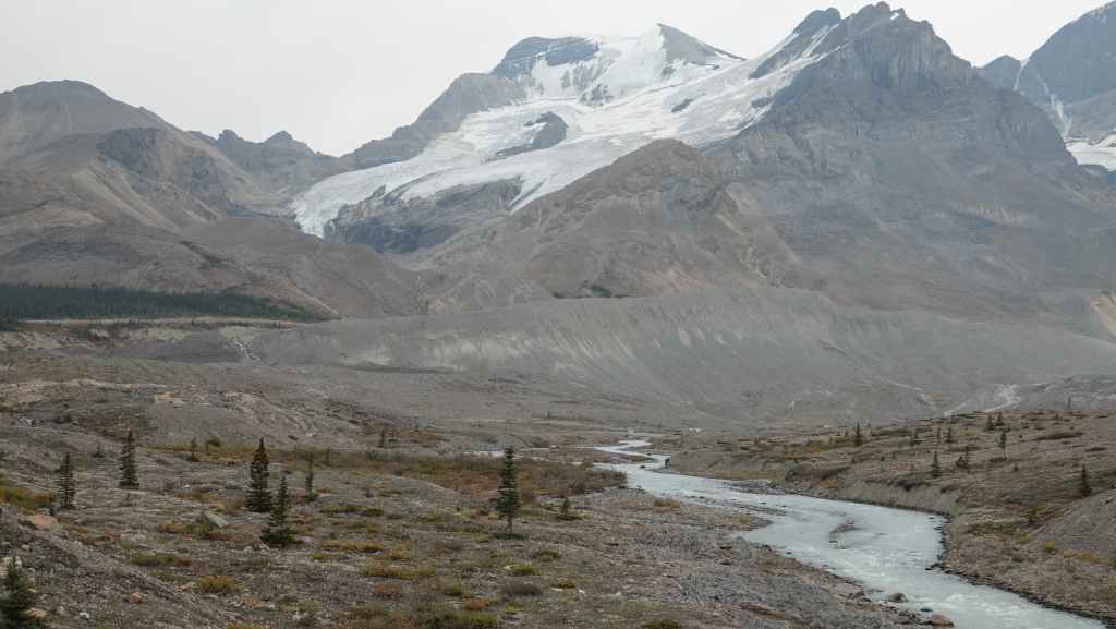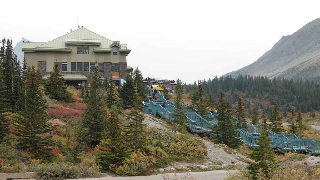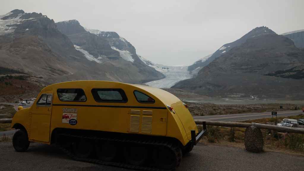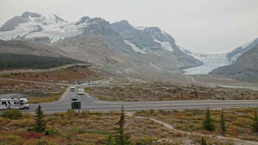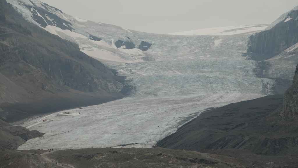 Sur le coup de midi, on arrive au site très touristique de Columbia Icefield (les champs de glace Columbia). On part visiter le centre d’interprétation où l’expo fait l’apologie de l’écologie pour tenter de préserver les glaciers : c’est très louable ! Mais à côté de ça, ils organisent des visites en bus vers et carrément sur le glacier !!! Malgré tout, ce centre est intéressant par ses photographies spectaculaires des Rocheuses Canadiennes.