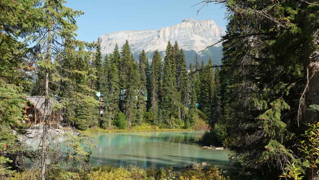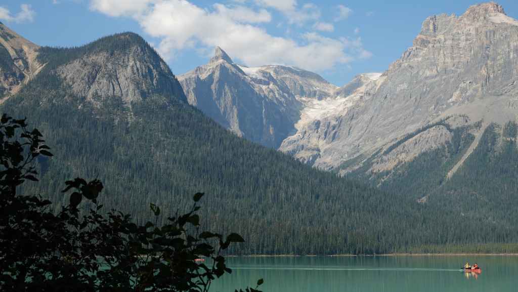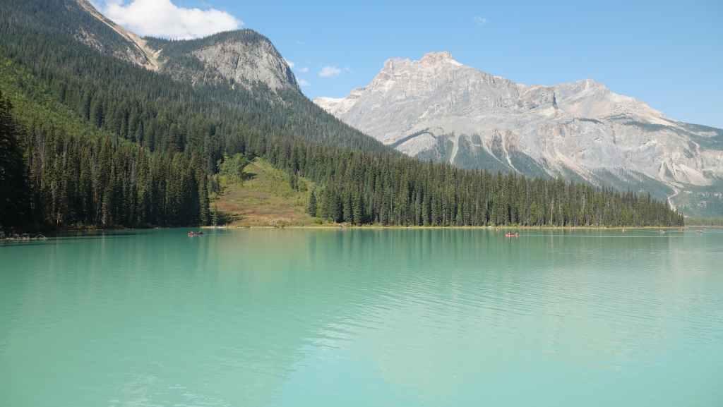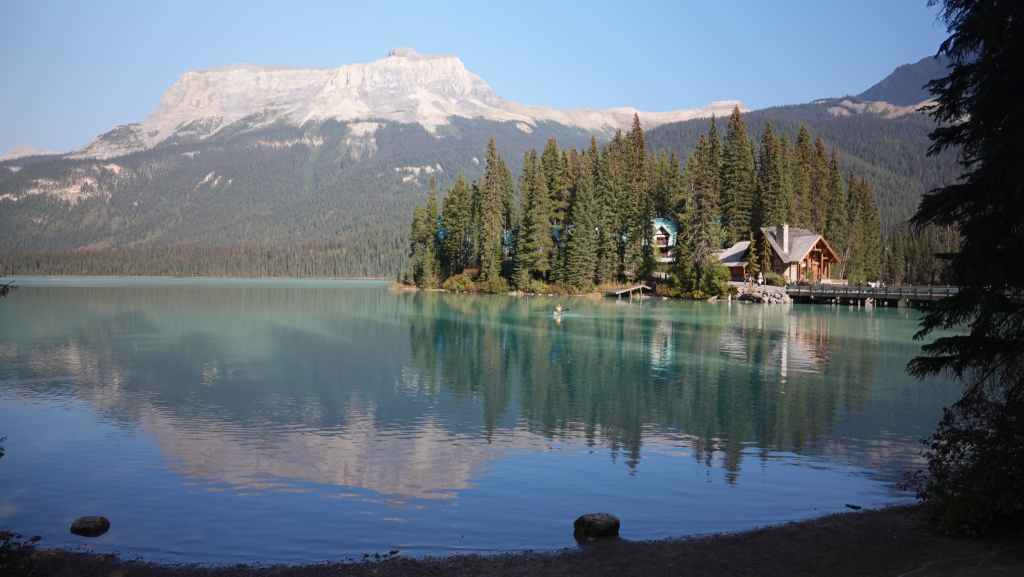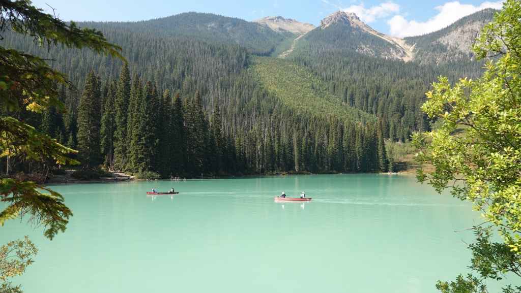 Nous reprenons la voiture pour revenir vers la route 1 en descendant le long de la rivière Yoho. Après Field, nous quittons la route 1 pour rejoindre les parkings du lac Emerald. Nous trouvons difficilement une place le long de la route. Le lieu est vraiment grandiose et le soleil y est surement pour quelque chose… La balade fait le tour du lac. C’est facile et tout plat, mais vaut la peine d’être parcouru.