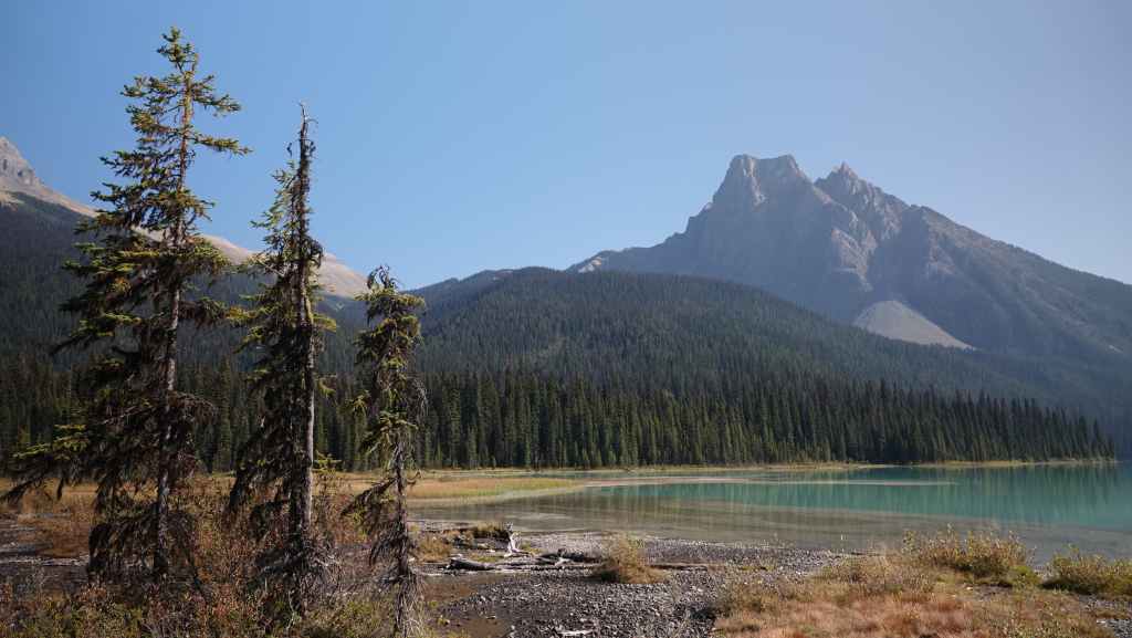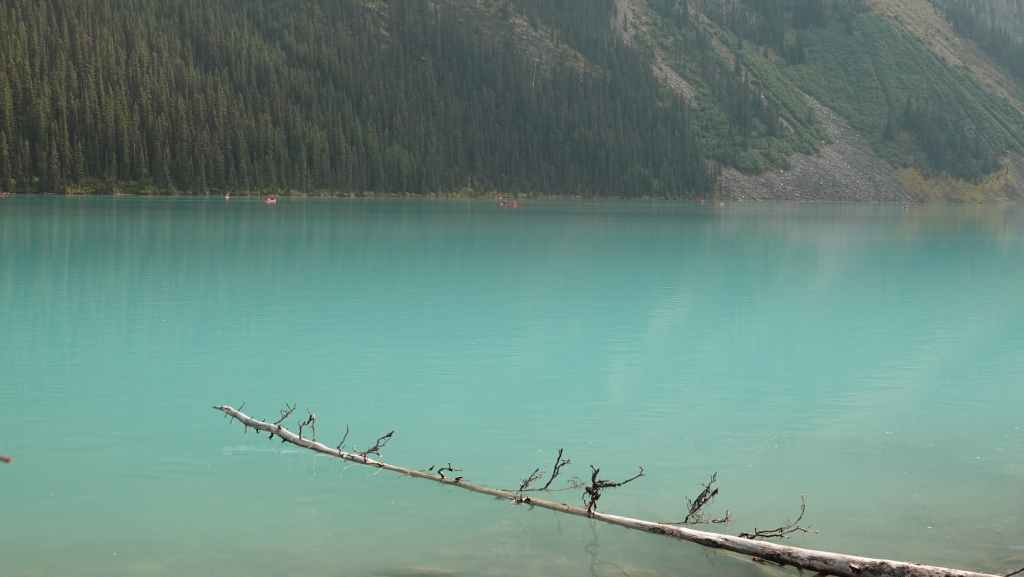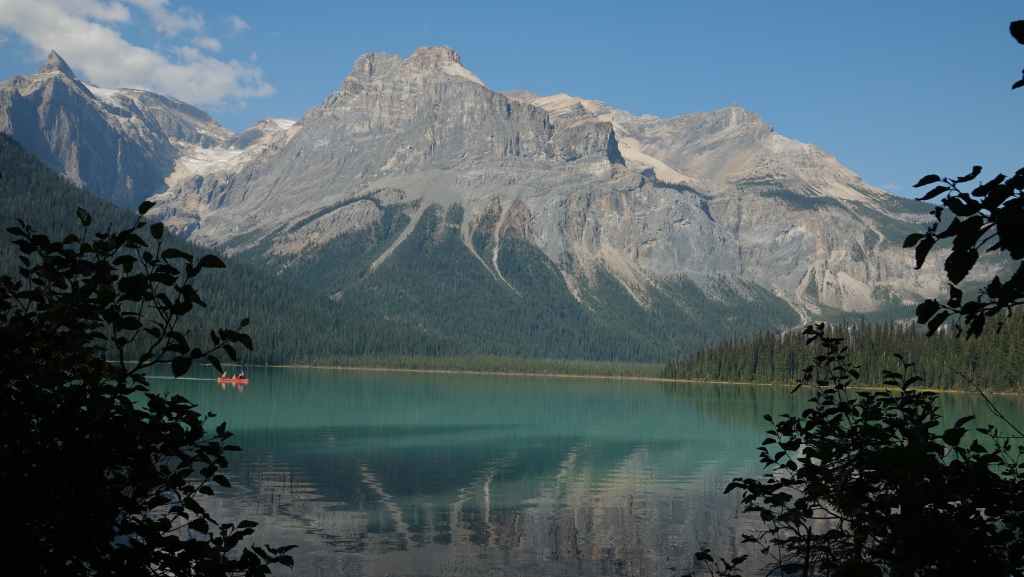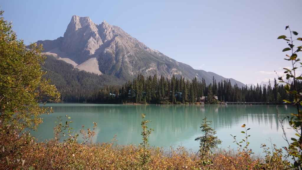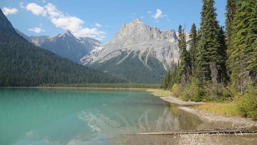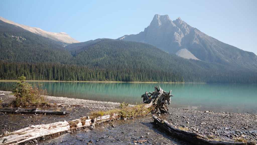 Nous reprenons la voiture pour revenir vers la route 1 en descendant le long de la rivière Yoho. Après Field, nous quittons la route 1 pour rejoindre les parkings du lac Emerald. Nous trouvons difficilement une place le long de la route. Le lieu est vraiment grandiose et le soleil y est surement pour quelque chose… La balade fait le tour du lac. C’est facile et tout plat, mais vaut la peine d’être parcouru.