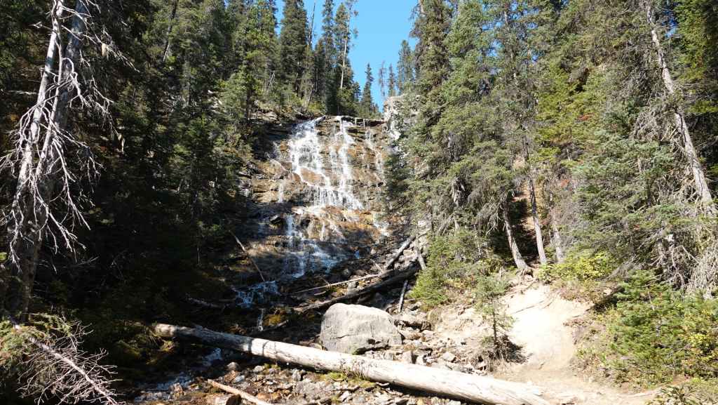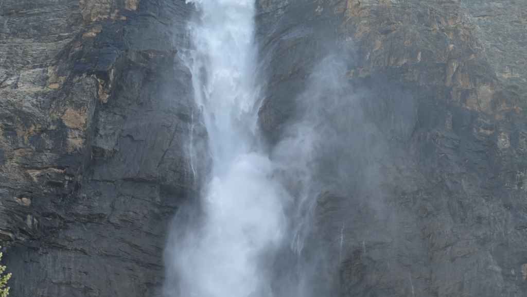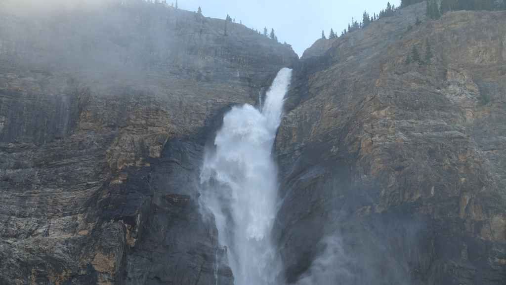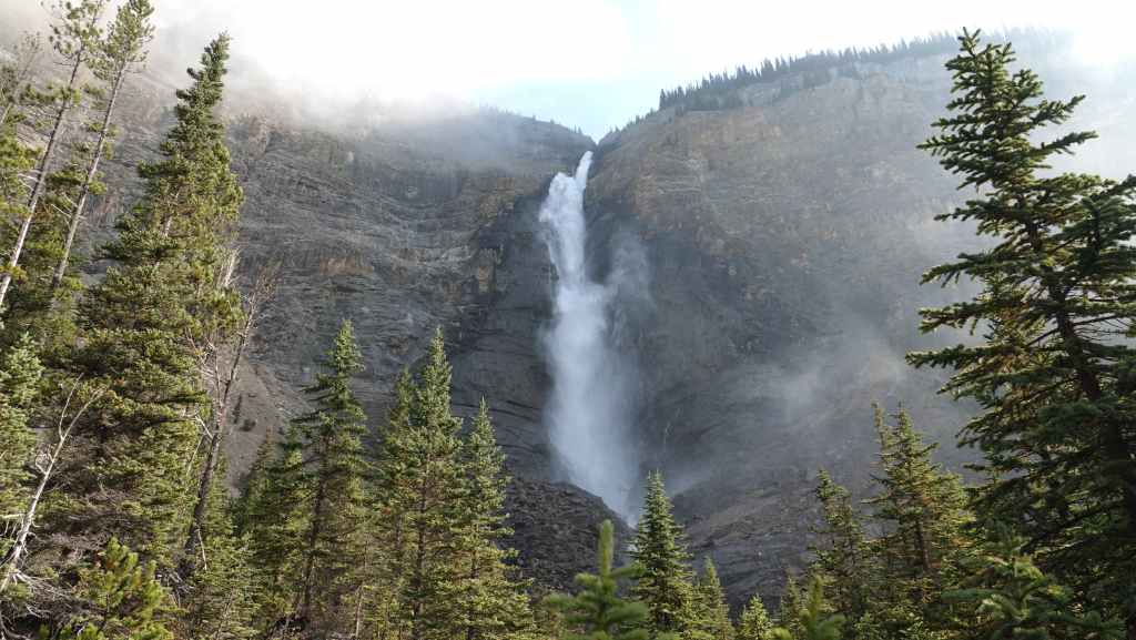 On commence par nous rendre vers les chutes Takakkaw. Les chutes ont une hauteur totale de 373 mètres, ce qui en fait la deuxième plus haute cascade du Canada. La chute principale de la cascade a une hauteur de 254 mètres.