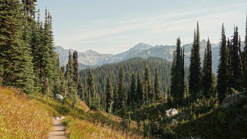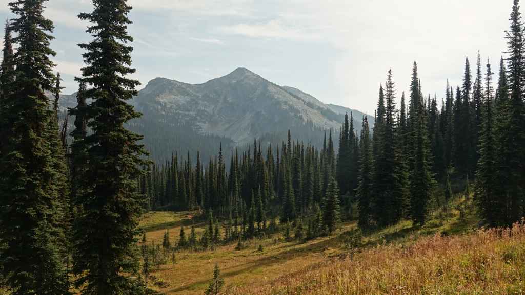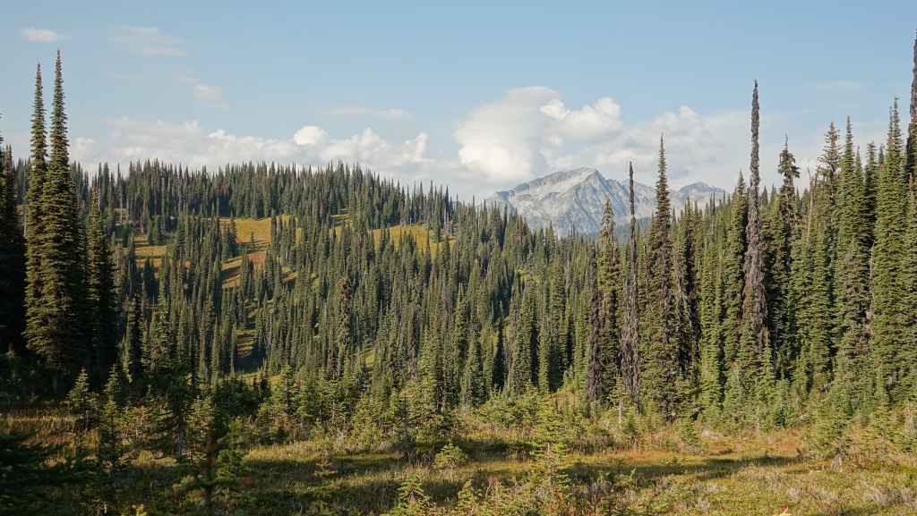 Nous mettons tout de même 1h30 pour rejoindre le parking du Mont Revelstoke et comme nous sommes dans le Parc National du même nom, un poste de contrôle barre la route au pied de la montagne. On discute un petit coup avec le garde qui parle un bon français et on grimpe, tout en s’arrêtant aux point de vue sur la ville.