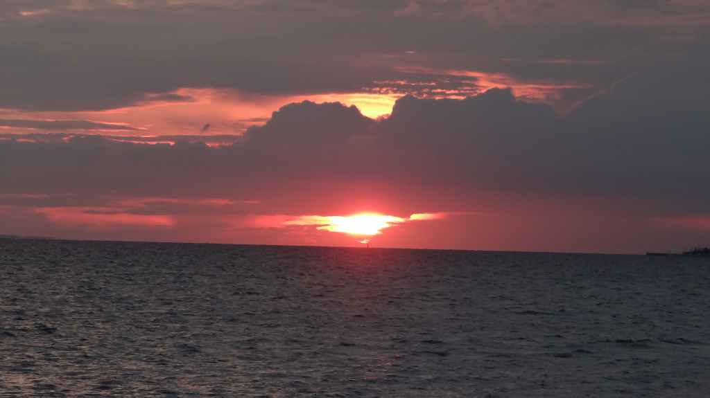 Repos bien mérité avec un joli coucher de soleil. Pas de moustique, mais des petits moucherons qui nous chatouillent les chevilles. La nuit en bord de mer sera excellente.