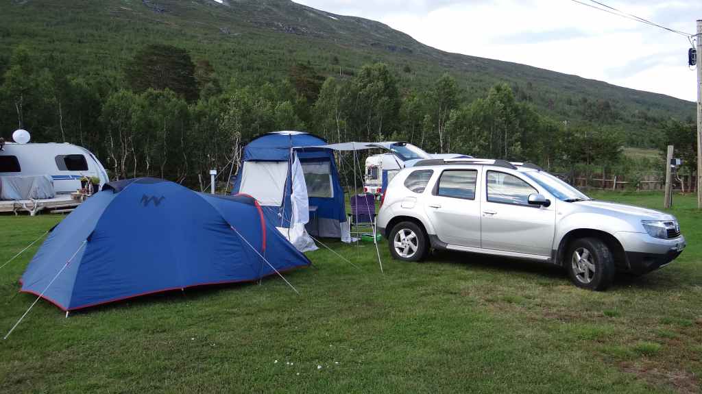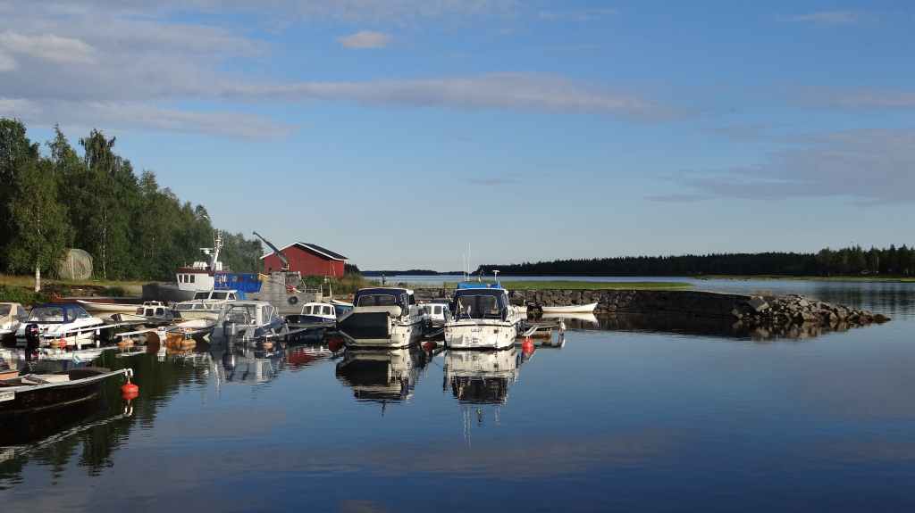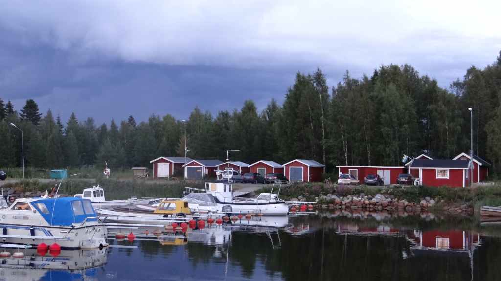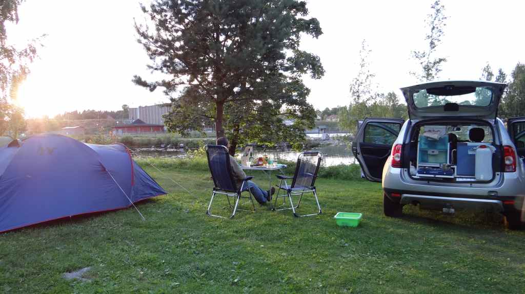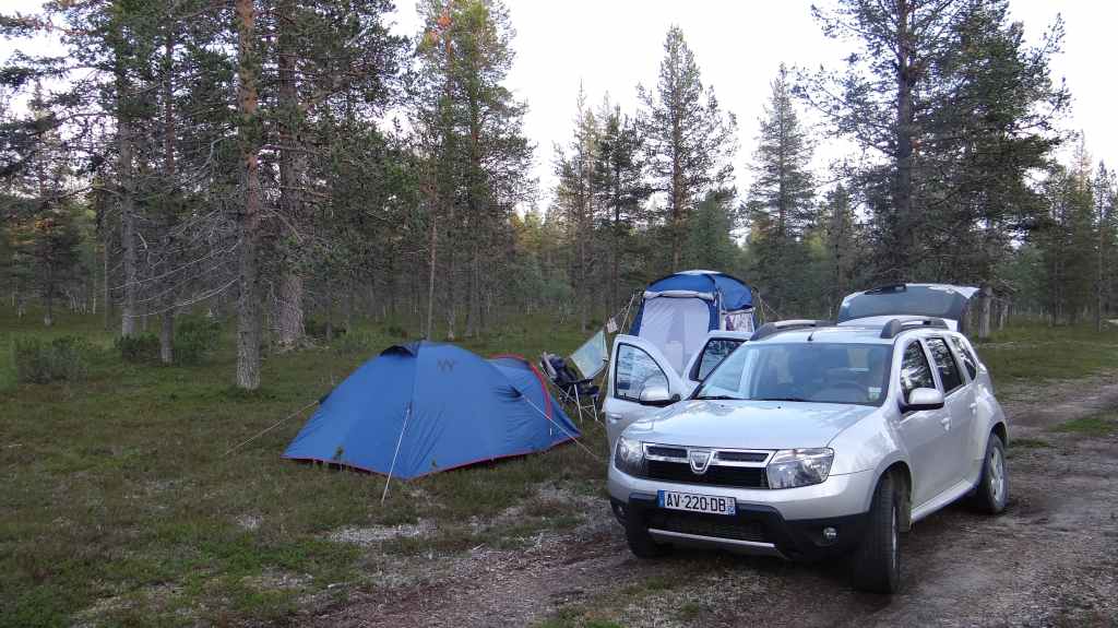 Départ matinal à 7h00. Rien de particulier sur cette étape, si ce n’est une vitesse de croisière assez élevée sur des routes très roulantes. Il nous faut arriver près de la frontière finlandaise ce soir ! On souhaite dormir en sauvage mais on tourne pendant 1 heure sans rien trouver, alors à 18h00, au détour d’un petit port, Sylvie repère une plate-bande de pelouse bien tondue (spécialité des suédois) au bord des bateaux. Après une demande en anglais à un monsieur, qui lui-même passe un coup de téléphone au responsable du port, nous installons notre tente dans ce petit coin de paradis. On rend également service puisque notre présence ainsi que celle d’un gardien de nuit peut empêcher des vols de bateaux ou de moteurs, et ceci, dans un pays réputé pour sa sécurité ! Le lendemain matin, un vieux monsieur vient taper la discute et est très intrigué par notre Duster. En effet, Dacia est totalement inconnu en Suède, et notre voiture lui plait. On rencontre sur les routes 50% de Volvo, 20% d’Audi, 20% de Mercedes et de BMW et les 10% restant reviennent au reste des marques de la planète !