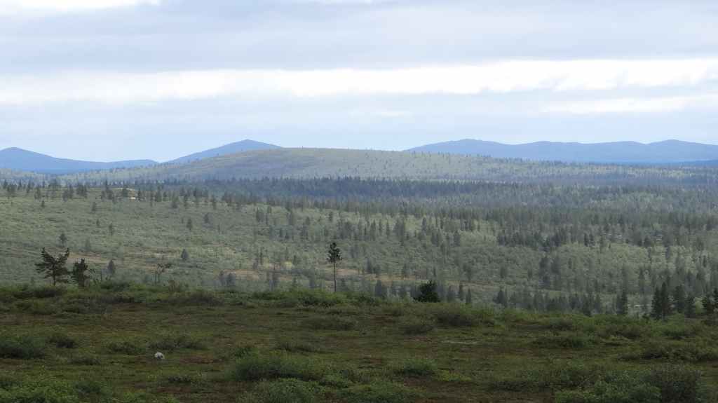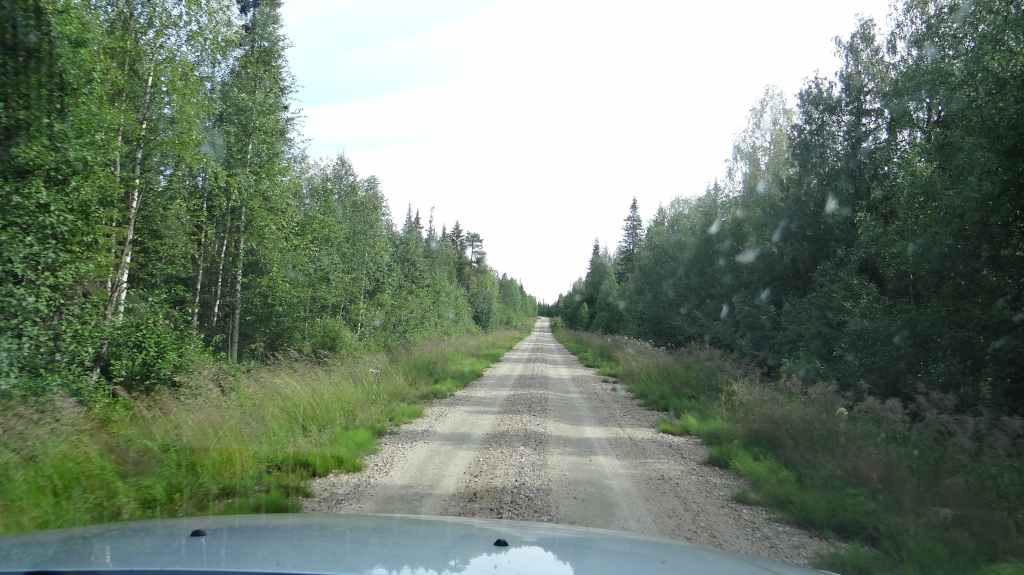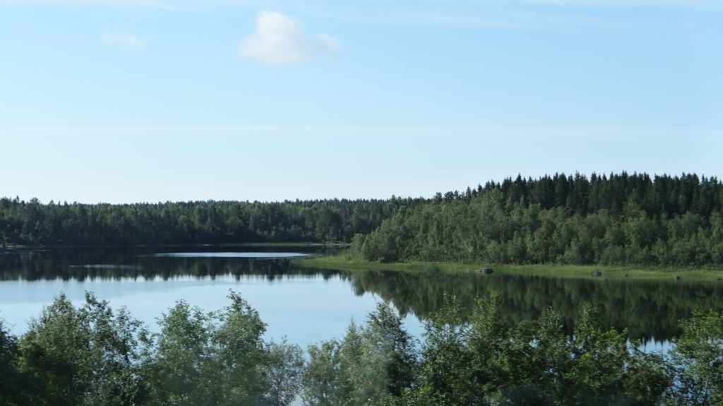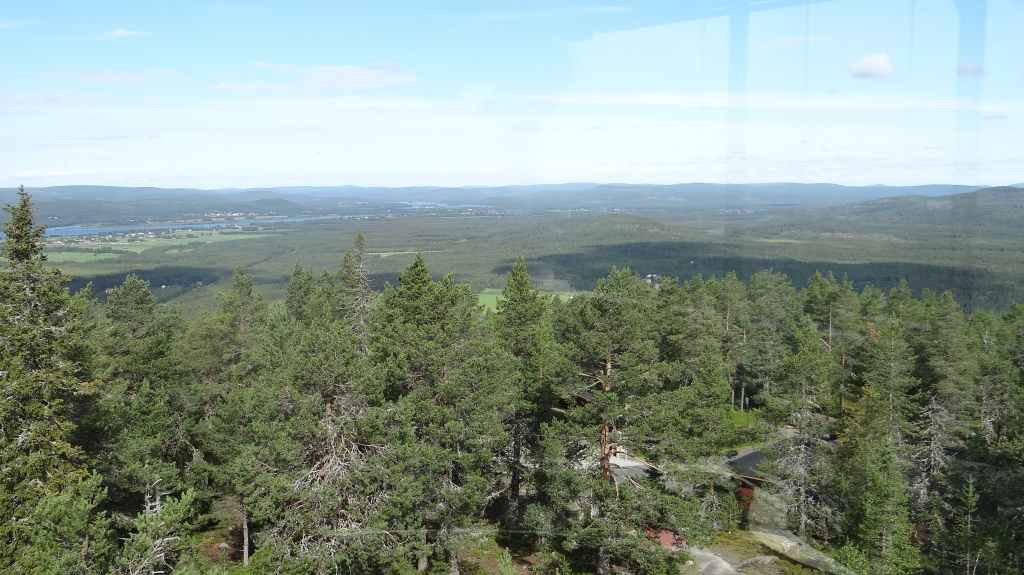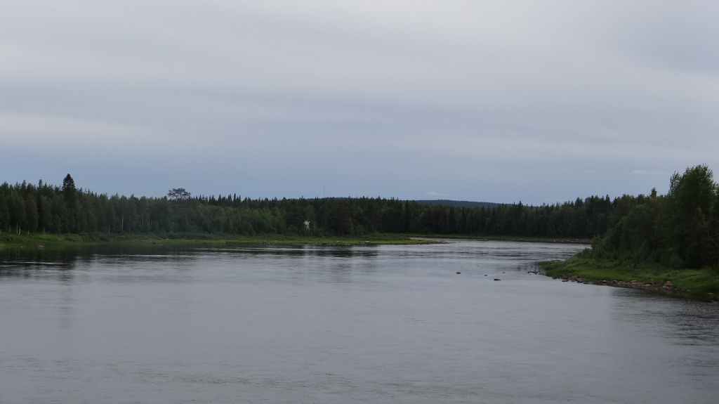 C’est aujourd’hui l’occasion d’utiliser notre 4×4 sur des pistes pour continuer notre progression vers le nord. Mais, même si les pistes sont bonnes et notre carte précise, notre progression est hésitante et lente. Nous passons le cercle polaire sans même un panneau… Faut dire que nous ne sommes pas sur une route touristique ! Les panneaux ne sont pas légion et le temps passe vite, alors nous décidons de reprendre le goudron. Après avoir traversé le Tornionjoki, qui sert de frontière avec la Finlande, nous faisons un petit arrêt à un belvédère. Une tour, libre d’accès nous permet une vue à 360° sur les forêts et lacs du secteur.