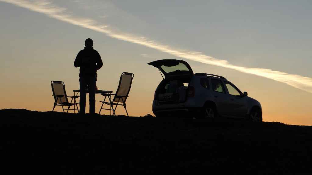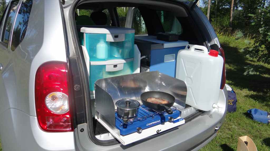 Pour réaliser ce voyage, nous avons utilisé notre véhicule Dacia Duster 1.5 Dci 4×4 110 cv (environ 60000 km) aménagé avec une « cuisine intégrée » à l’arrière (plaque gaz 2 feux sur tiroir avec pare-vent, petit meuble 2 tiroirs pour le rangement et 1 frigo trimixte). Pour dormir, 1 tente dôme et 2 matelas pneumatiques et son gonfleur électrique. Pour manger à l’abri des moustiques et de la pluie, nous avons fait l’achat d’un « abri chef ».