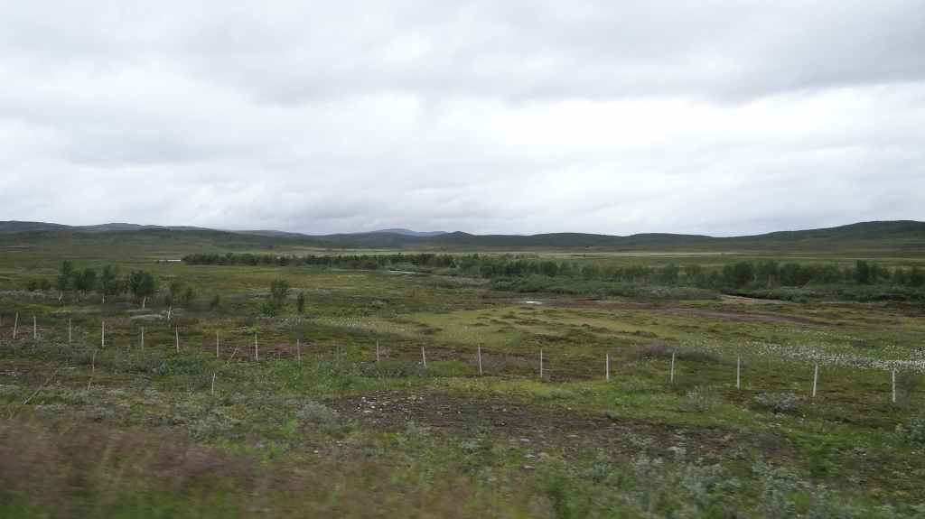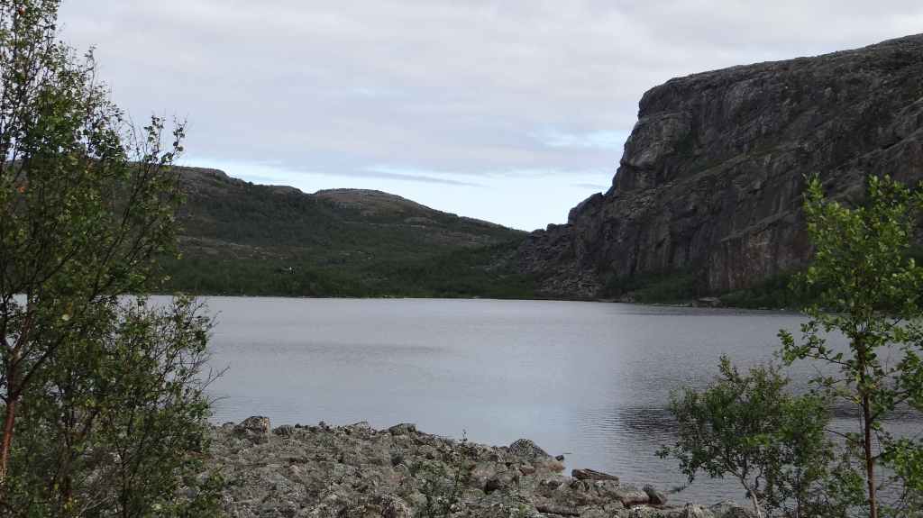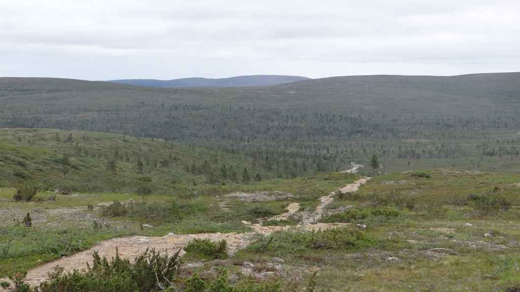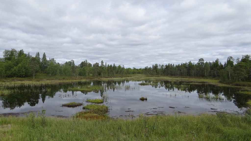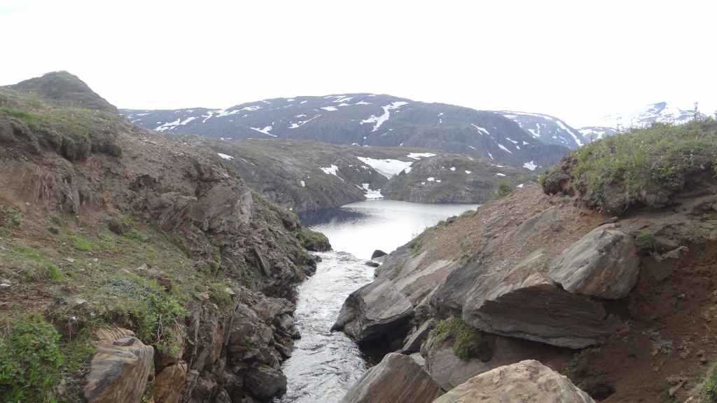Lever matinal pour rejoindre le dessus du barrage de Storglomvassdamm. C’est de là que part notre rando. Le ciel est couvert. Nous partons donc pour une douzaine de kilomètres. Quelques moustiques commencent à nous agacer mais nous avons oublié notre flacon d’Autan.