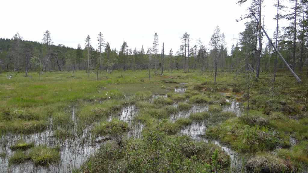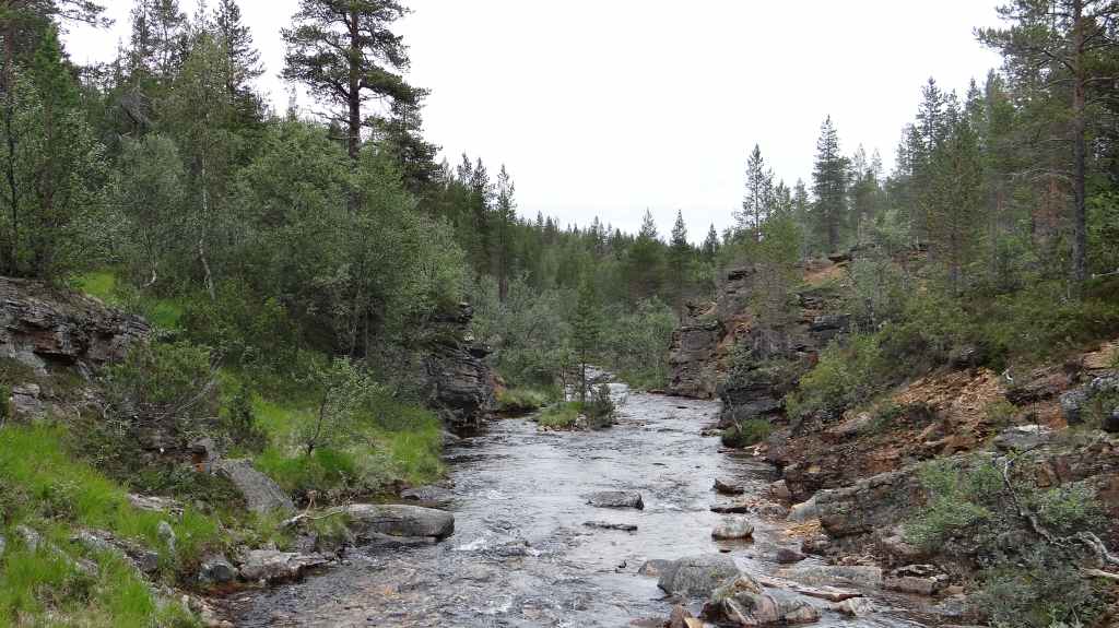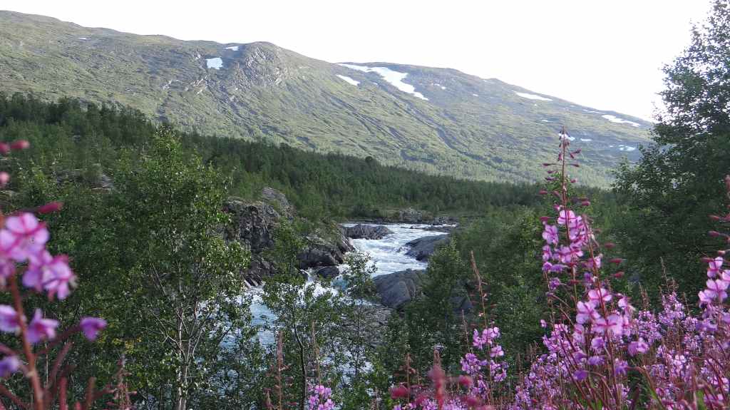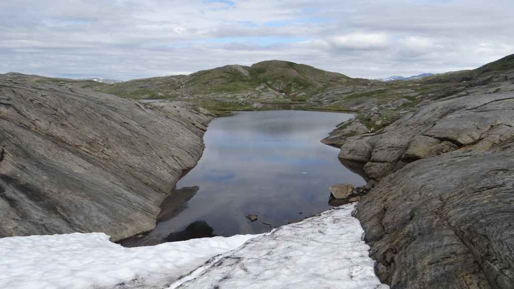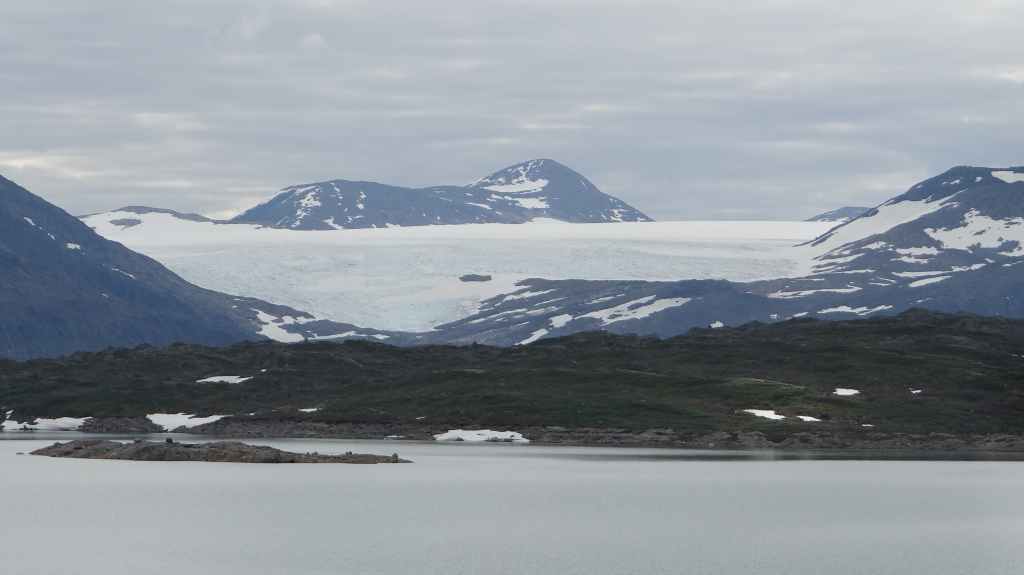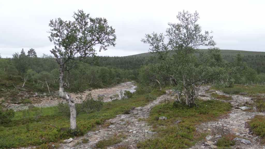 Lever matinal pour rejoindre le dessus du barrage de Storglomvassdamm. C’est de là que part notre rando. Le ciel est couvert. Nous partons donc pour une douzaine de kilomètres. Quelques moustiques commencent à nous agacer mais nous avons oublié notre flacon d’Autan.