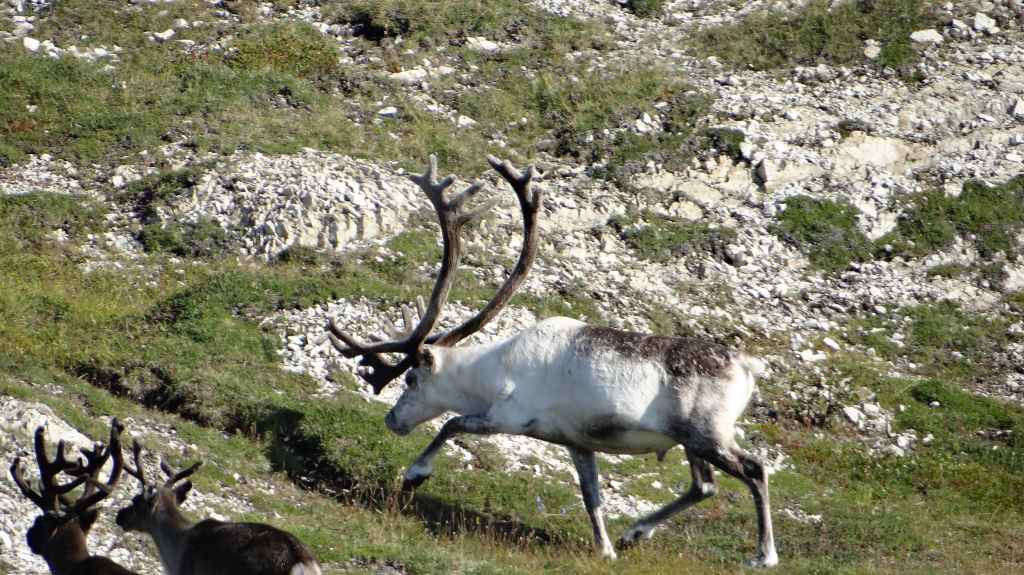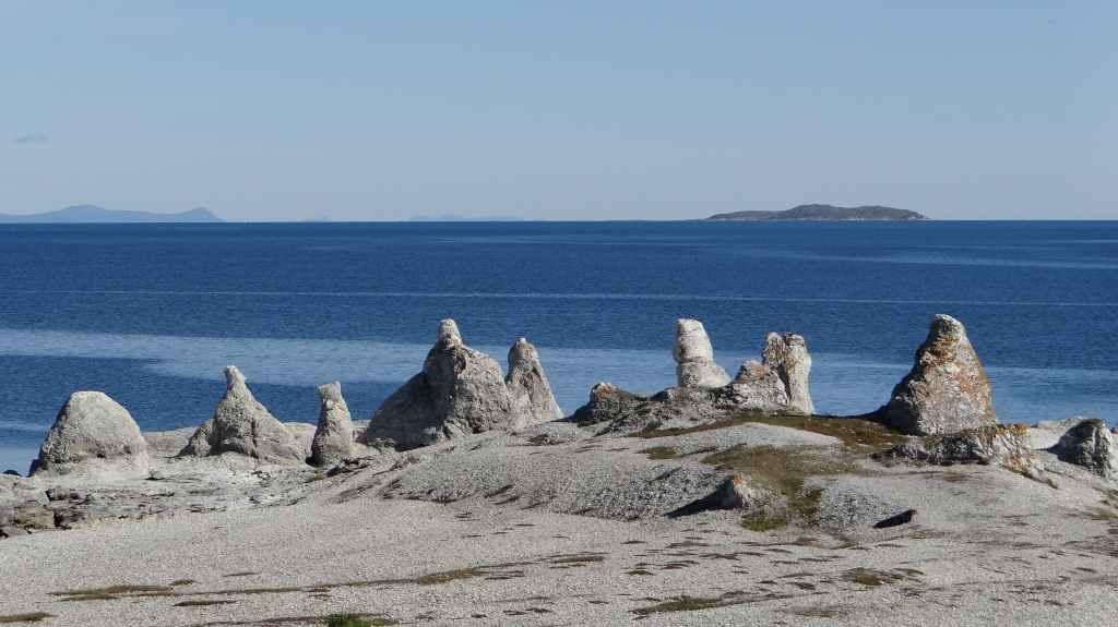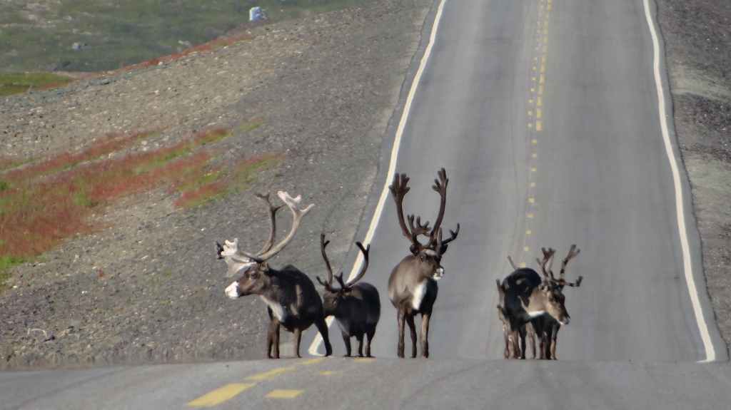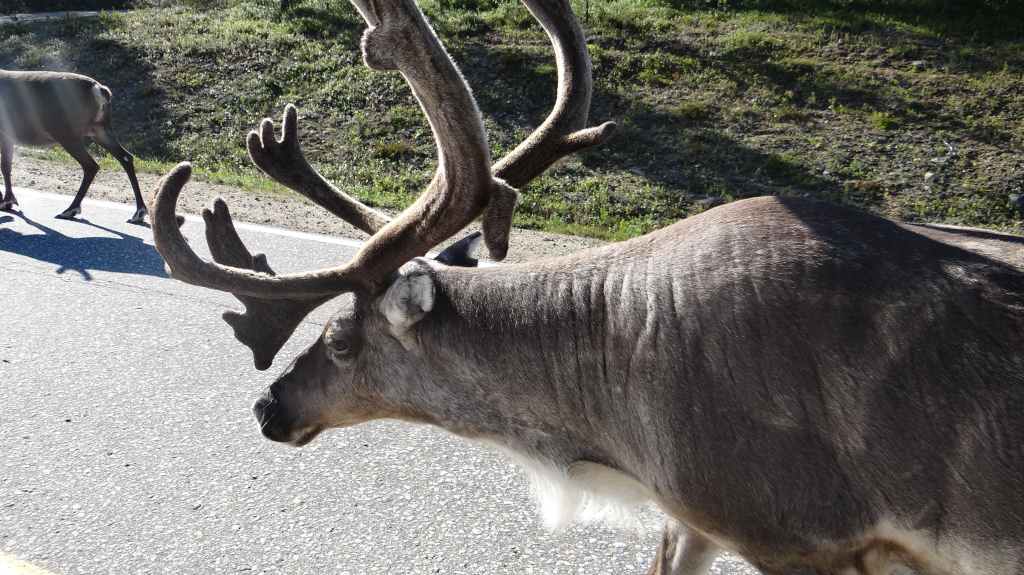 Malgré tout, nous faisons un petit détour vers Trollholmsun, petite presqu’île où sont resté figés des trolls qui ne sont pas rentrés avant le coucher du soleil… selon la légende ! Magnifique endroit avec des rennes en bord de mer : insolite. On reprend la route et l’on s’arrête à quelques kilomètres avant le parking très onéreux du touristique Cap Nord.