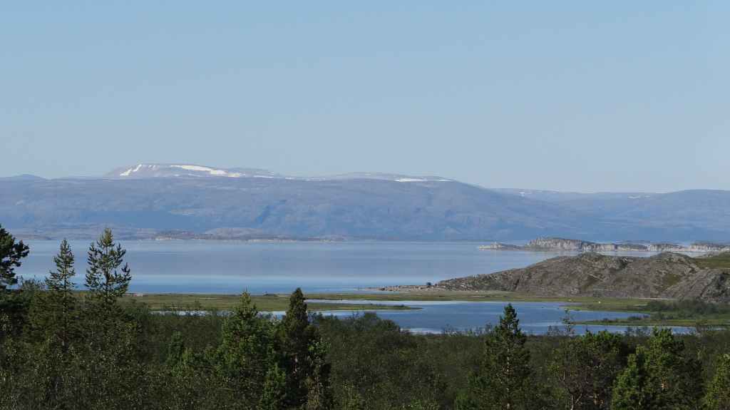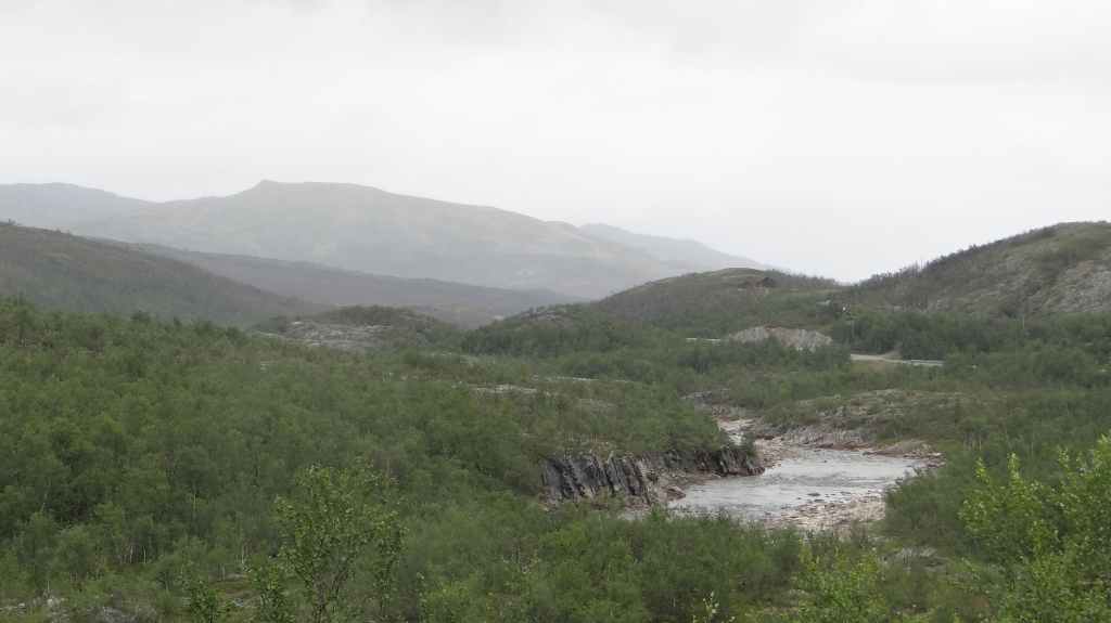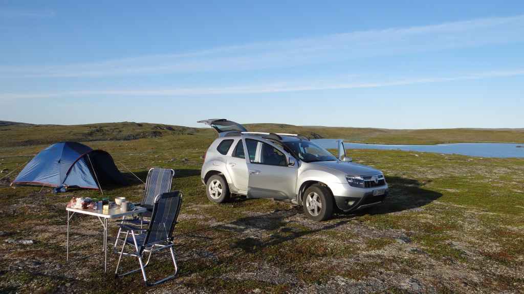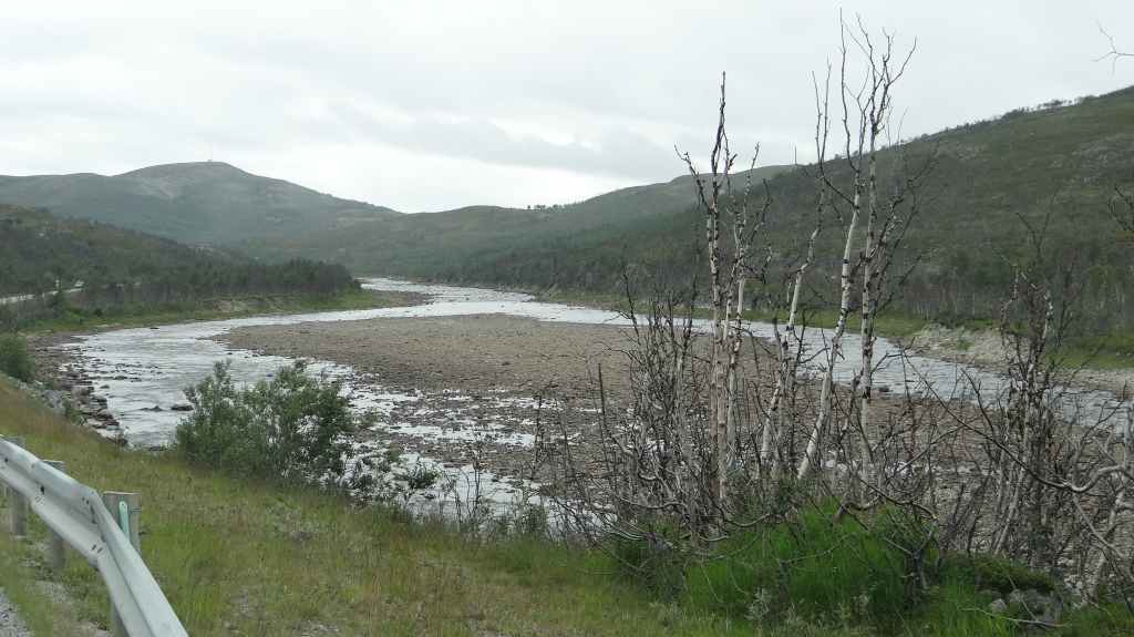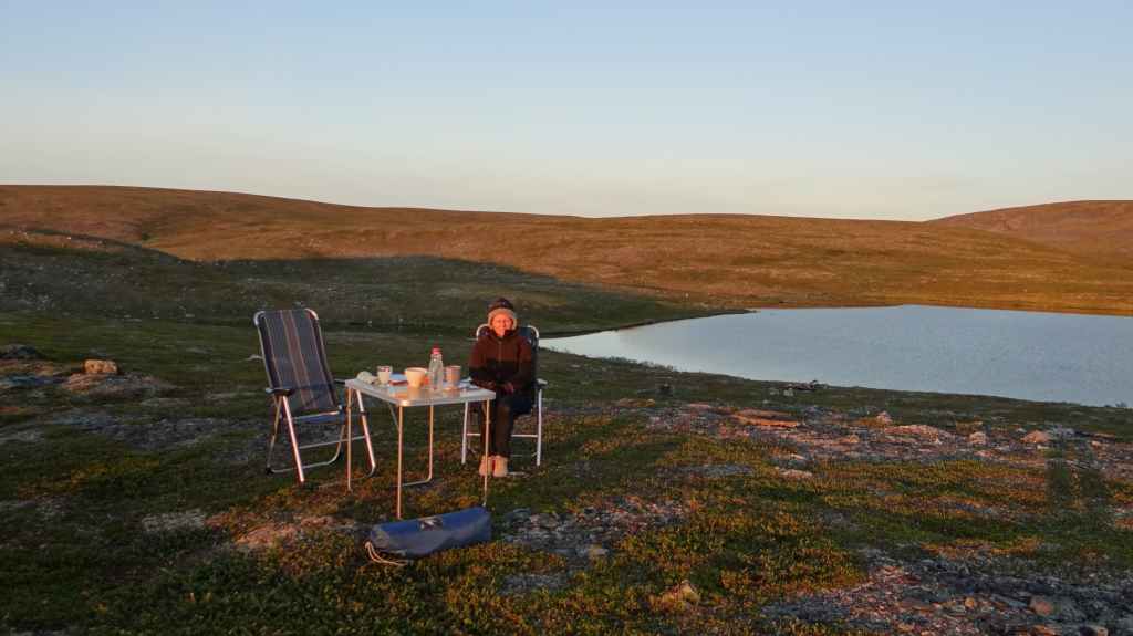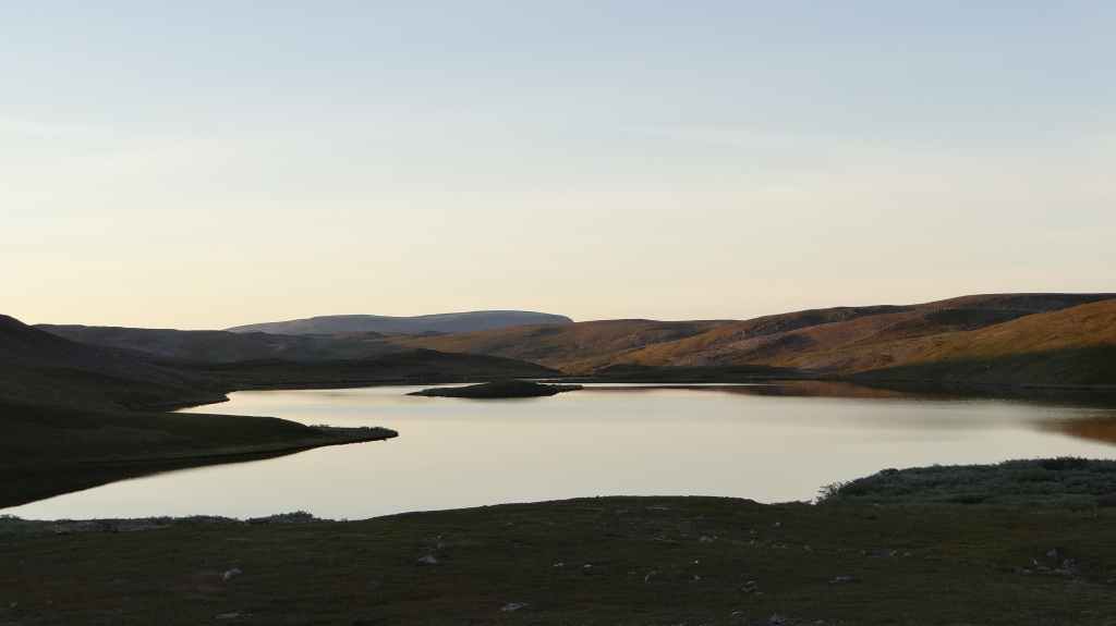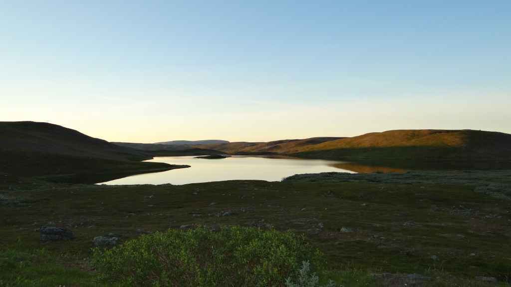 On va même jusqu’à mi-cuisse mais pas longtemps ! L’eau a la température d’un torrent glaciaire, c’est-à-dire excessivement froide. Mais il est temps de repartir vers Kirkenes où l’on change des euros en couronnes norvégiennes (NOK). Comme nous voulons dormir en sauvage ce soir, nous roulons, roulons jusqu’à trouver l’endroit idéal. Après environ 3 heures de routes sinueuses, nous plantons la tente un peu à l’écart de la route, à un col. Le ciel est clair et la nuit inexistante.
