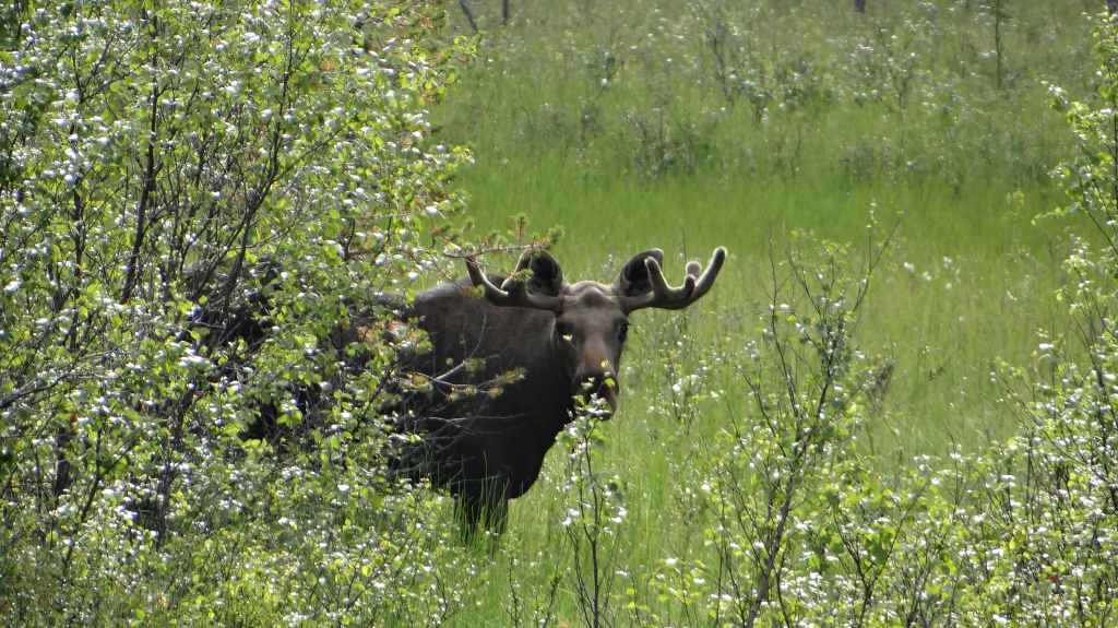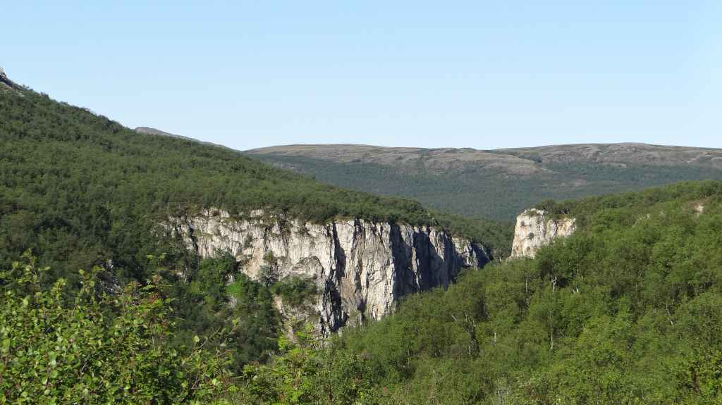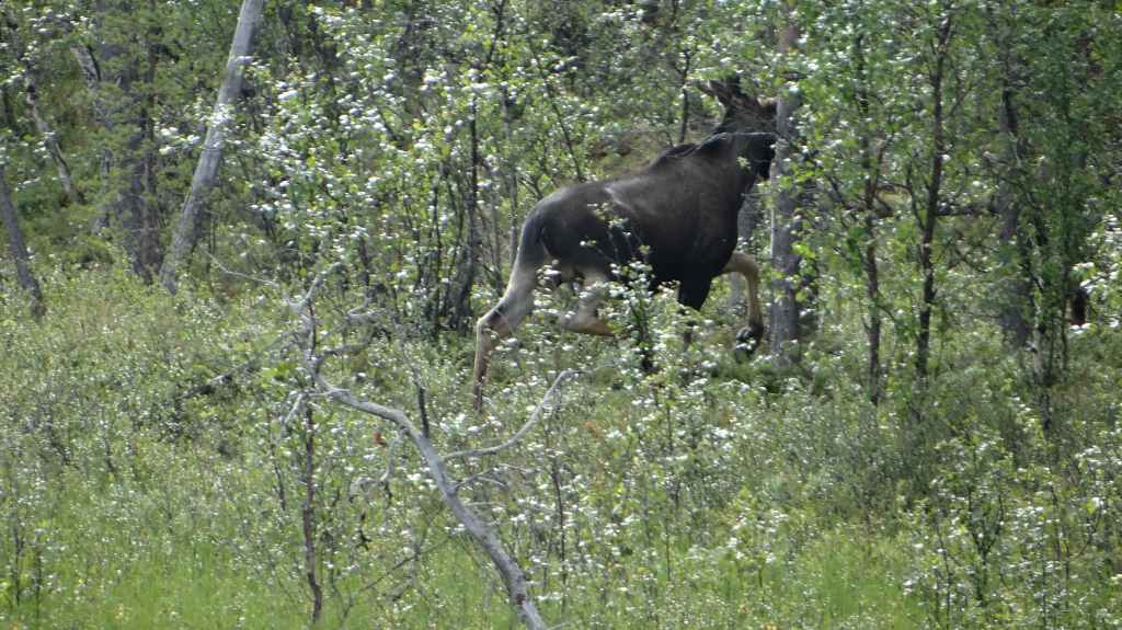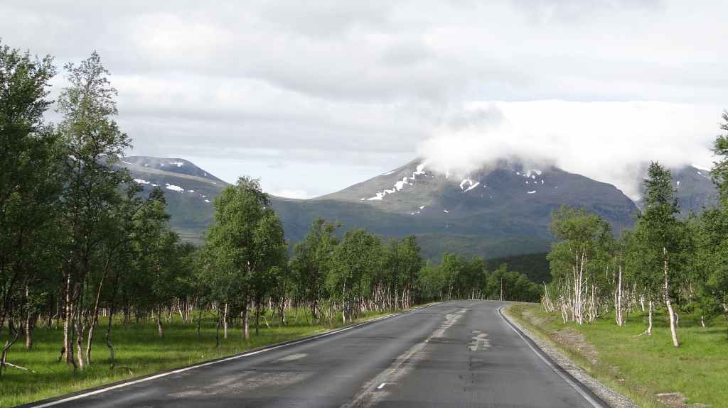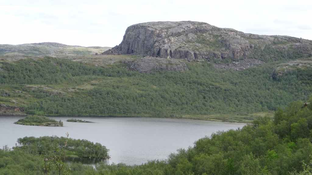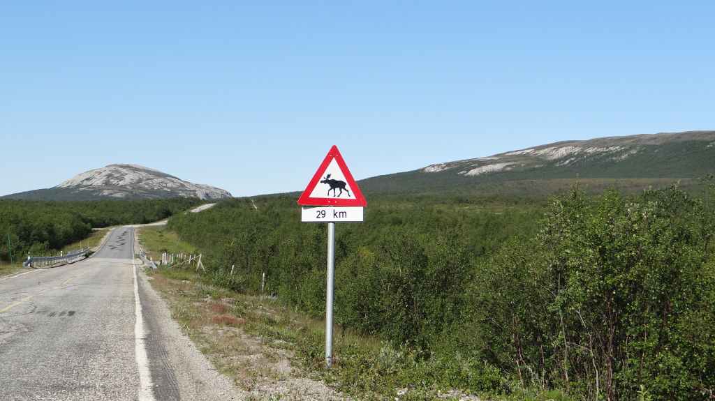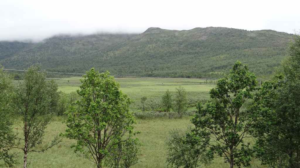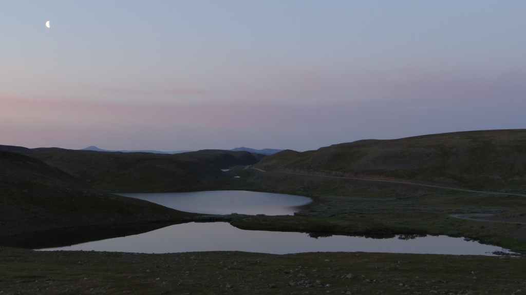 On va même jusqu’à mi-cuisse mais pas longtemps ! L’eau a la température d’un torrent glaciaire, c’est-à-dire excessivement froide. Mais il est temps de repartir vers Kirkenes où l’on change des euros en couronnes norvégiennes (NOK). Comme nous voulons dormir en sauvage ce soir, nous roulons, roulons jusqu’à trouver l’endroit idéal. Après environ 3 heures de routes sinueuses, nous plantons la tente un peu à l’écart de la route, à un col. Le ciel est clair et la nuit inexistante.